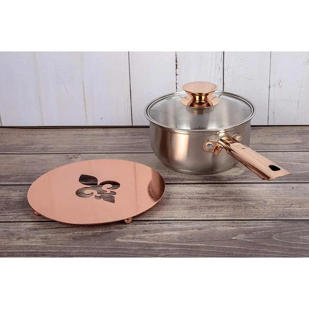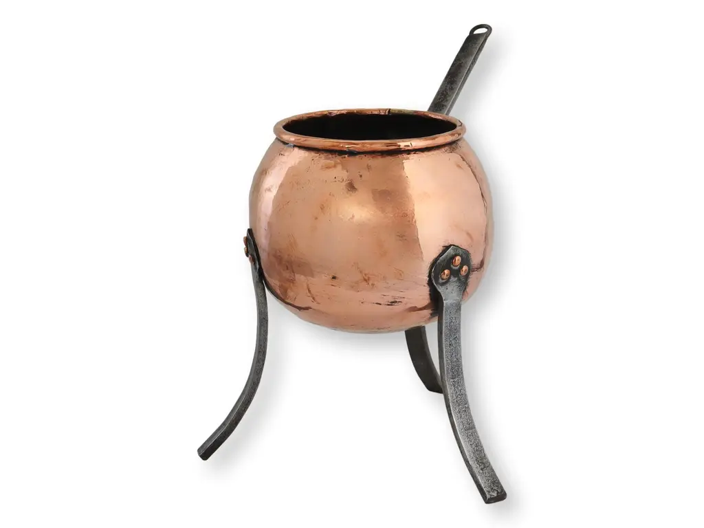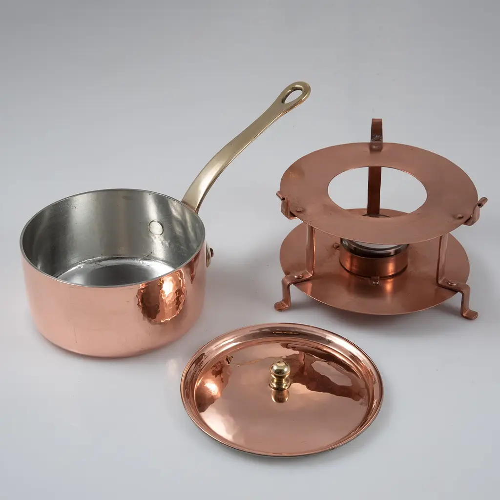 This elegant set handcrafted of pure copper will be a precious addition to traditional cookware collections. Equipped with a lid and a pedestal for the placement of a tealight candle (which is included) for heating up the small pot resting above, the pot features a slender brass cast handle and a coating of pure tin on the interior. It can be used to serve butter or hot sauces directly on the table. Ask the Concierge for other size options.