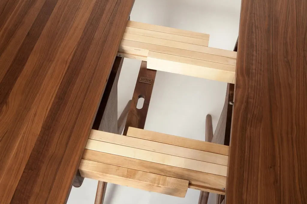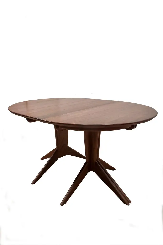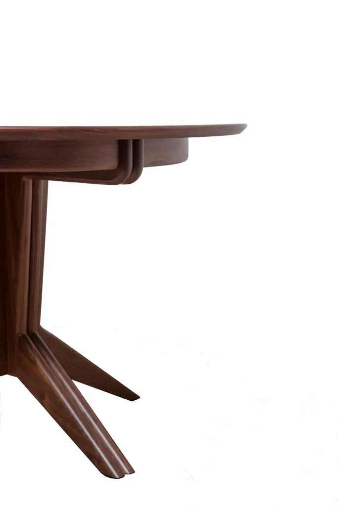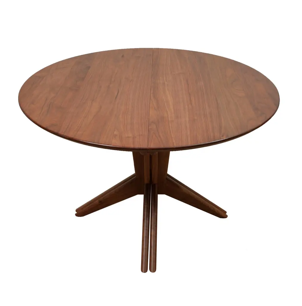 Originally designed by Mel Smilow in 1956 and officially reintroduced in 2014, this solid walnut extension dining table with pedestal base is beautifully versatile. The simplicity of the table’s base splits and expands to accommodate 1-3 leaves. The tables solid surface highlights the natural beauty of the wood, while the more intricate base show’s off an incredible attention to functional detail. Made in America since 1949 and made to last a lifetime, Smilow® Furniture defines: Enduring Modern Classics.Dimensions: 48.0" dia 30.0"h with three 18" extension leavesCustomizations possible, also available with no or less leaves.Smilow Design is a third generation family-owned design company, continuing a legacy of producing Mel Smilow's fine and timeless designs that are equally at home in modern classic residential environments and urban industrial spaces.