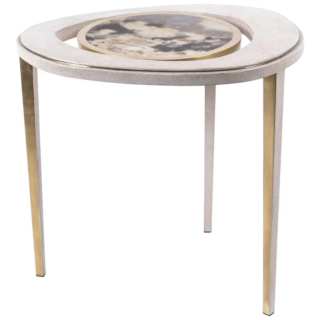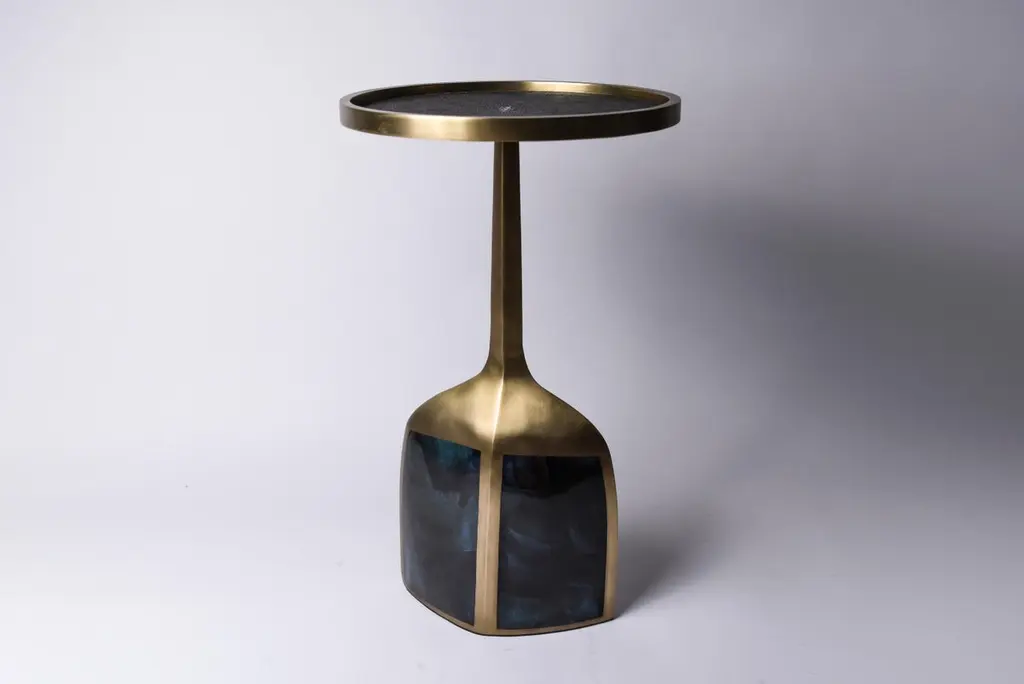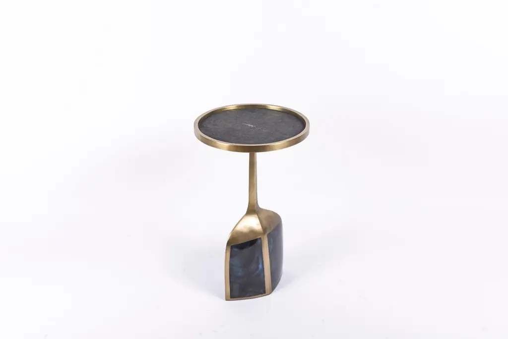 The Paris based label has distinguished themselves since their launch, with their iconic use of shagreen mixed with brass and other exotic materials. All furniture is handcrafted by skilled artisans, ultimately making each piece unique, designed in Paris and produced in the Philippines.The pedestal side large is the perfect end table, that is easily adaptable in any space and due to its lightweight nature easy to move around. The large size is inlaid on the top surface with coal black shagreen, the bottom part a mixture of blue pen shell and bronze patina brass. Complete this piece with the small size to create a nesting set, see images at end of slide of other finish options and nesting options. Custom color/sizing available on request.The dimensions of this table are35 x 35 x 60 cm / 13.75 x 13.75 x 23.5"All R&Y Augousti pieces are handmade by artisans, ultimately making each piece unique. Custom color or sizing available on request. Wipe clean with soft dry cloth.Acclaimed design duo Ria & Yiouri Augousti have established themselves since the 1990s as pioneers of modern-vintage style through their luxurious Art Deco inspired collections.The Paris based label has distinguished themselves since their launch, with their iconic use of shagreen mixed with brass and other exotic materials. All furniture is handcrafted by skilled artisans, ultimately making each piece unique. All shagreen-covered items should be kept out of direct sunlight, color variants may occur on the stingray and other exotic finishes, but this showcases the Parisian label's commitment to creating authentic luxurious products using natural components.For all pieces inlaid with stone and semi-precious stones, due to the natural quality of the material color tonality and pattern placement may differ slightly per piece.