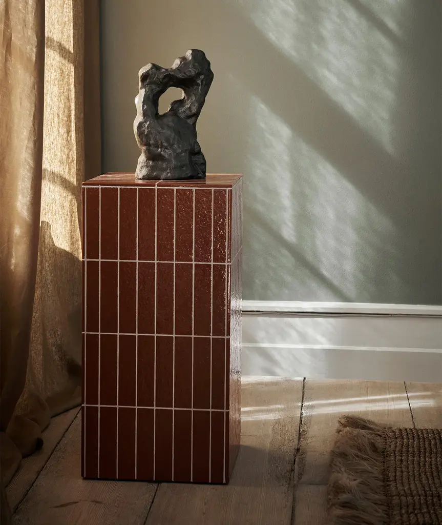 The architectural Pillar Pedestal is entirely crafted from glass fiber reinforced concrete. Adding to the tactility of the piece, grooves have been engraved into the surface of the pedestal, providing it with a beautiful pattern reminiscent of tiles. This robust pedestal serves multiple purposes, whether as an elegant plant stand, a versatile side table or an impactful nightstand.