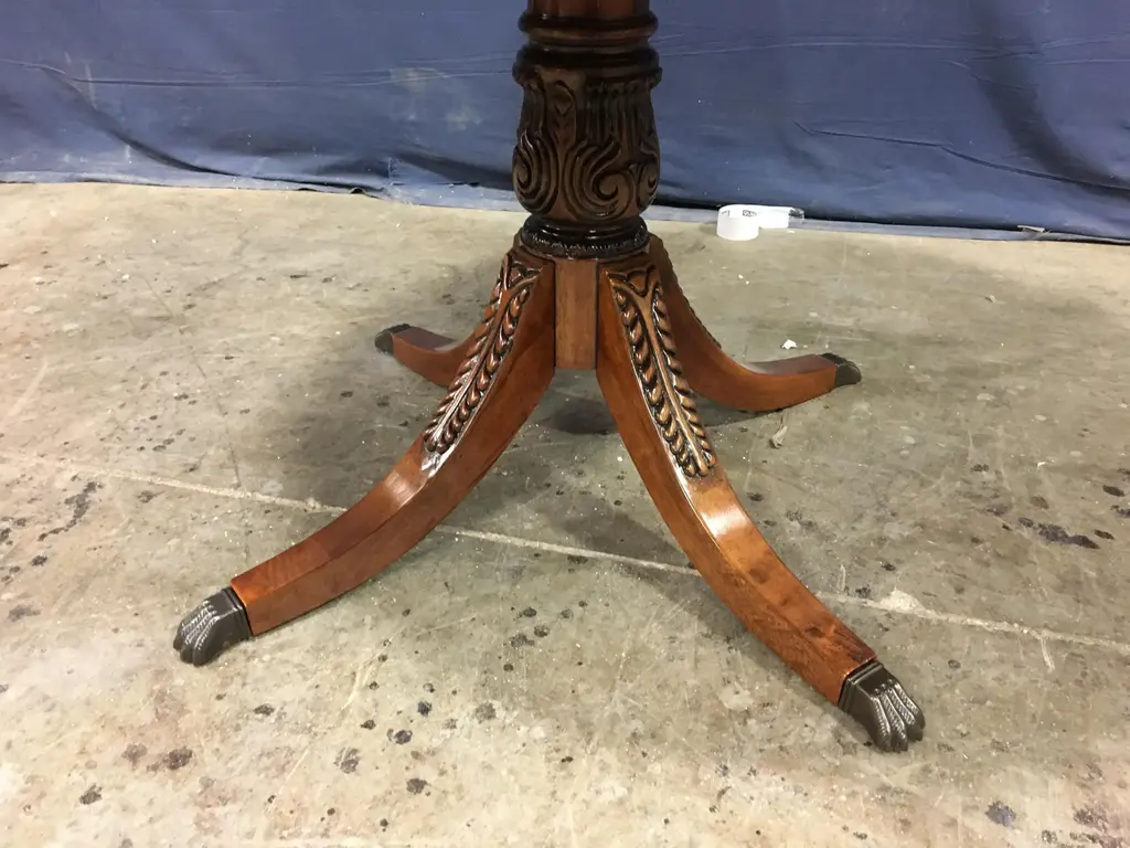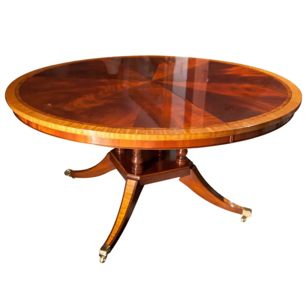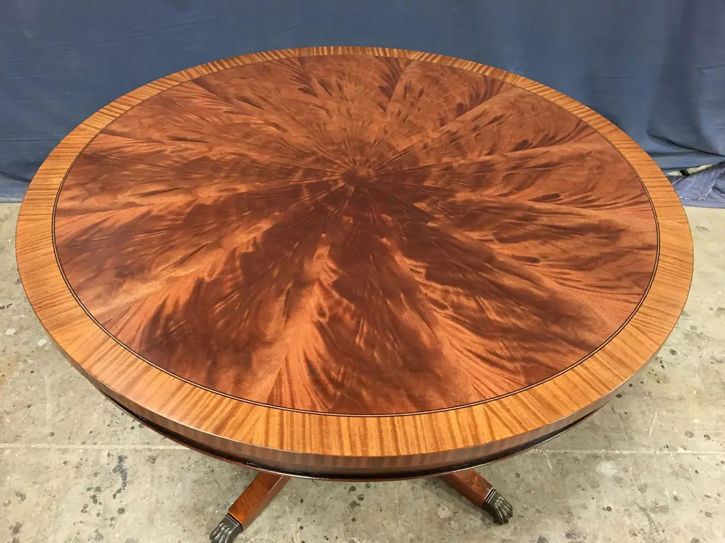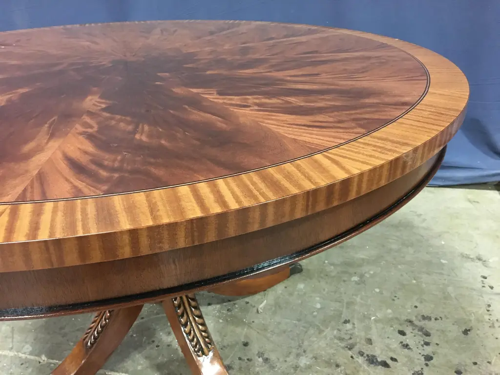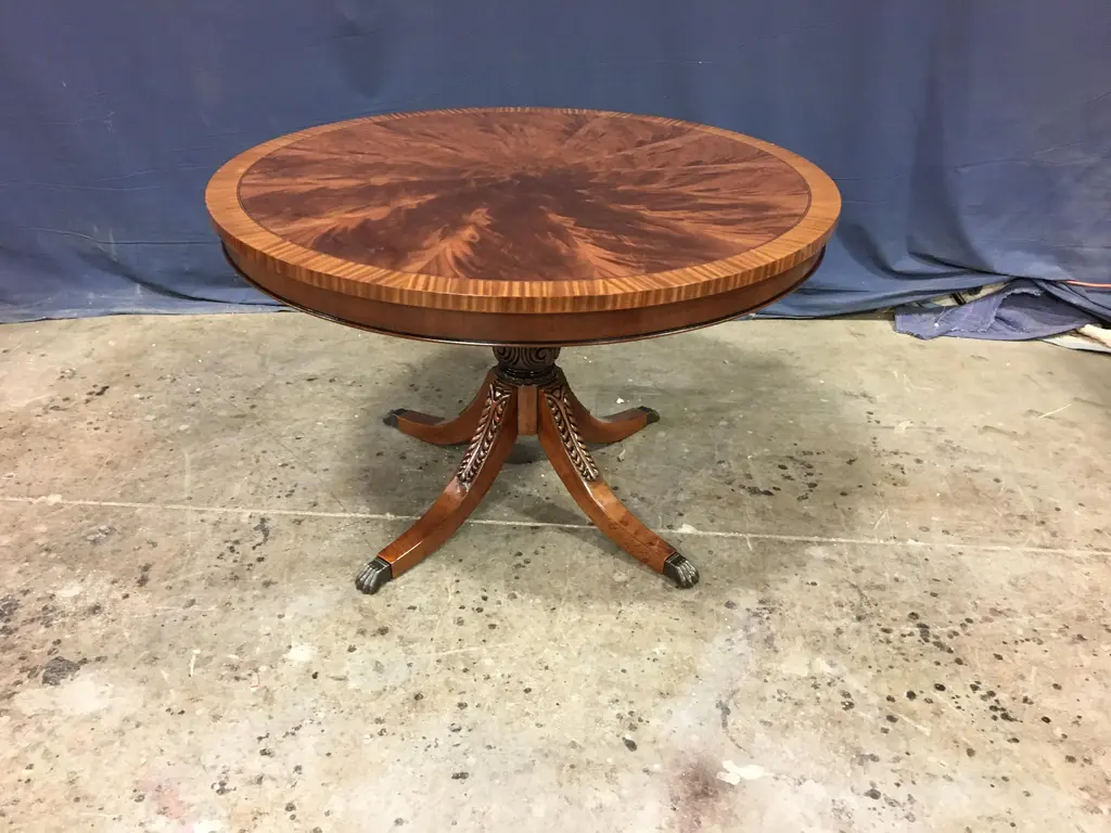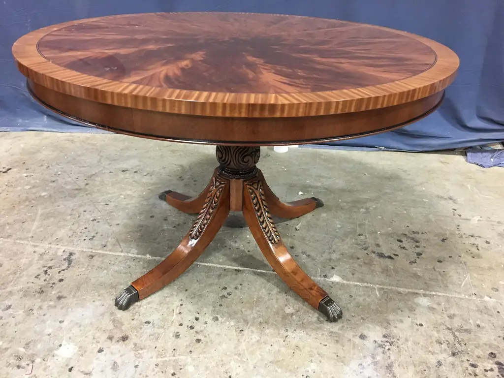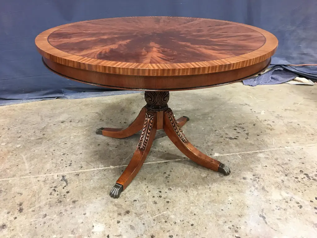This is made to order round traditional mahogany foyer or dining table made in the Leighton Hall shop. It is ideal as a foyer table, breakfast table or dining table for an apartment or condo. It features field of radial cut West African swirly crotch mahogany and a border of satinwood. There is an inlay of ebony and white maple which separates the field from the border. The top has a hand rubbed and polished semi gloss finish. The pedestal has four legs with acanthus leaf carvings which terminate with antique brass lions paw feet. Dimensions: 48” diameter; 30” height