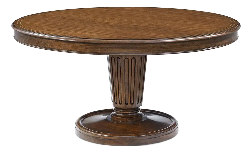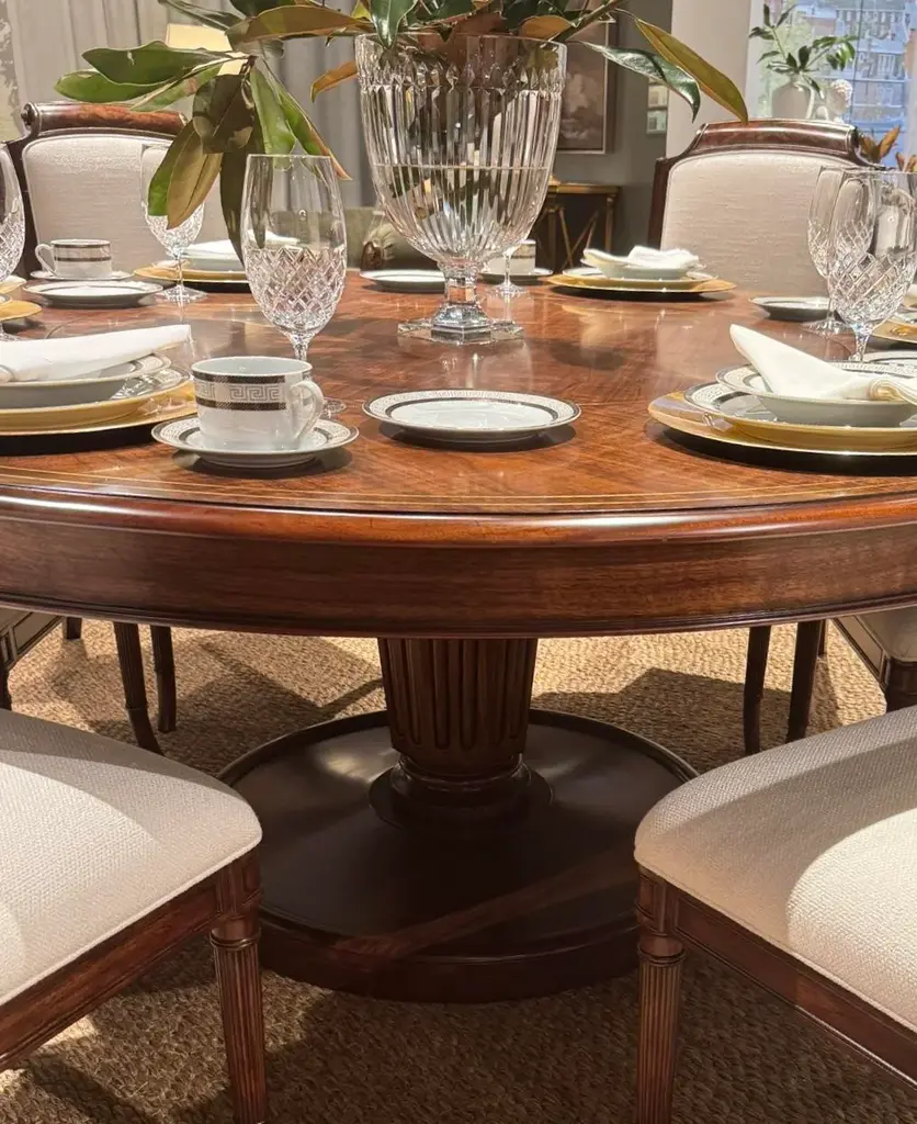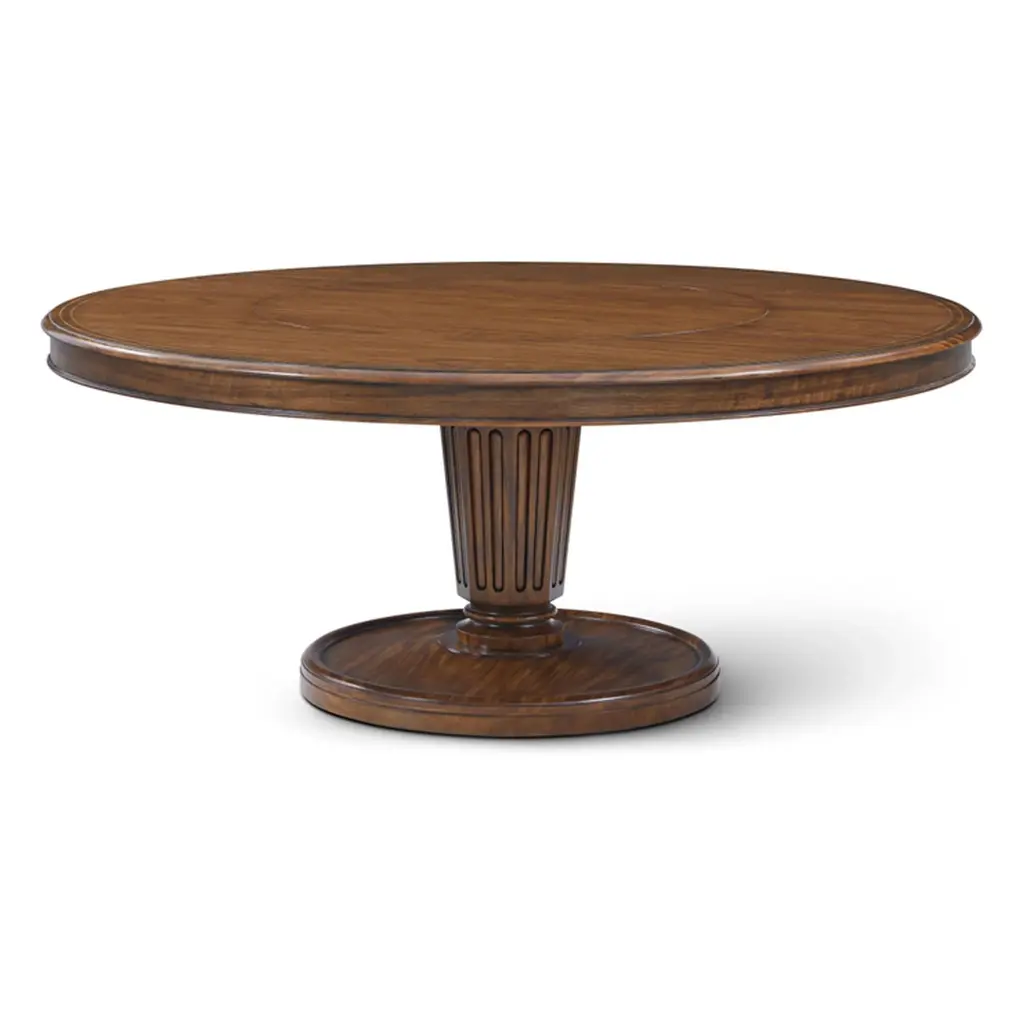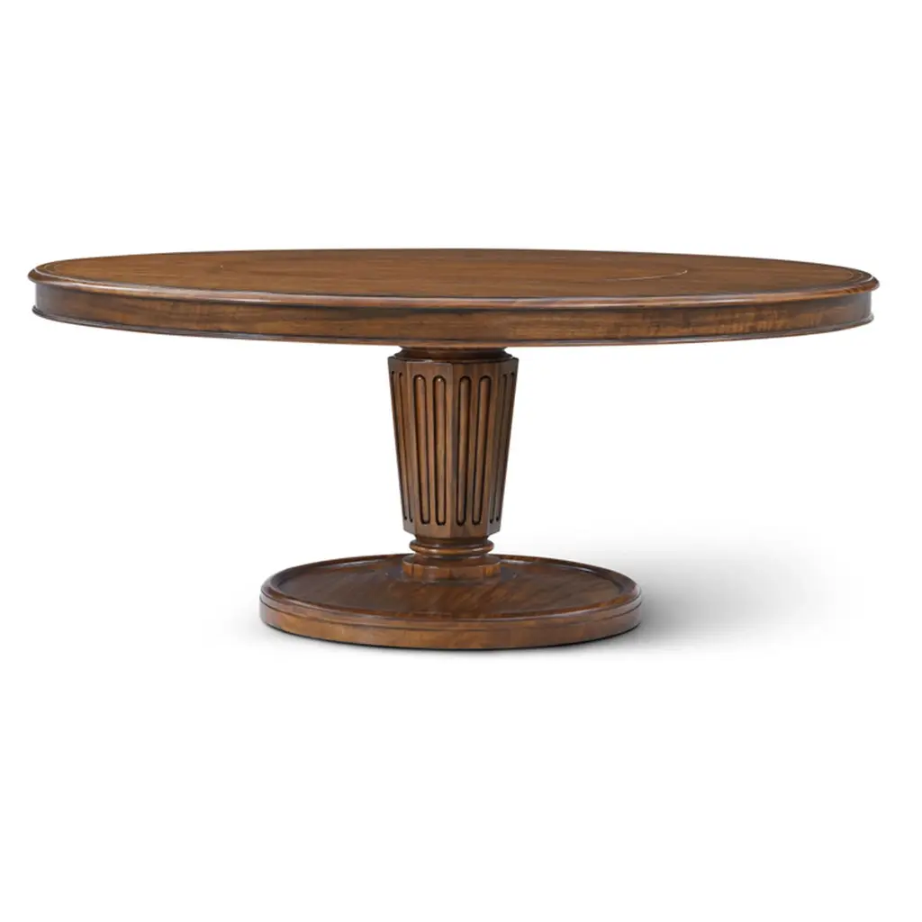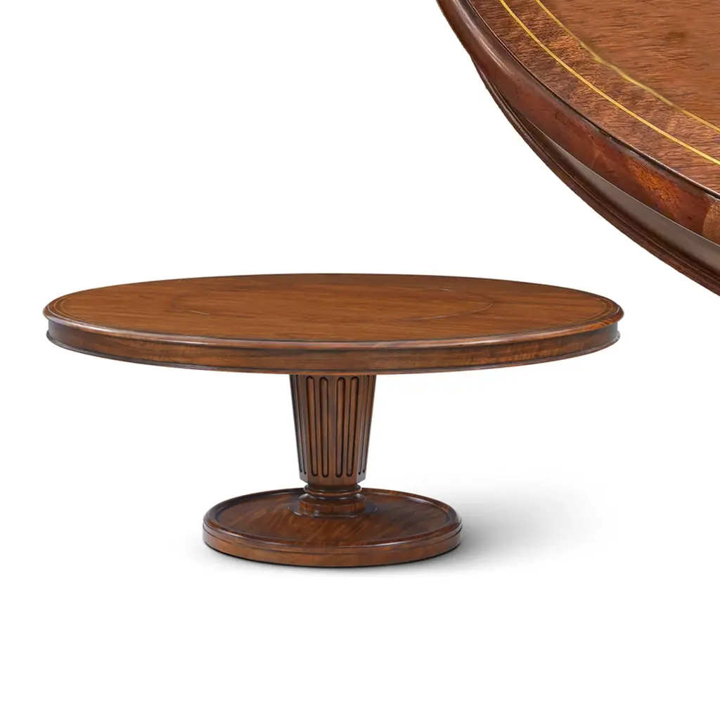 72" Round Pedestal Table with built-in lazy Susan. A walnut tabletop with a bullnose edge, set-back apron, and fine brass pinstriping inalys atop a massive fluted baluster pedestal. A simplistic walnut round table for a traditional dining room. The table is made from Walnut and Khaya. Check out the embedded video for a closer look at this table, matching chairs, and matching side cabinet.