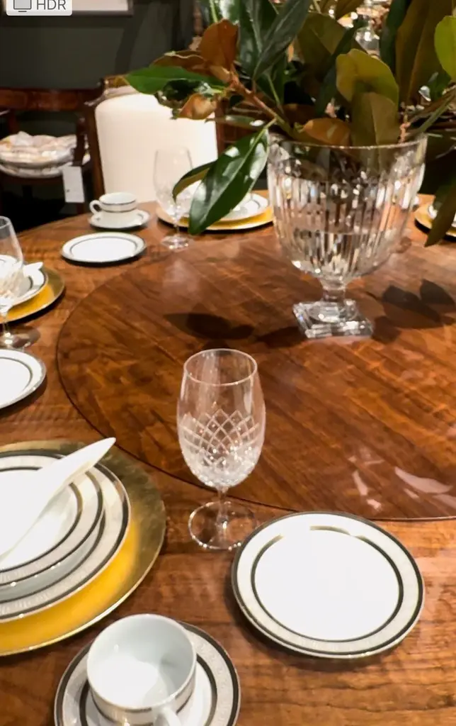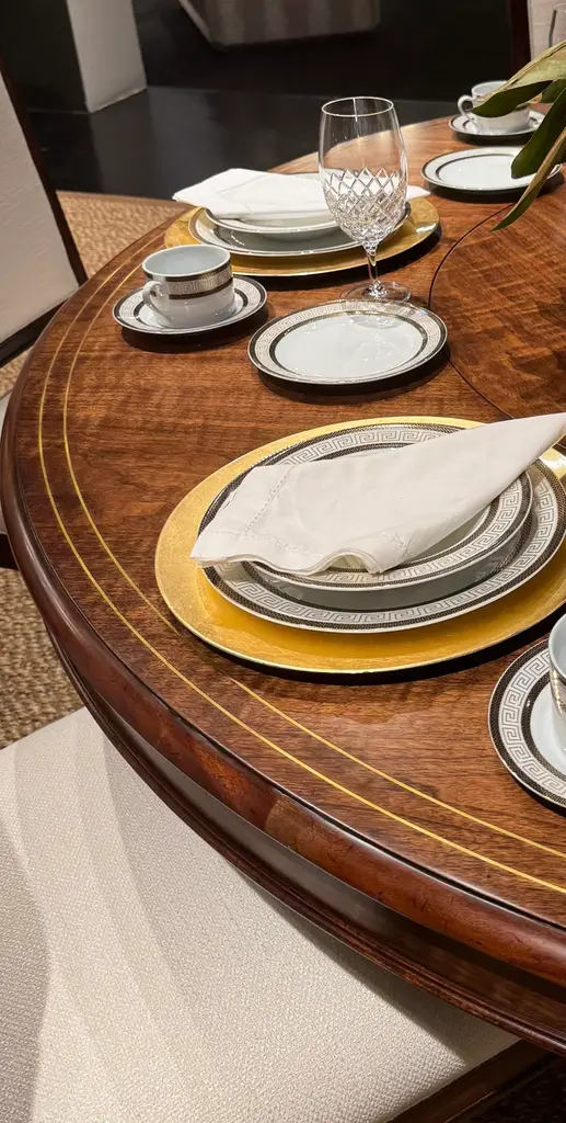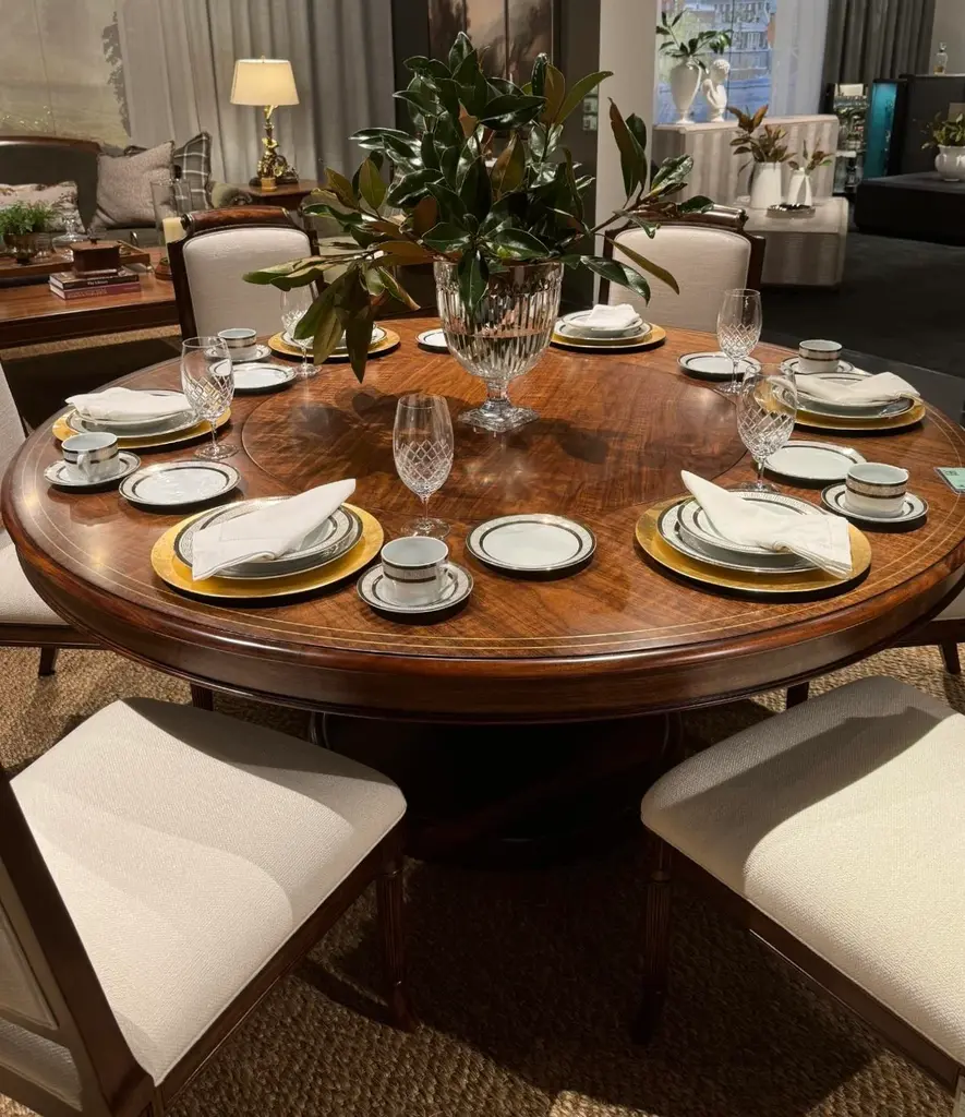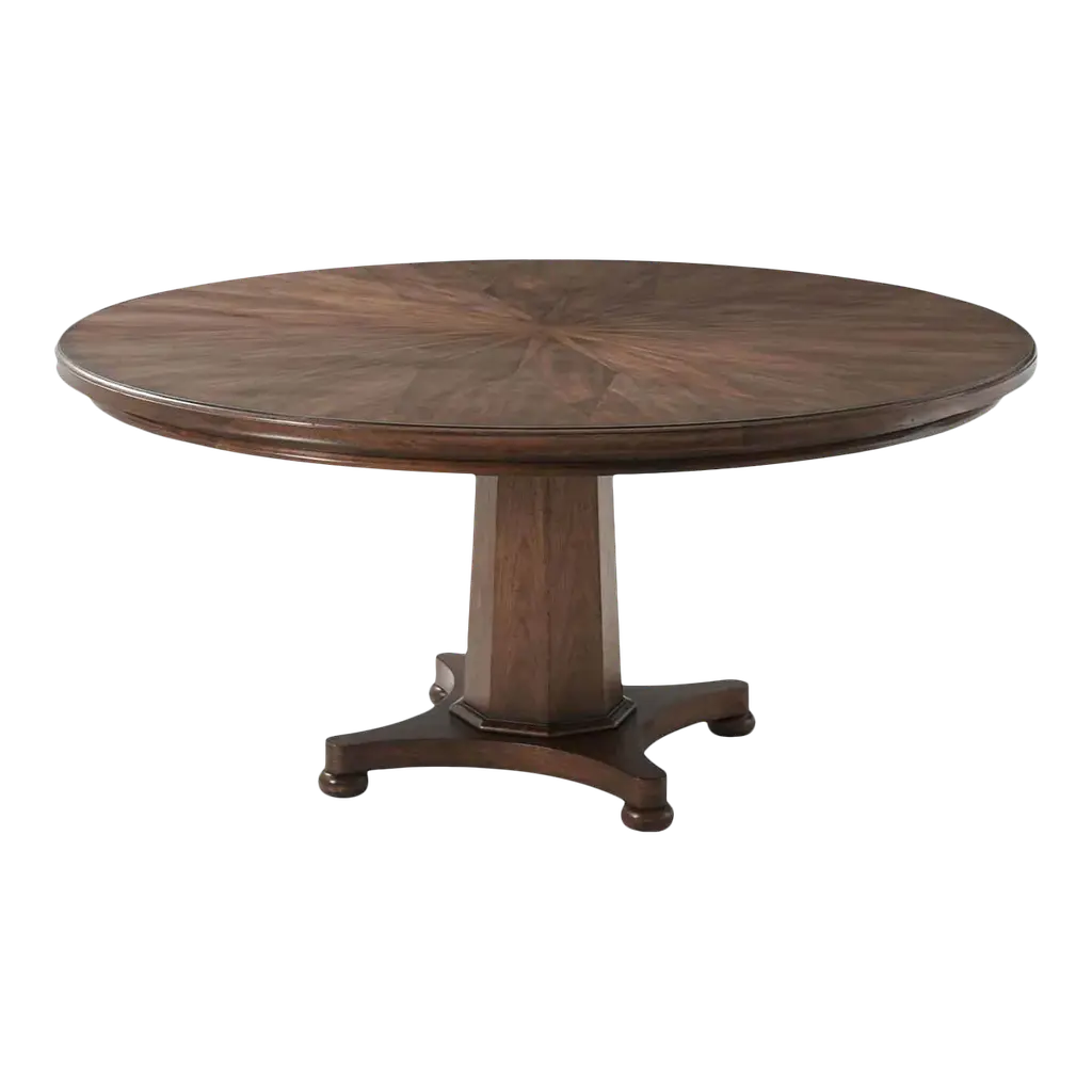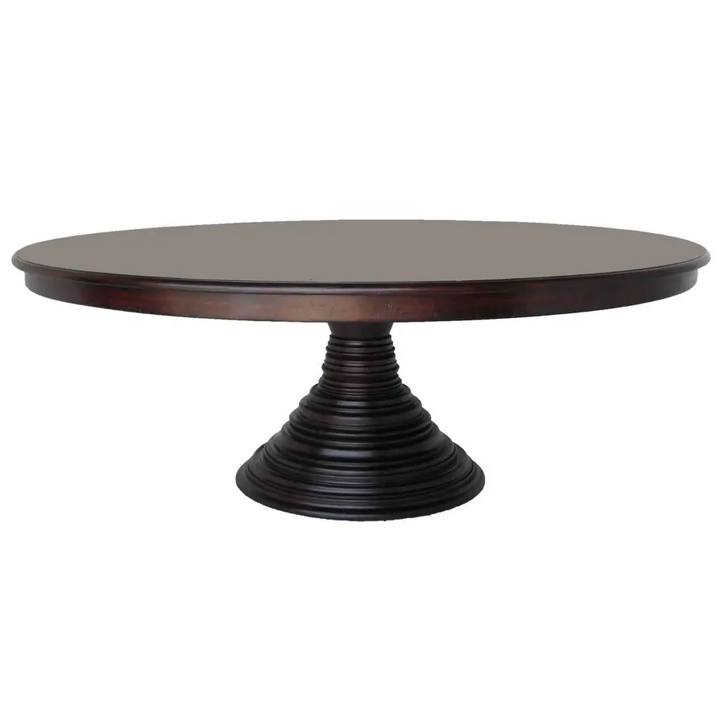 72" Round Pedestal Table with built-in lazy Susan. A walnut tabletop with a bullnose edge, set-back apron, and fine brass pinstriping inalys atop a massive fluted baluster pedestal. A simplistic walnut round table for a traditional dining room. The table is made from Walnut and Khaya. Check out the embedded video for a closer look at this table, matching chairs, and matching side cabinet.