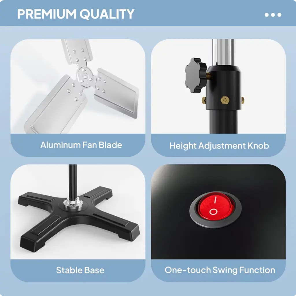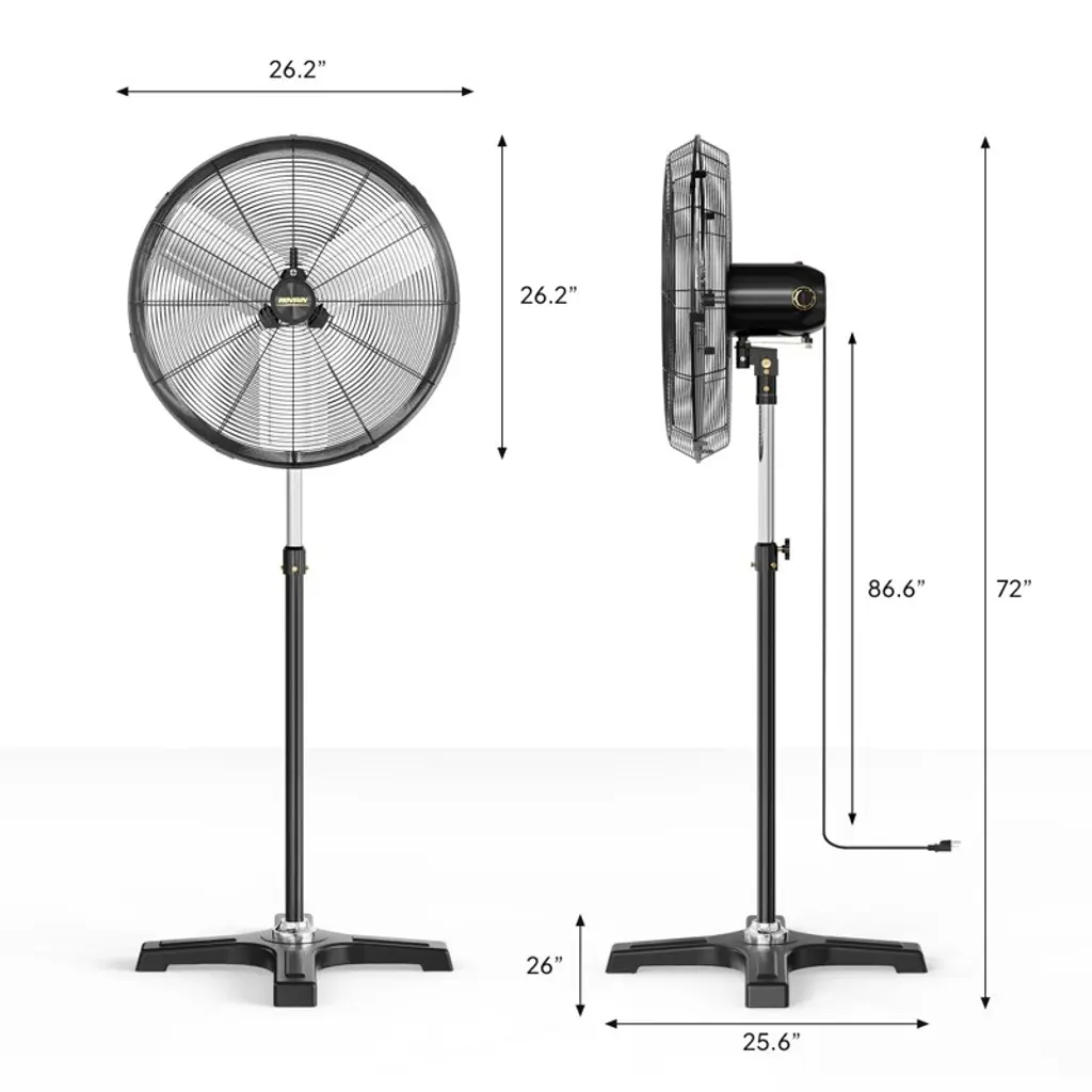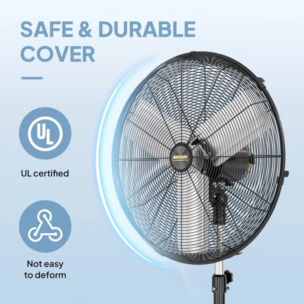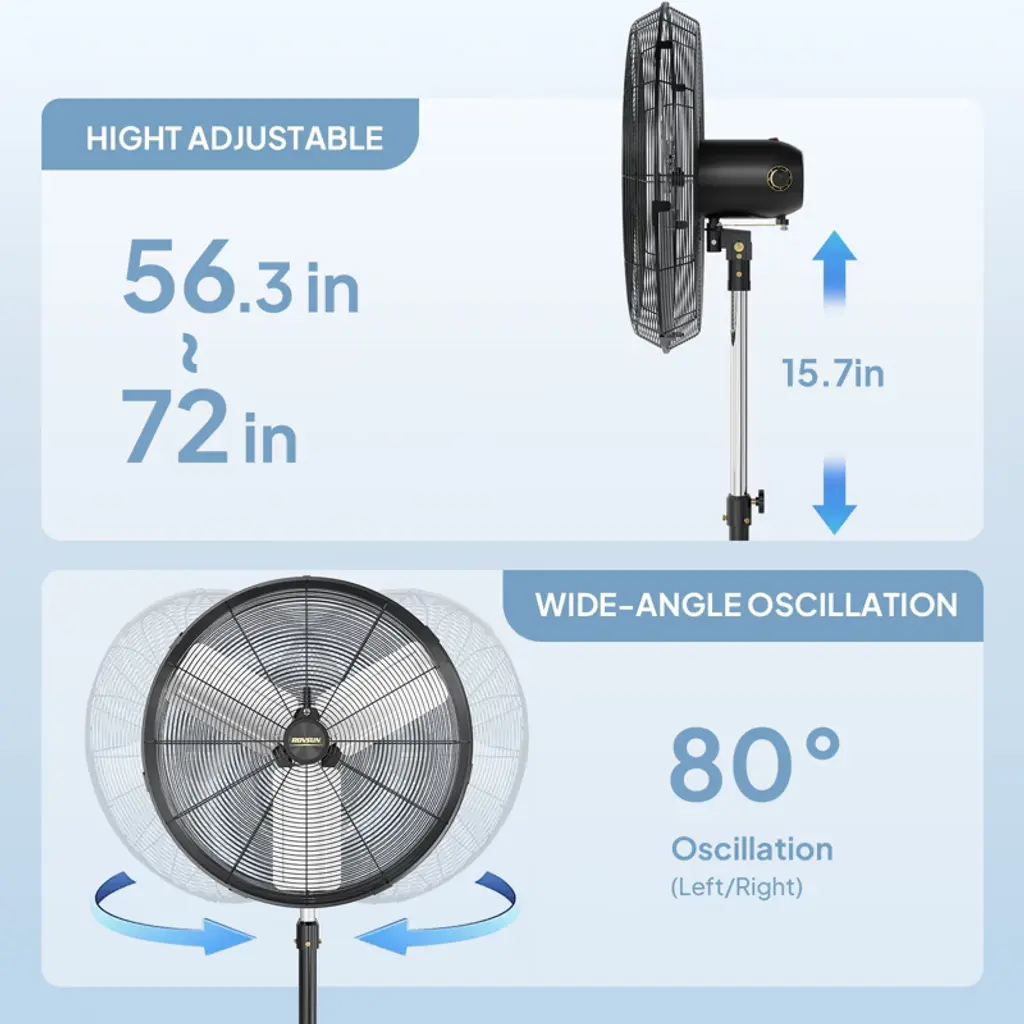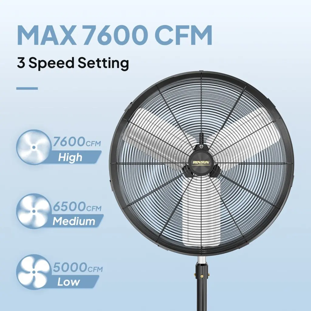 Beat the summer heat with our ROVSUN industrial fan! It comes with three - speed settings, generating a maximum airflow of 7600 CFM at 24 ft/s. The double ball - bearing copper - winding motor provides stable operation. With a maximum power of 181W, it’s reliable and long - lasting. Adjusting the wind is easy with the one - key oscillating function. The fan head tilts 75° - 105° vertically and rotates 80° horizontally. It’s quiet, operating at less than 68 dB. Safety is well - taken care of, with an encrypted mesh cover and UL certification. The adjustable height, aluminum blades, and stable base make it more convenient to use. Ideal for various places like shops, garages, it effectively ventilates enclosed spaces, giving you a refreshing summer.Features:3 speed adjustmentUL listed Stable baseAdjustable heightAluminium fan bladeDouble ball bearing All copper wire motorSpecifications:Airflow: 7600CFM; 6500CFM; 5000CFMWind Speed: 24ft/sSize: 20''Fan cover diameter: 26.2''Oscillation(left/right): 80°Tilt(up/down): 75° - 105° Length of power cord: 86.6''Height adjustment range: 56.3''-72''Maximum power: 181WPackaging includes1 x 24'' industrial pedestal fan1 x Instruction manual