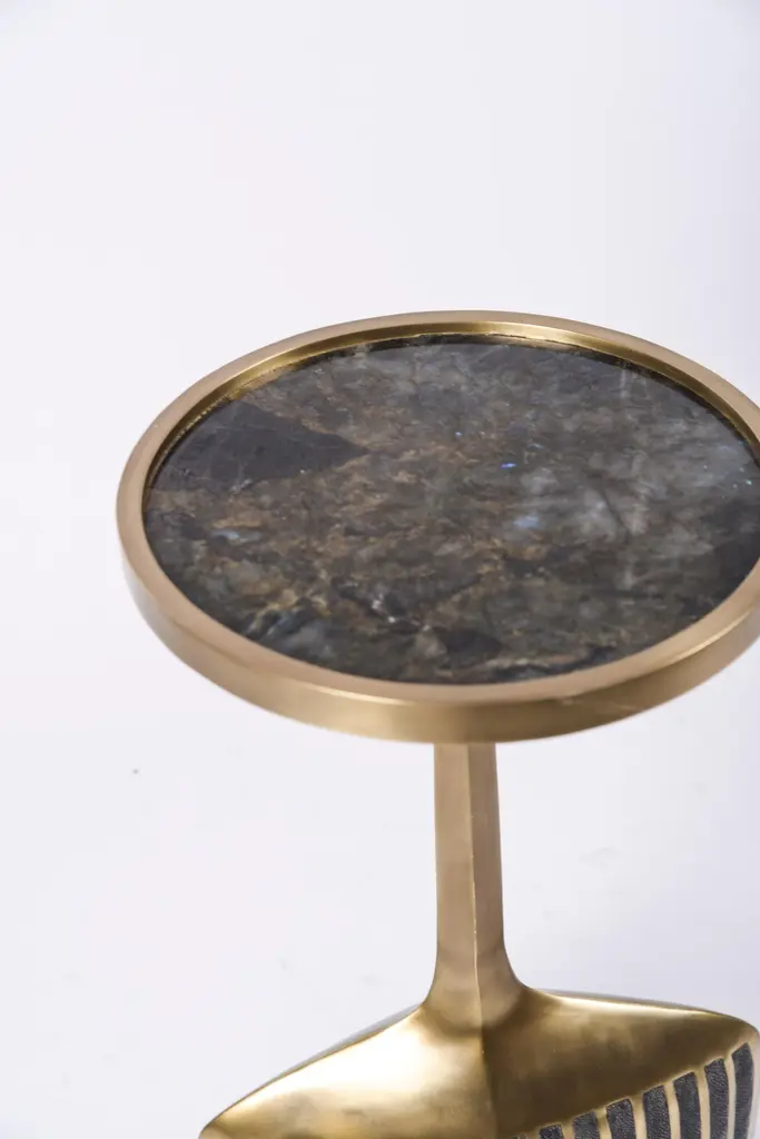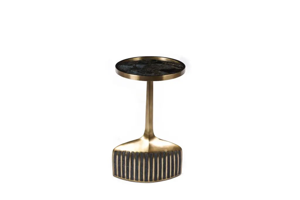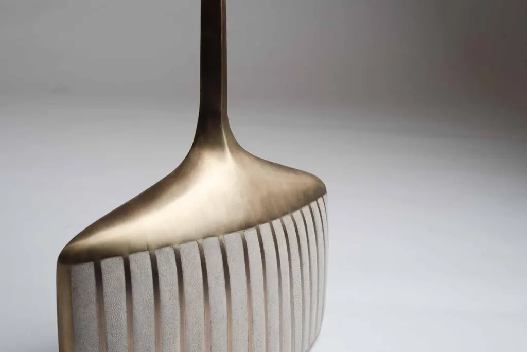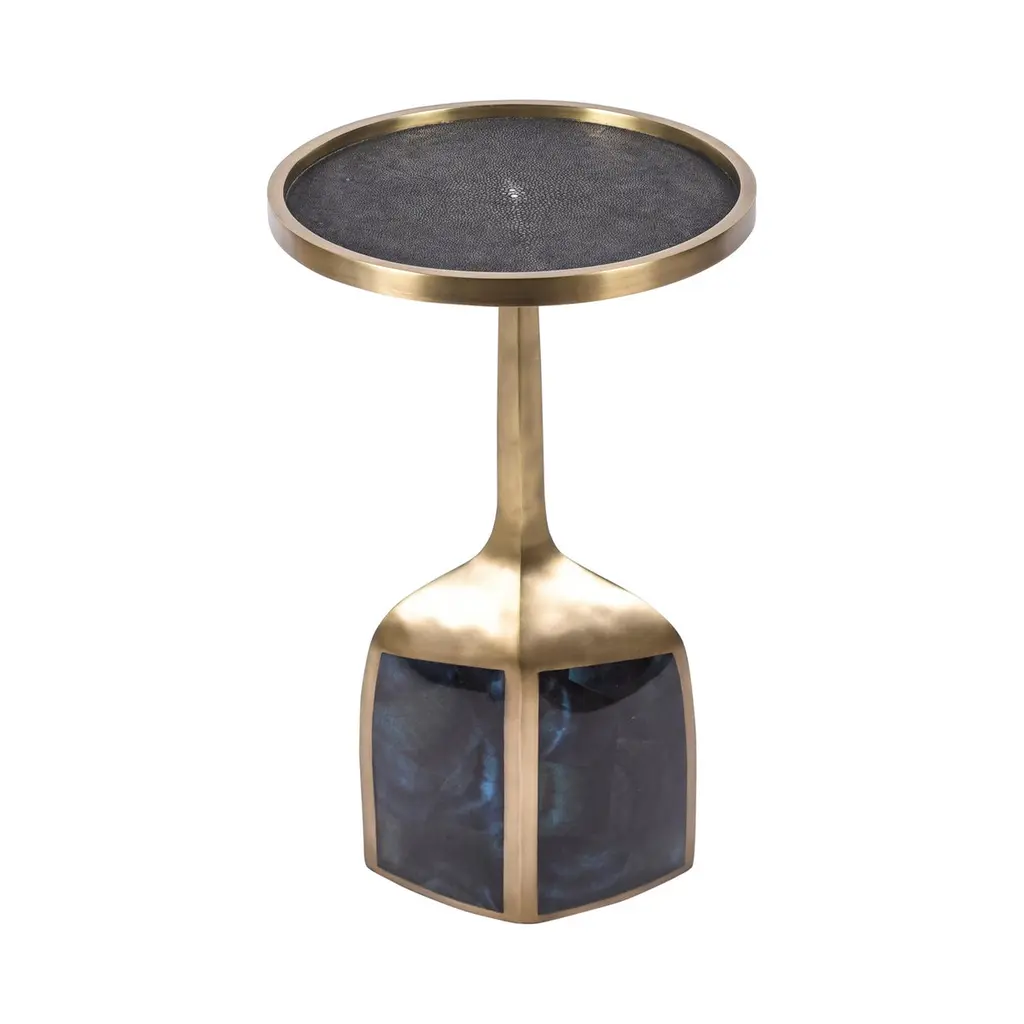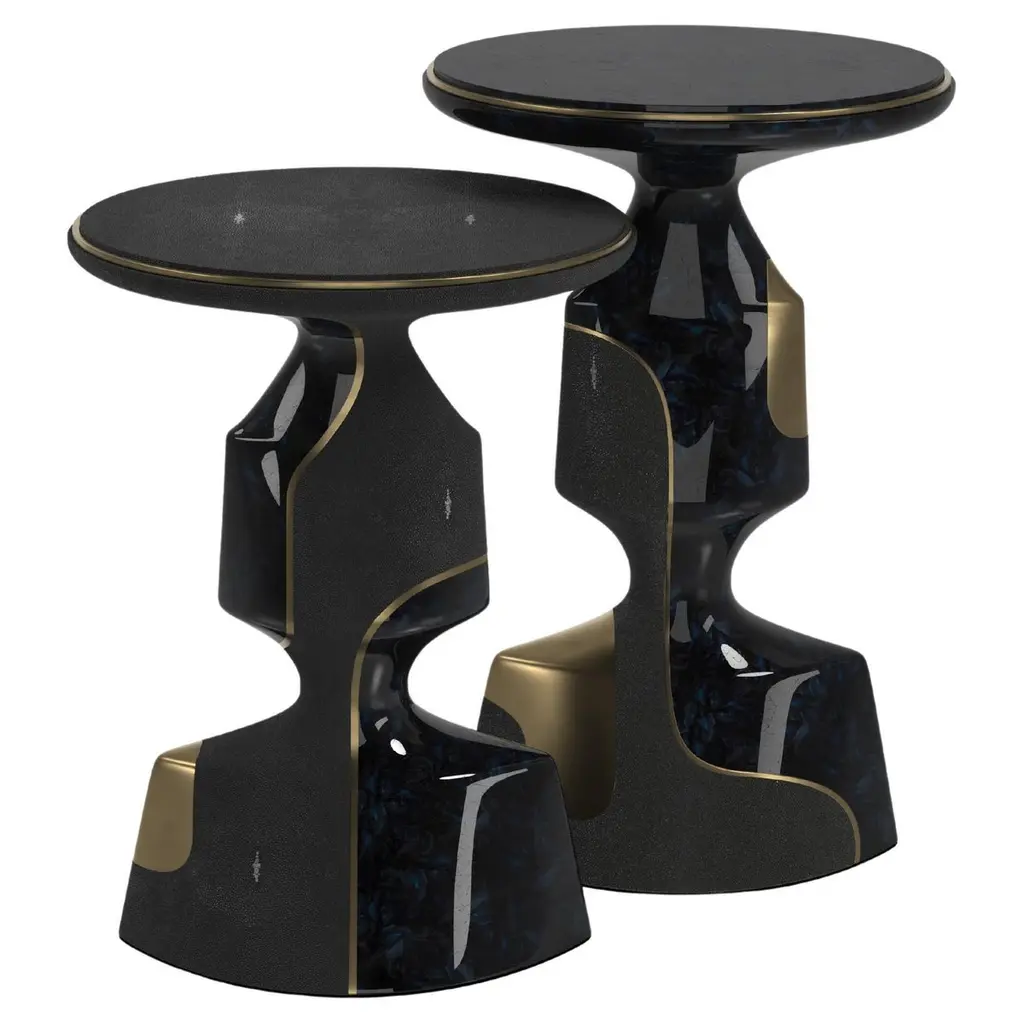 The Paris based label has distinguished themselves since their launch, with their iconic use of shagreen mixed with brass and other exotic materials. All furniture is handcrafted by skilled artisans, ultimately making each piece unique, designed in Paris and produced in the Philippines.The pedestal side table in small and large are the perfect nesting accent pieces due to their sleek and light aesthetic. The large size is inlaid on the top surface with coal black shagreen, the bottom part a mixture of blue pen shell and bronze patina brass. The small size is inlaid on the top surface with Lemurian and the bottom part a mixture of coal black shagreen and bronze patina brass. The option to purchase the tables as individuals is available upon request. Available in other finishes, see images at end of slide. Custom color/sizing available on request.The dimensions of this set are:L- 35 x 35 x 60 cm / 13.75 x 13.75 x 23.5''S- 35.5 x 30.5 x 55 cm / 14 x 12 x 21.5''All R&Y Augousti pieces are handmade by artisans, ultimately making each piece unique. Custom color or sizing available on request. Wipe clean with soft dry cloth.Acclaimed design duo Ria & Yiouri Augousti have established themselves since the 1990s as pioneers of modern-vintage style through their luxurious Art Deco inspired collections.The Paris based label has distinguished themselves since their launch, with their iconic use of shagreen mixed with brass and other exotic materials. All furniture is handcrafted by skilled artisans, ultimately making each piece unique. All shagreen-covered items should be kept out of direct sunlight, color variants may occur on the stingray and other exotic finishes, but this showcases the Parisian label's commitment to creating authentic luxurious products using natural components. For all pieces inlaid with stone and semi-precious stones, due to the natural quality of the material color tonality and pattern placement may differ slightly per piece.