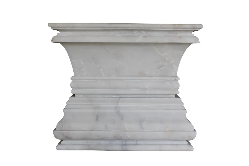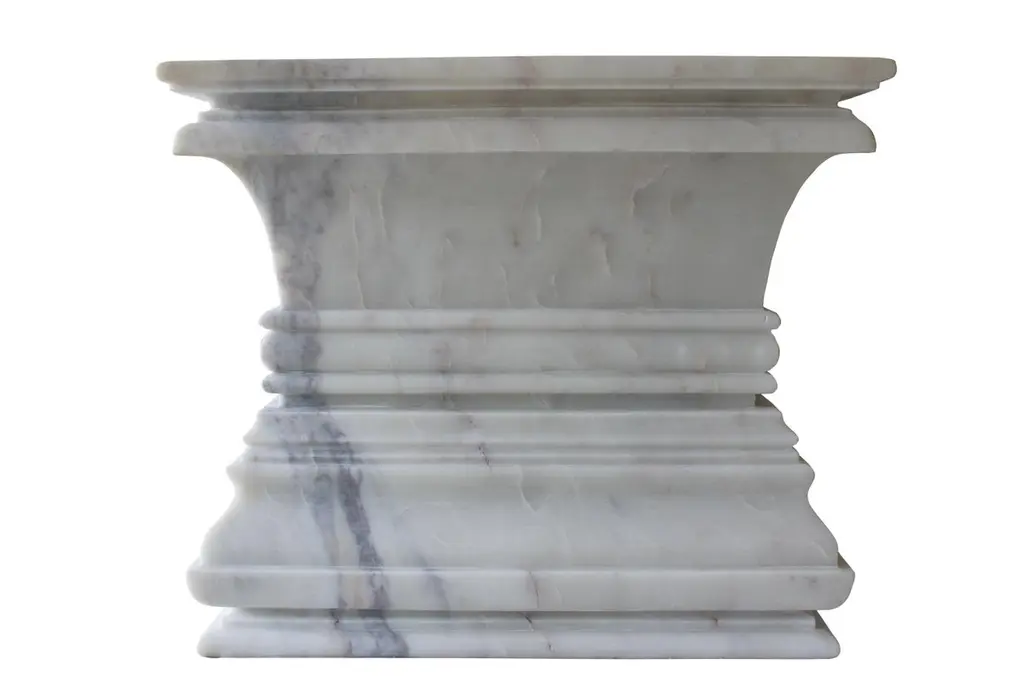 Inspired by the column capitals of the Roman architectural style, this pedestal is a statement piece. A sculpture pedestal, a side table, or a garden element, this versatile piece can fit wherever you like. The piece is handcrafted by highly skilled professionals who have been working in the field from more than 25 years. The piece is completely handmade and is built with perfection.Square Architectural Pedestal Side TableSize- 18” x 18” x 15” H.Materials - White Marble, Hand Carved, Semi matt finished.Buyer Cancellation-The cancellation charge is 25% which increases to 50% if the production is started.Prices do not include shipping from India (for custom orders) or our MN warehouse (items from stock). That will be additional.
