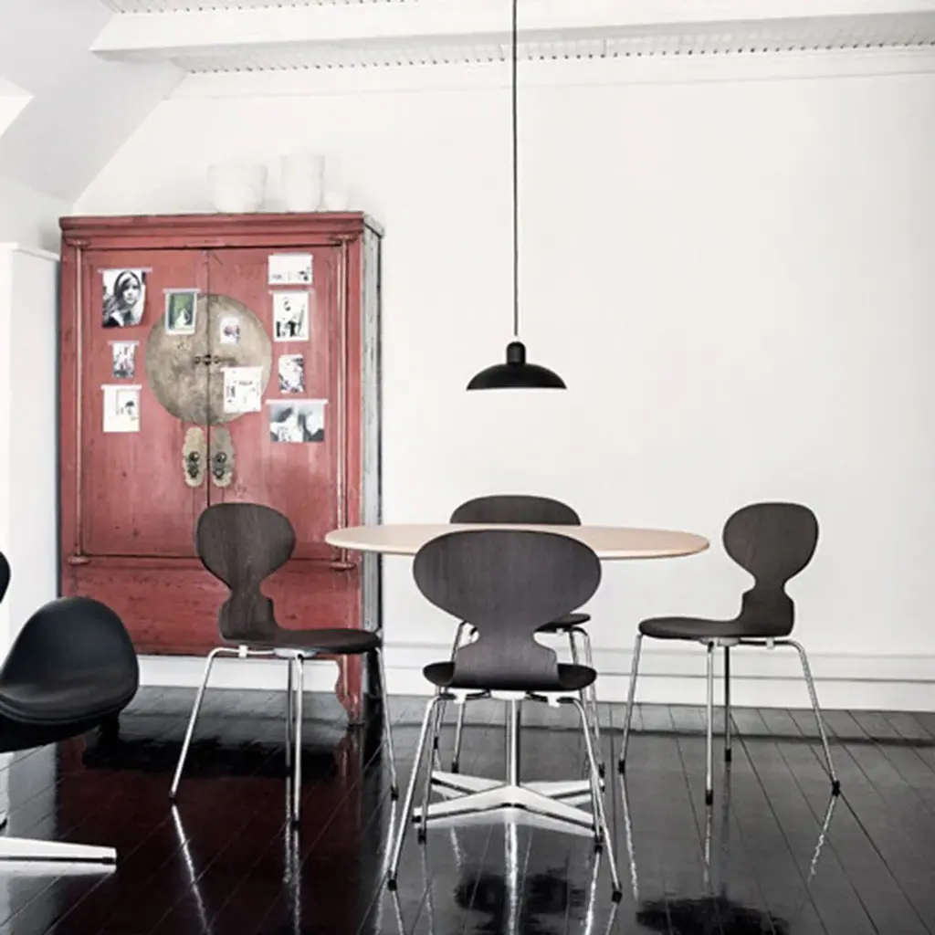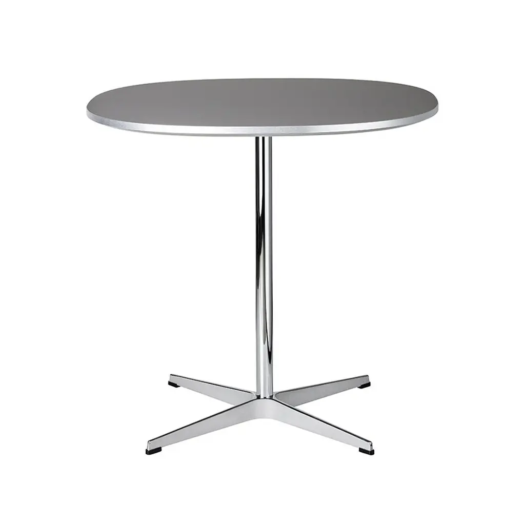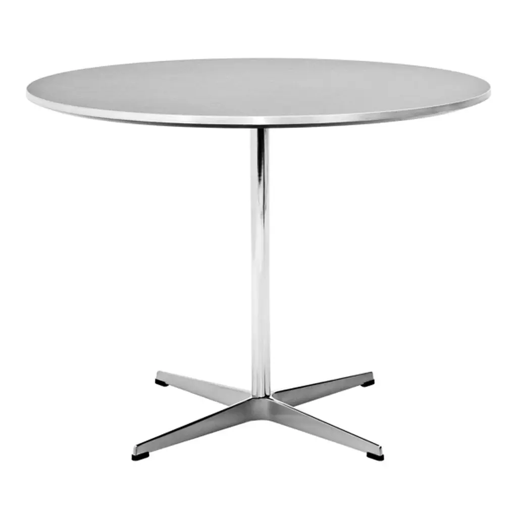The Table Series comes in a variety of shapes and sizes. The tables are available in two finishes; laminate and walnut veneer. The laminate versions come with an aluminum edge, while the veneer versions come with a veneer edge. Some tables come with a 4- or 6-star base, made of satin polished aluminum with a satin chromed steel pedestal (two heights), while other tables have span legs (3 heights) in chromed steel. Selected tables with span legs (height 28.3") are also available in white, black or grey powder coated steel.