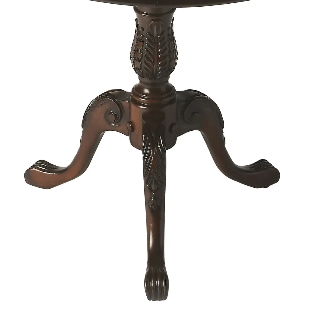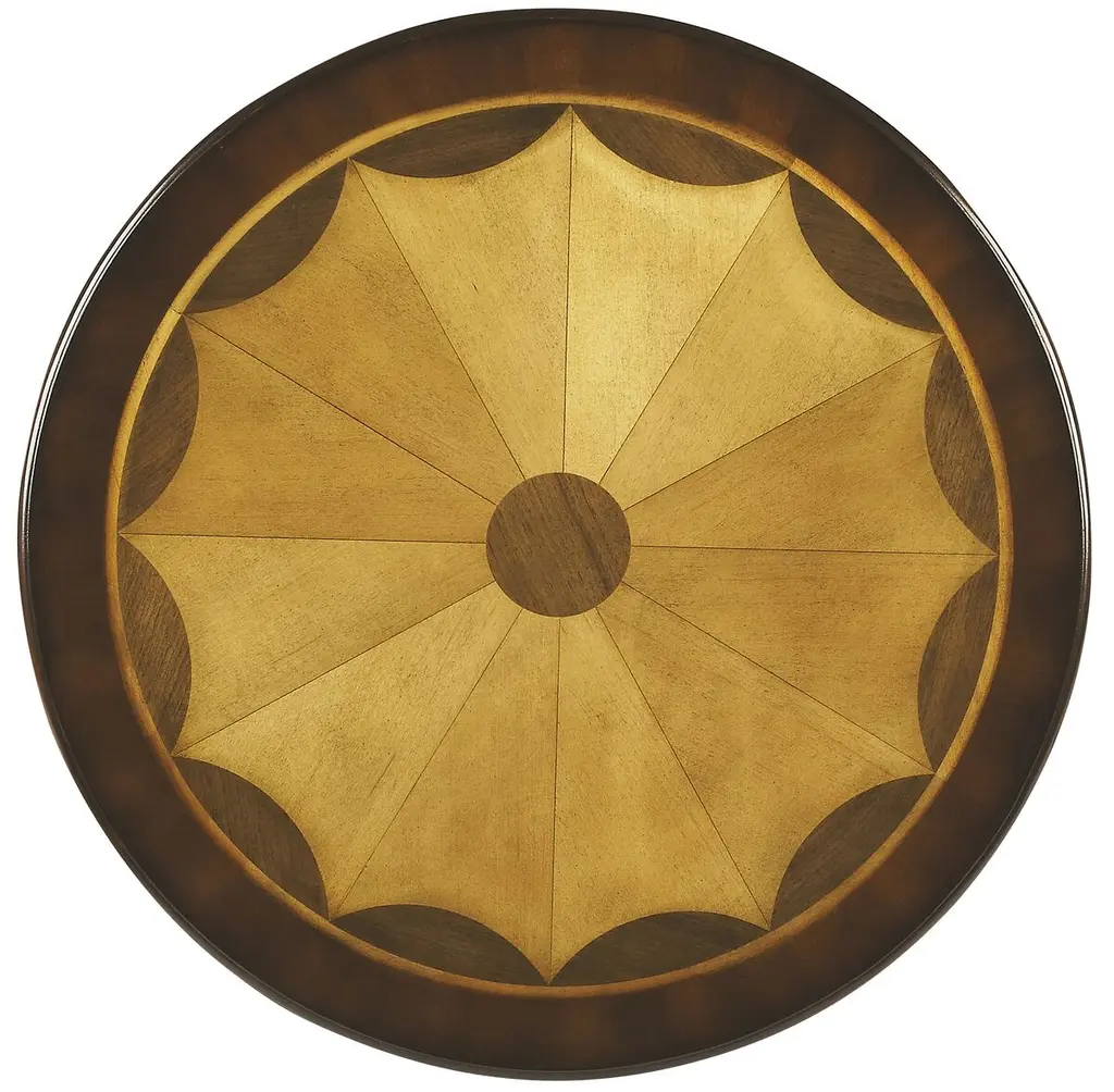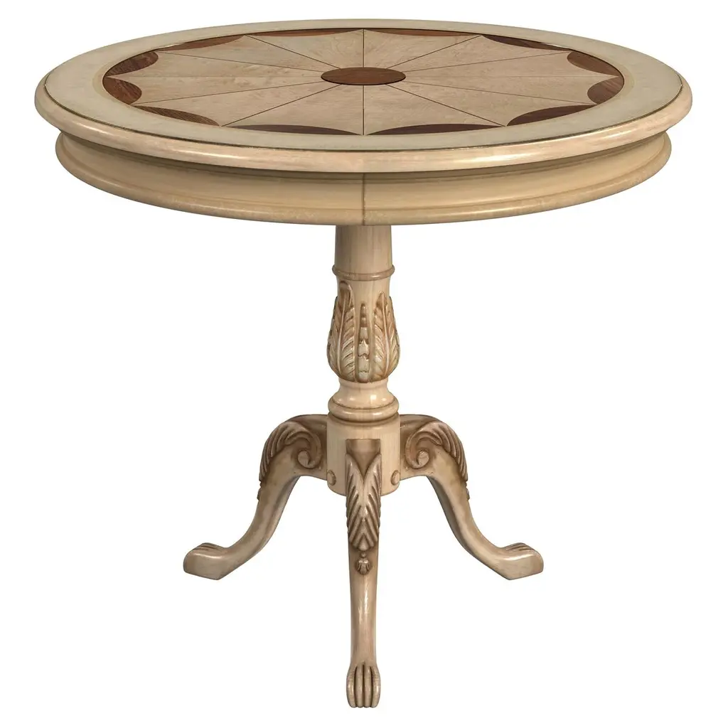 Crafted from selected solid wood and choice veneers, this piece features a beautifully hand-carved center inlay made of maple and walnut veneers. The unique design is complemented by burnished detailing, all resting on a sturdy pedestal base.