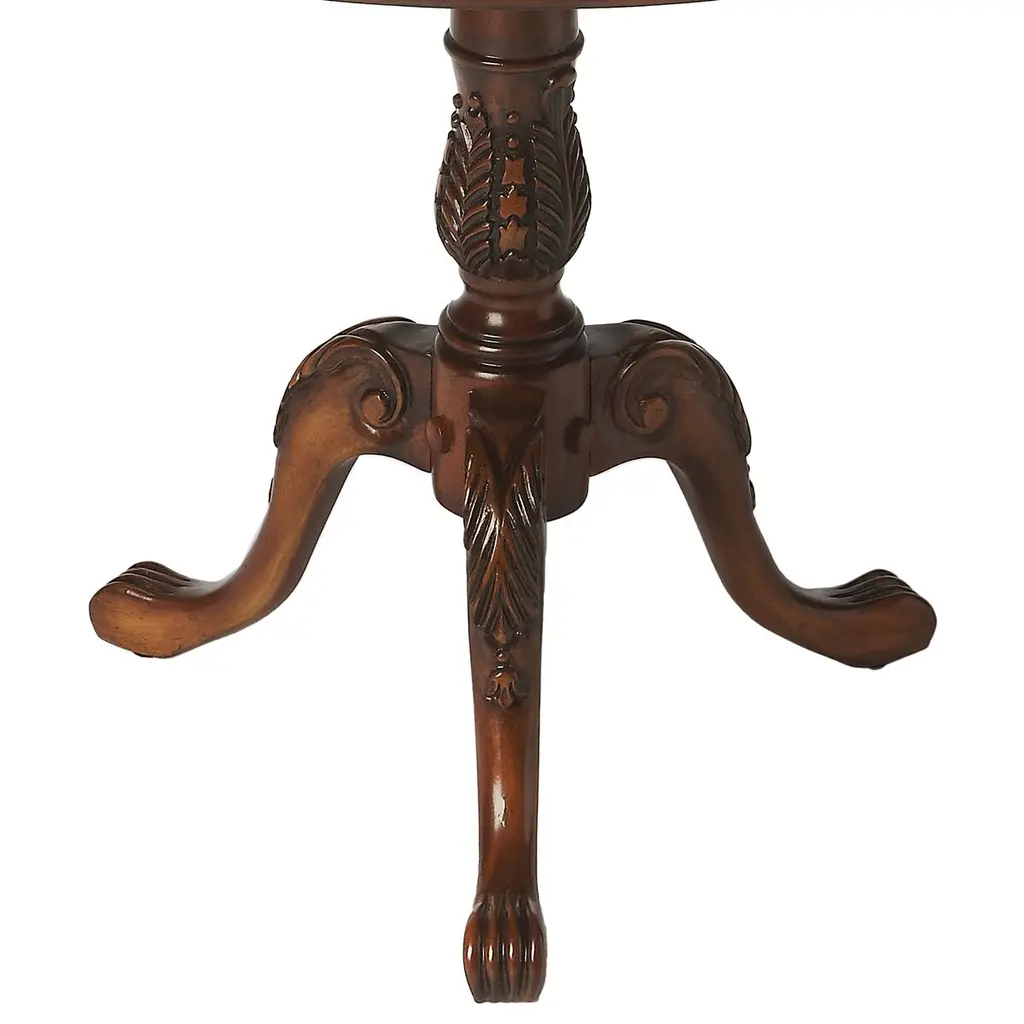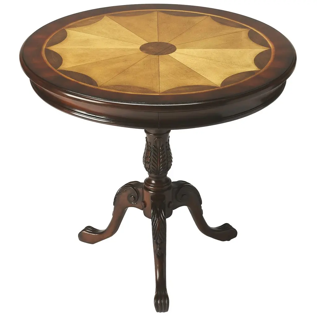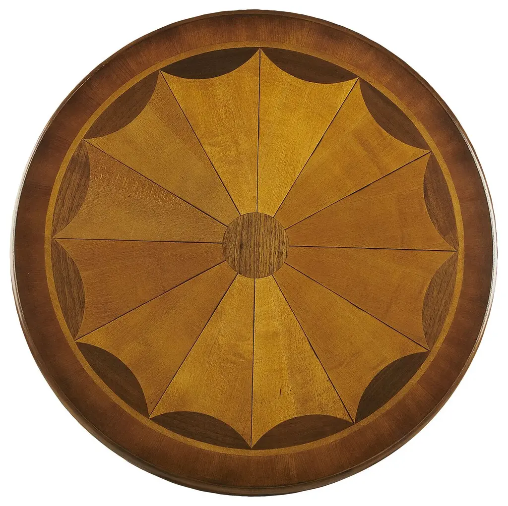 Crafted from selected solid wood and choice veneers, this piece features a beautifully hand-carved center inlay made of maple and walnut veneers. The unique design is complemented by burnished detailing, all resting on a sturdy pedestal base.