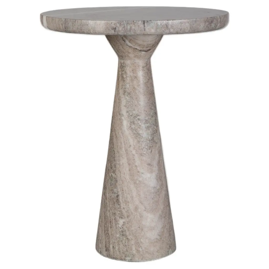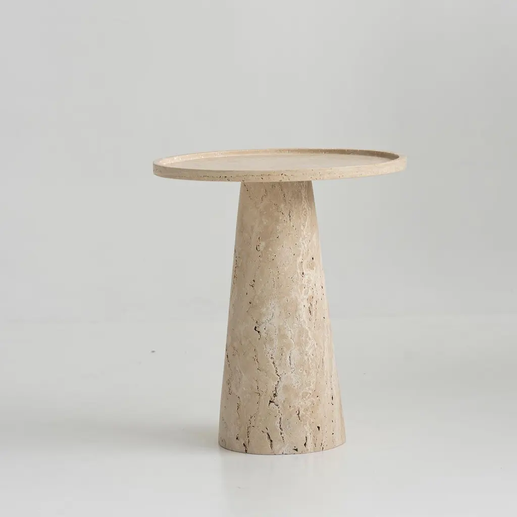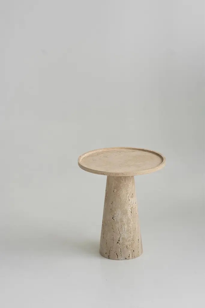 Travertine Pedestal Side Table Stunning, aesthetic, timeless are words that can be used to describe this elegant and modern side table from Kiwano. Expertly crafted and finished by hand, our travertine side tables are a study in sculptural simplicity. Natural variations in the stone's distinctive veining, tonal hues and organic texture reveal the inherent beauty and one-of-a-kind character of each piece. Material: Marble