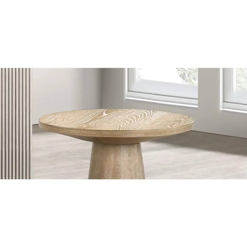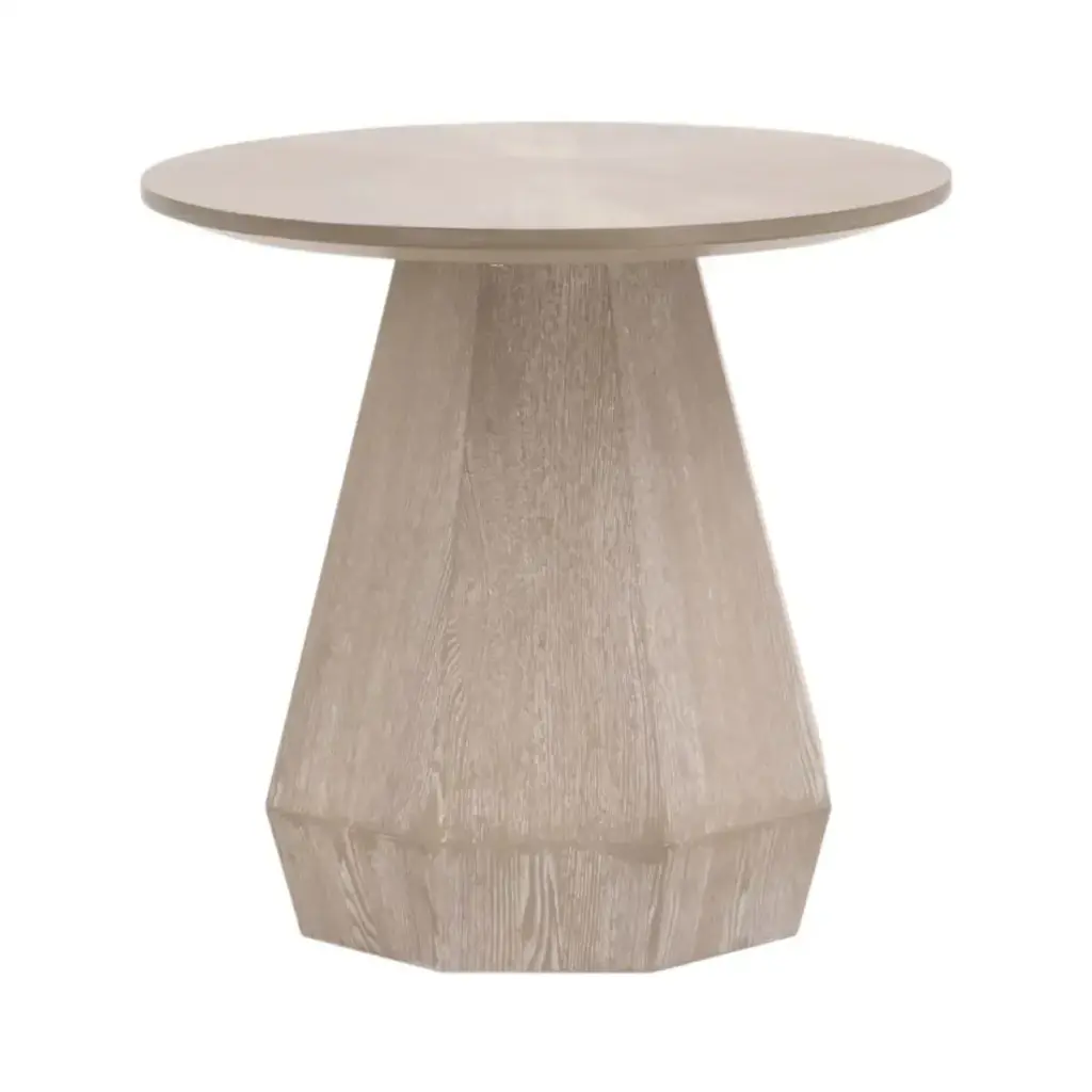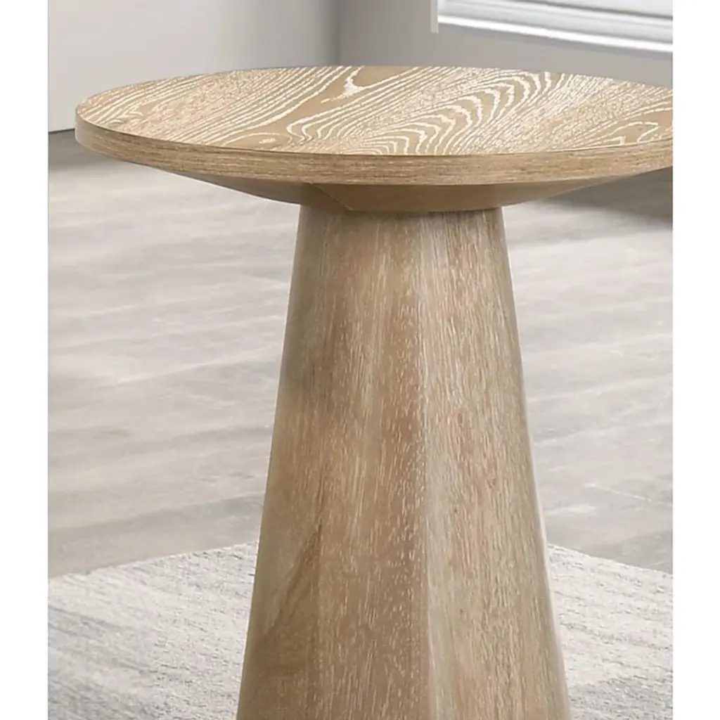 Product Description Product Dimension : End Table : 20inDIA X 21inHProduct Description : The Table is a stylish and functional round end table with a contemporary design, featuring an oak finish and a distinctive cone-shaped pedestal base. Primarily a combination of Rubberwood, Oak Veneer, and Engineered Wood. This blend provides durability and the aesthetic of oak.Listing Include : 1pc End Table OnlyCoffee Table-Not IncludedSimple Assembly Required.