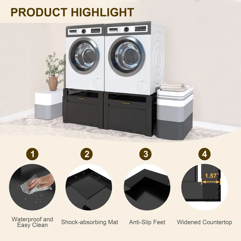 Measuring 29" x 29", this laundry pedestal fits most washing machines and dryers on the market. Ensure a perfect fit by measuring your appliance's base dimensions before purchase. Features a pull-out drawer for easy access to detergents, fabric softeners, and other laundry essentials, keeping everything organized and within reach.Raises the overall height by 22 inches to reduce bending and back strain, making laundry tasks more comfortable and pain-free. Includes a retractable laundry basket holder for sorting or folding clothes, plus a widened countertop for added utility.Equipped with waterproof and easy-to-clean materials, shock-absorbing mat, anti-slip feet, and a sturdy construction that supports up to 300 lbs.