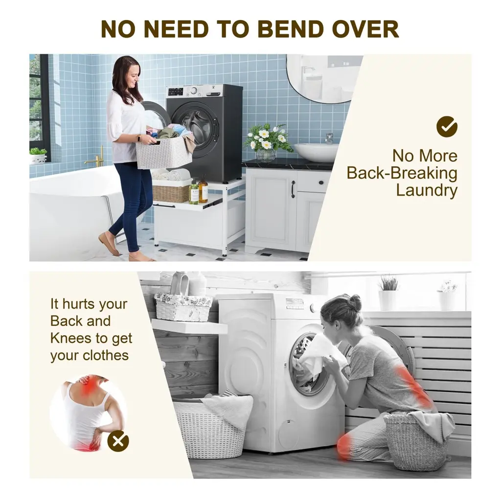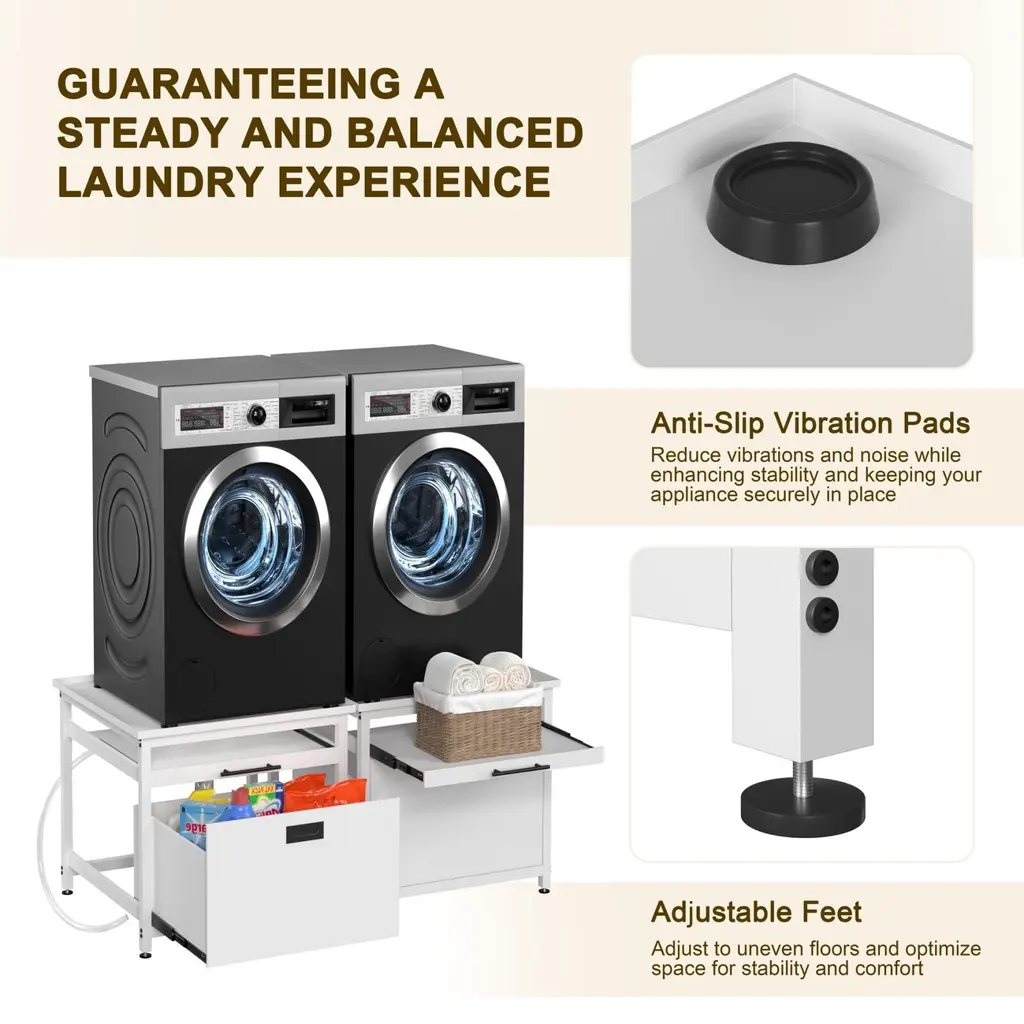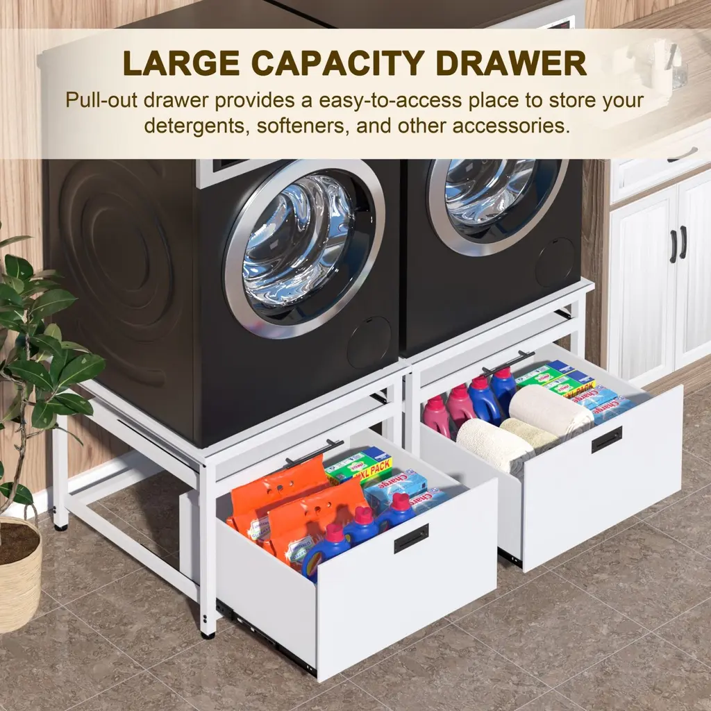 Measuring 29" x 29", this laundry pedestal fits most washing machines and dryers on the market. Ensure a perfect fit by measuring your appliance's base dimensions before purchase. Features a pull-out drawer for easy access to detergents, fabric softeners, and other laundry essentials, keeping everything organized and within reach.Raises the overall height by 22 inches to reduce bending and back strain, making laundry tasks more comfortable and pain-free. Includes a retractable laundry basket holder for sorting or folding clothes, plus a widened countertop for added utility.Equipped with waterproof and easy-to-clean materials, shock-absorbing mat, anti-slip feet, and a sturdy construction that supports up to 300 lbs.
