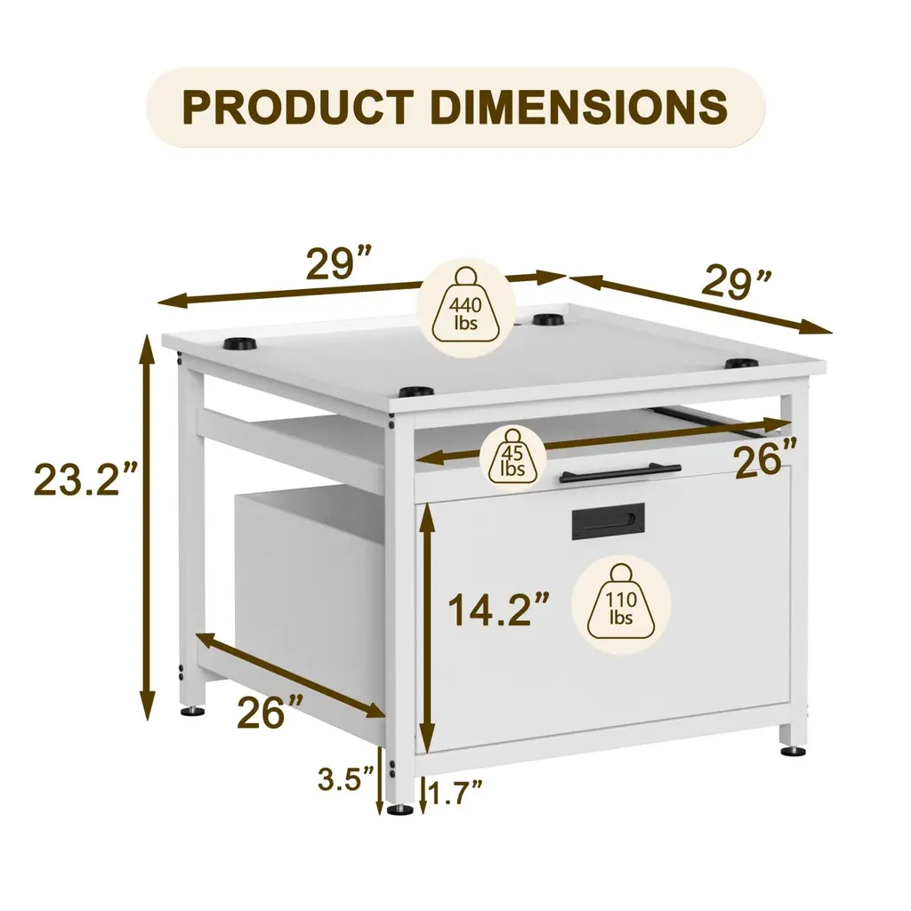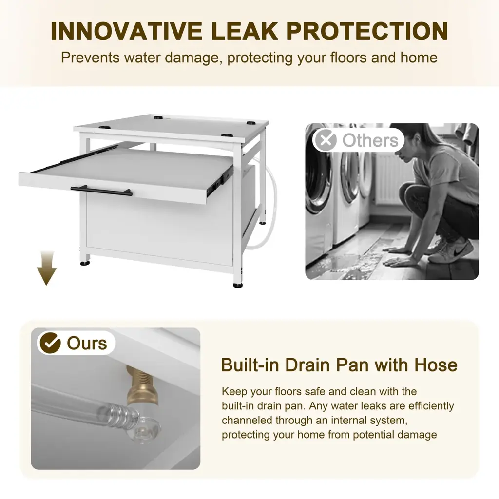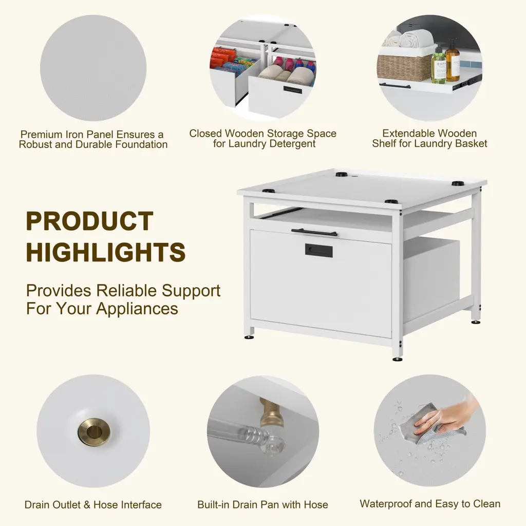 Measuring 29" x 29", this laundry pedestal fits most washing machines and dryers on the market. Ensure a perfect fit by measuring your appliance's base dimensions before purchase. Features a pull-out drawer for easy access to detergents, fabric softeners, and other laundry essentials, keeping everything organized and within reach.Raises the overall height by 22 inches to reduce bending and back strain, making laundry tasks more comfortable and pain-free. Includes a retractable laundry basket holder for sorting or folding clothes, plus a widened countertop for added utility.Equipped with waterproof and easy-to-clean materials, shock-absorbing mat, anti-slip feet, and a sturdy construction that supports up to 300 lbs.