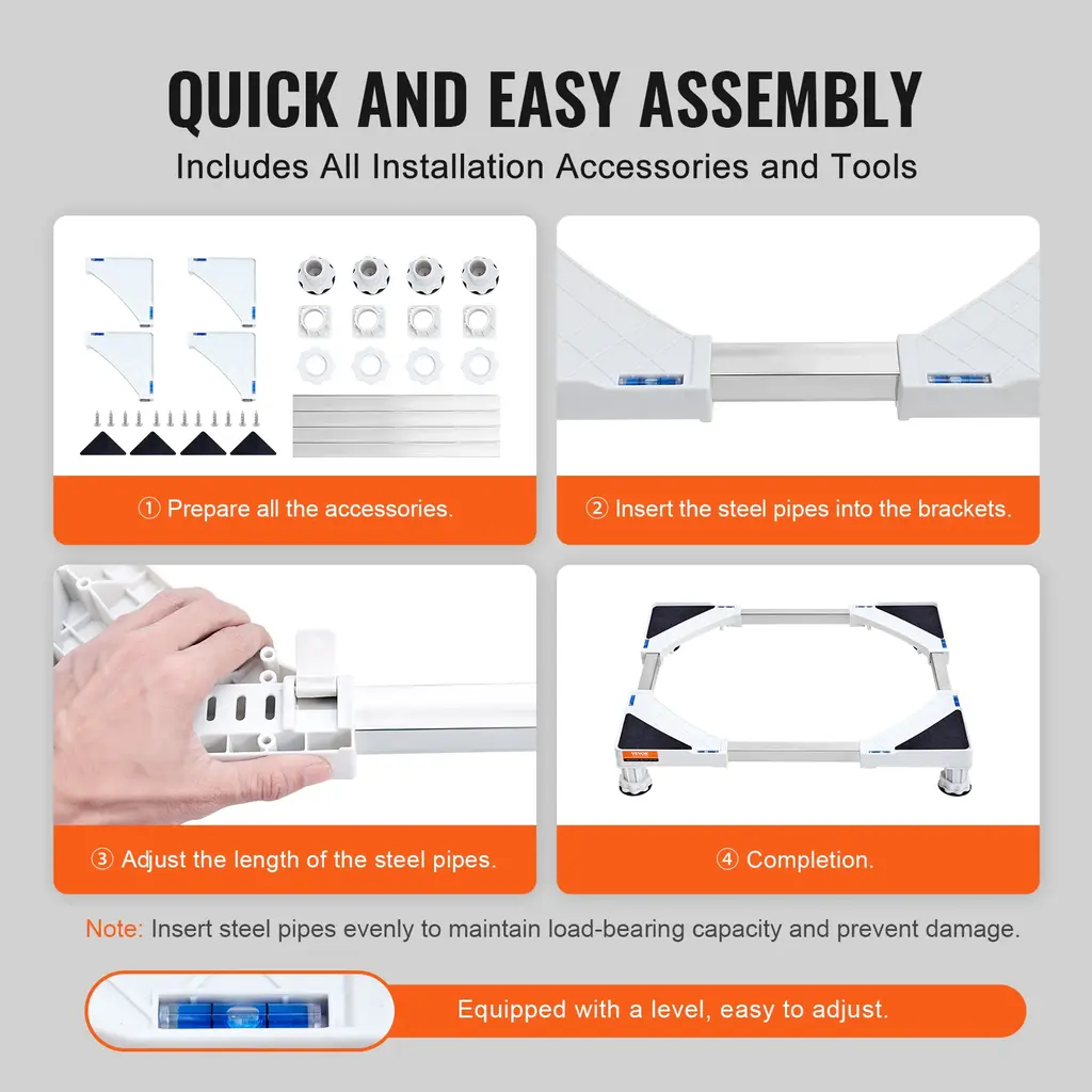 Sturdy and Durable Noise Reduction: Made from SPCC cold-rolled steel plate, the pedestal is extremely robust and can accommodate washing machines weighing up to 660 pounds (299.4 kg). Quick and Easy Assembly: The standard version is easy to install and comes with assembly instructions. You can easily assemble it on your own with just a screwdriver. Universally Compatible with Various Models: The intuitive design is suitable for all standard machines, including Samsung, LG, Whirlpool, General Electric, Miele, Electrolux, Bosch, and more. So you can confidently elevate your washing machine and dryer. Easier Laundry Days: The washing machine pedestal can lift your washer 16 inches (406.4 mm) off the damp floor, bringing it to a more ergonomic working height. This reduces the strain on your back and knees, allowing you to load clothes without excessive bending and maintaining the correct posture while doing laundry. Additional Storage Space (Drawer Version): The drawer model features a 20.5x16-inch (520x405mm) drawer, perfect for storing moisture-sensitive items while also acting as a dust shield, making your space appear neater. Built-in Spirit Level for Balance: Prevent appliances from tipping over with the included 8-level bubble level, ensuring that uneven floors do not cause balancing issues or potential damage to the appliance or pose a risk to children. Package Content Laundry Pedestal x 1 Instruction Manual x 1 Hex Wrench (Allen Key) x 1 Socket Wrench x 1 EVA Shock Absorption Pads x 4 Drawer Handle x 1 M6*12 Screws x 28 M10 Nuts x 28 M4*7 Screws x 2