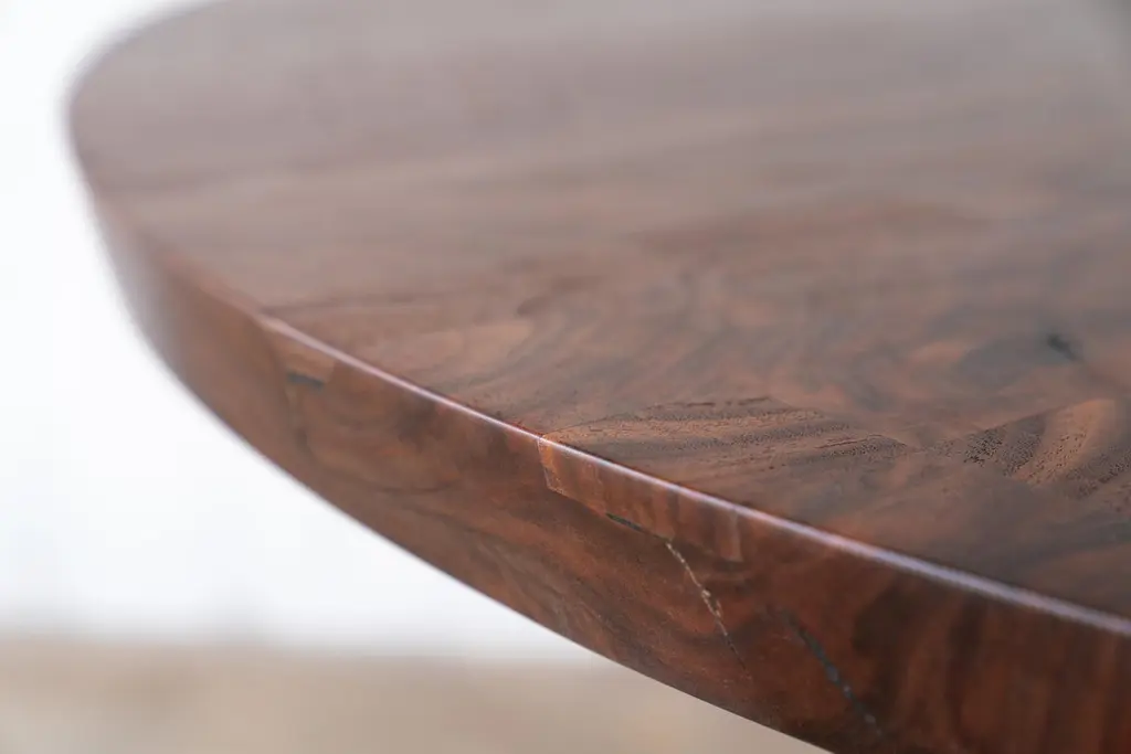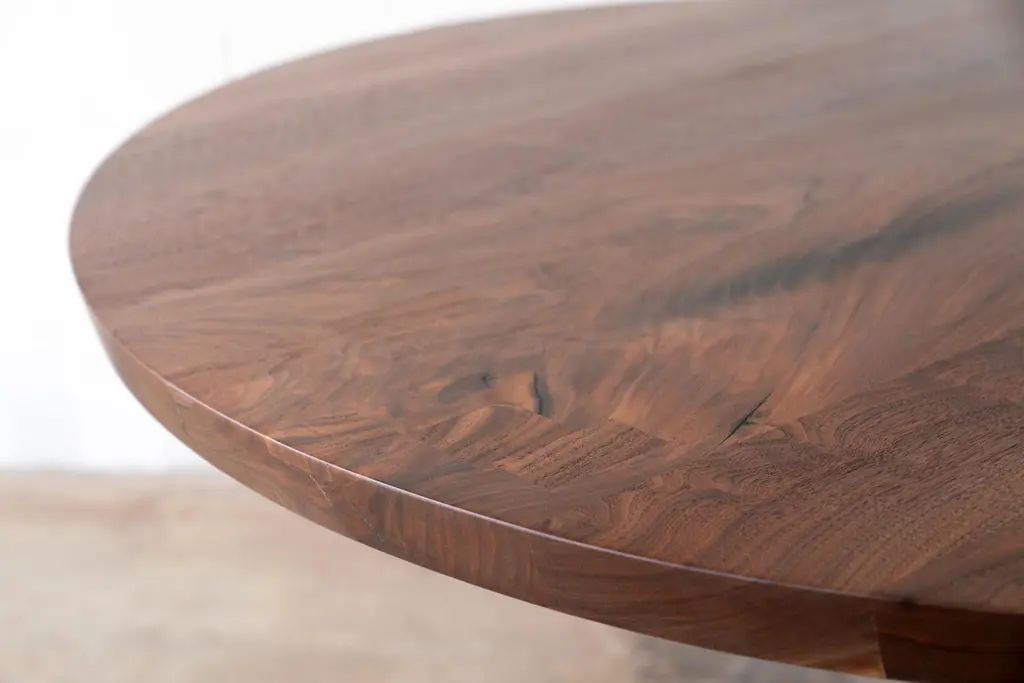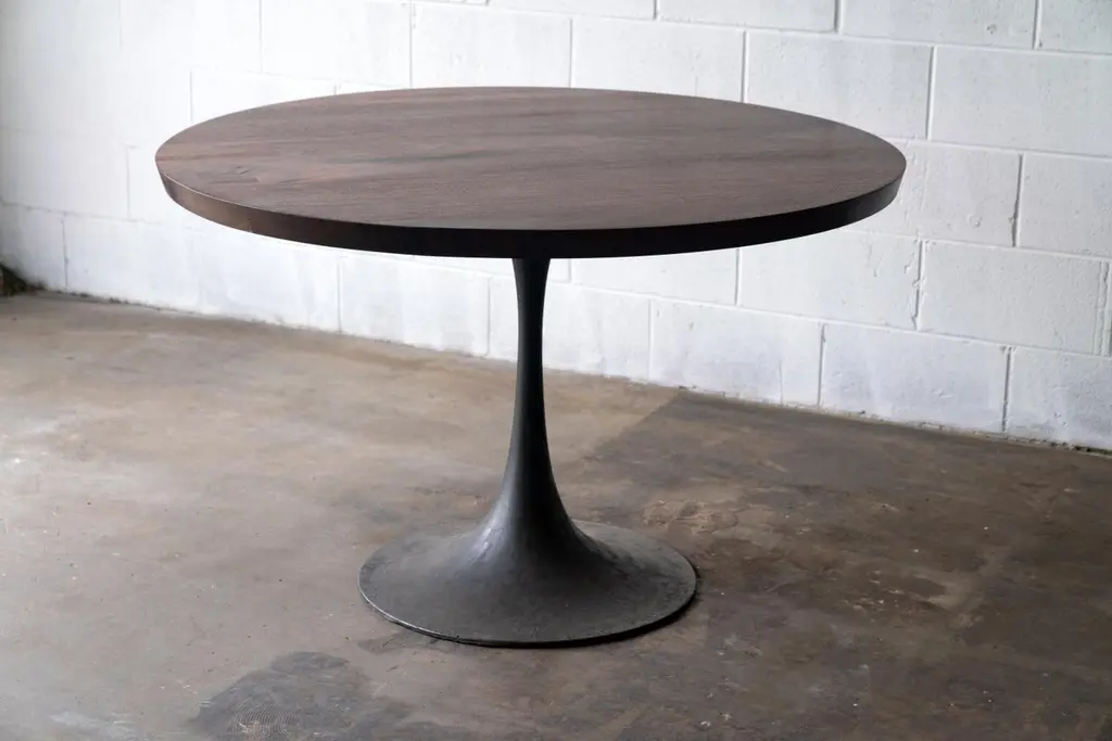 The Amicalola base captures the room set against a round or oval table top. This pedestal base is hand cast by the artisans at Sloss Furnaces historic foundry in Birmingham to look beautiful and function out of the way of diner's feet. Rich with Mid-Century Modern inspiration, we conceived the name while hiking the 600 steel stairs that scale the face of Amicalola Falls, the gateway to the Appalachian Trail. Solid walnut wood is finished with a durable, low-sheen urethane finish. A study in modern style and simplicity, the silhouette of the black patina base contrasts with the exuberant grain of each wide plank of solid walnut wood. Place this round table in a dining room, kitchen or entry hall. Urban wood means your furniture is better for the environment. Expert, American craftsmanship means it's tomorrow's heirloom. Wood is sourced and milled by Alabama Sawyer. Cast iron bases, also available in cast bronze at an additional charge, are designed by and cast exclusively for Alabama Sawyer via partnerships within our local artisan network.Urban wood has character. Walnut pieces may contain color variations ranging from deep brown to light yellow. Character can include variations in color and grain, small pin knots, evidence of historical intrusion. There may be cracks or knots that we fill, patch or join in a considered and artful way at the makers discretion. We look at every slab and decide what needs a patch or epoxy or both. Case by case, one may be more effective and better for the furniture, aesthetically, structurally, and for our process. Please note: If a specific tool, like a patch, is not desired, please specify this when ordering. This may require procuring different lumber which can alter costs. If color adjustment is requested on a completed piece after the fact, we will charge additional you for a custom stain.
