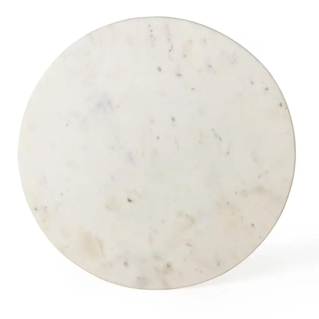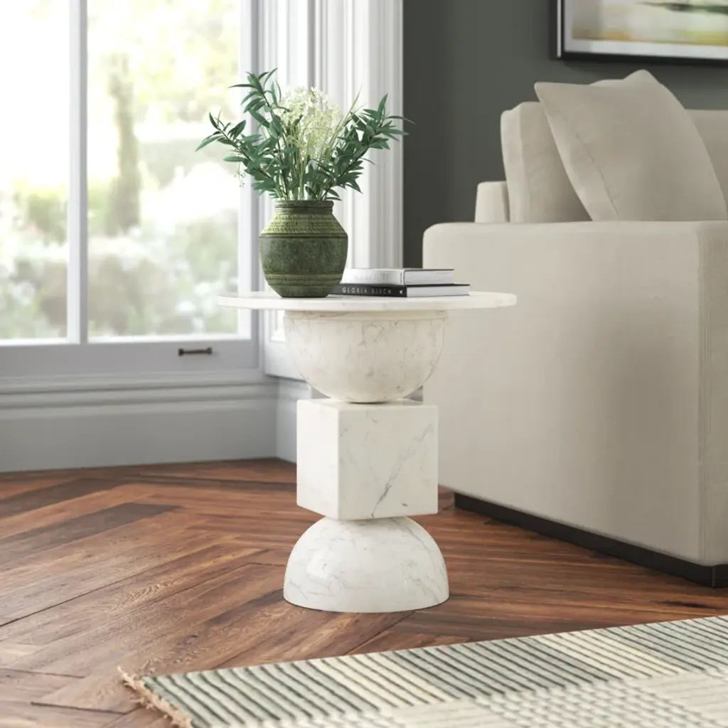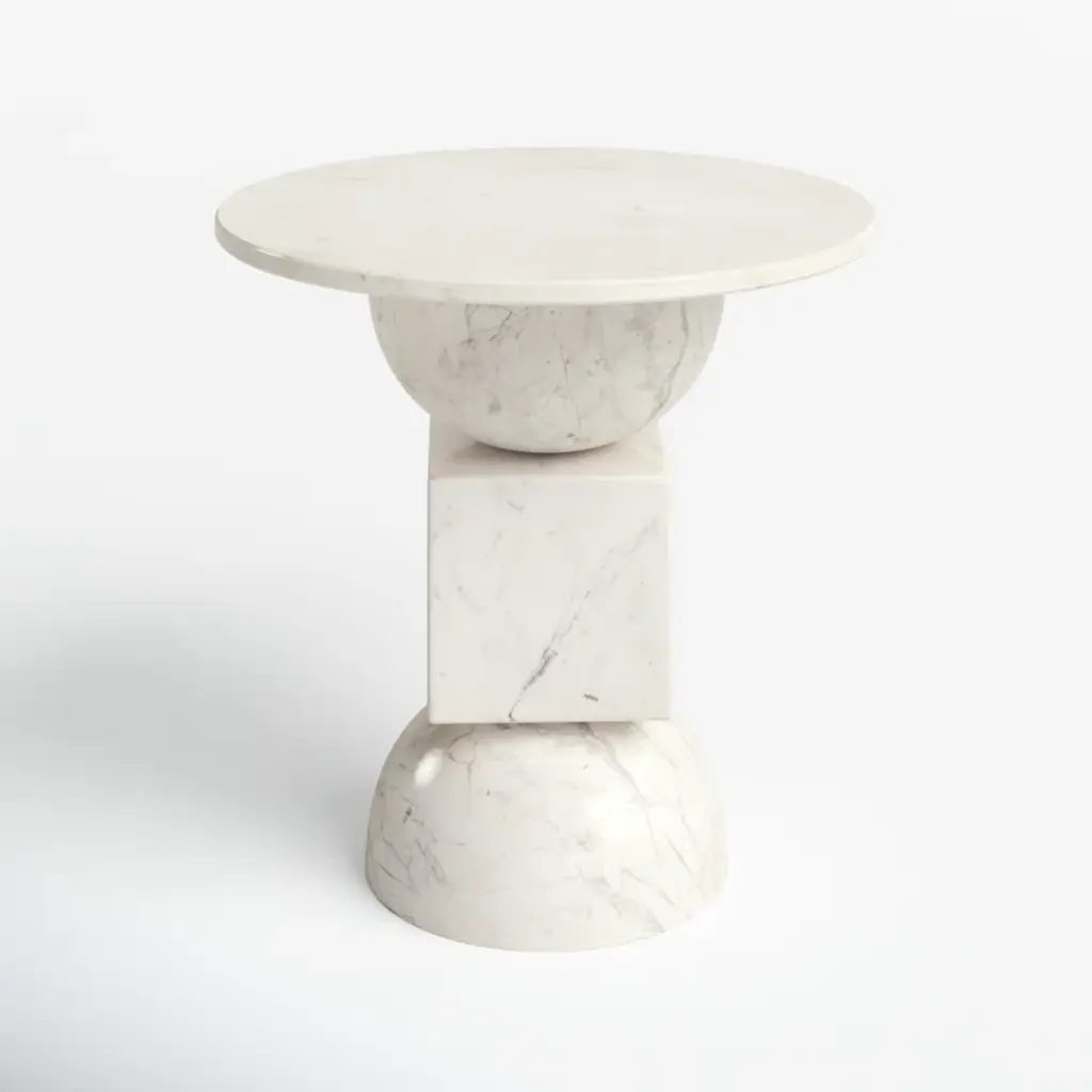 Shape up. The marble forms a stack-style end table of semicircles and squares, for a deco-inspired look with subtle eighties vibes.