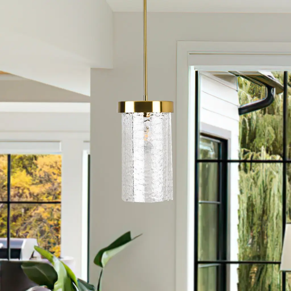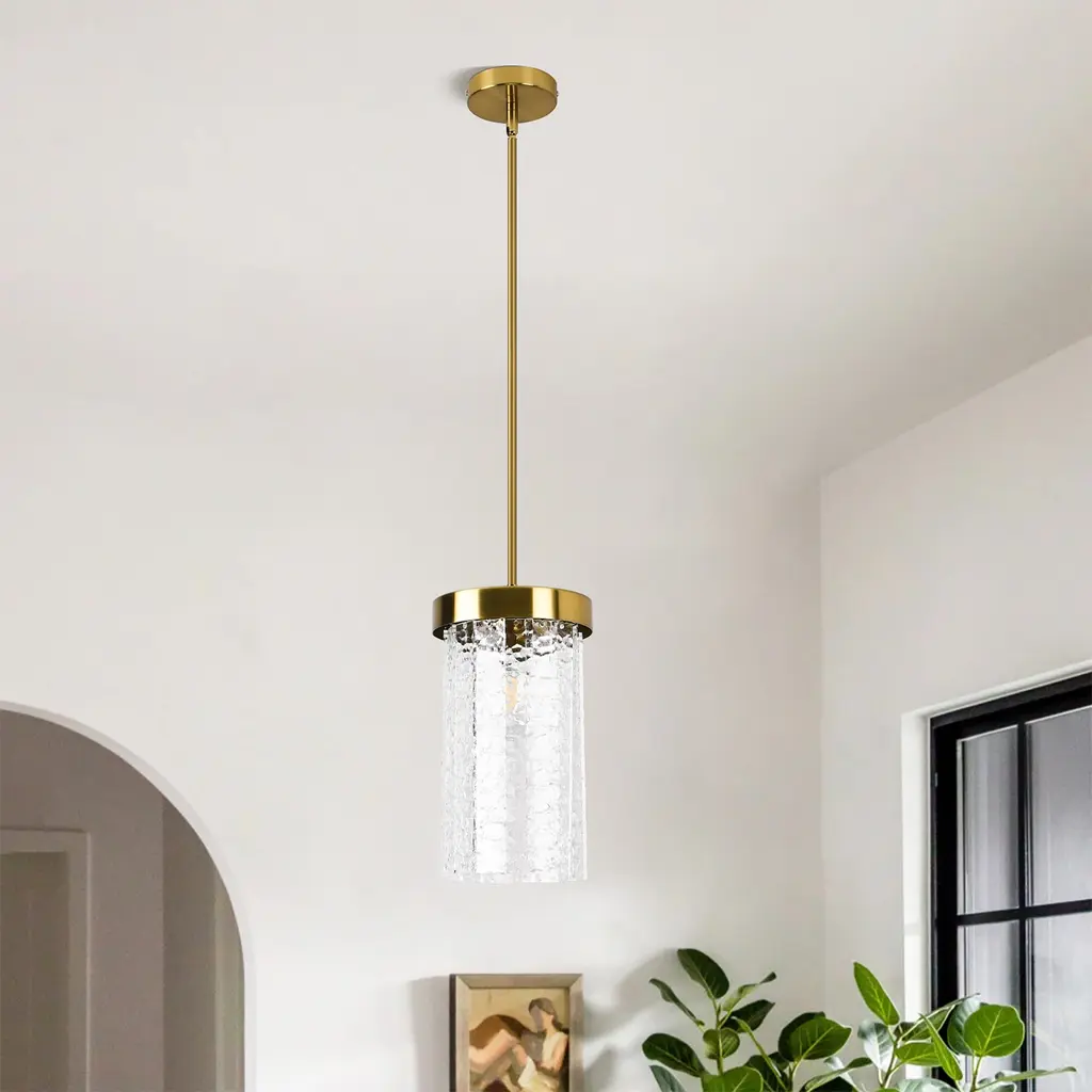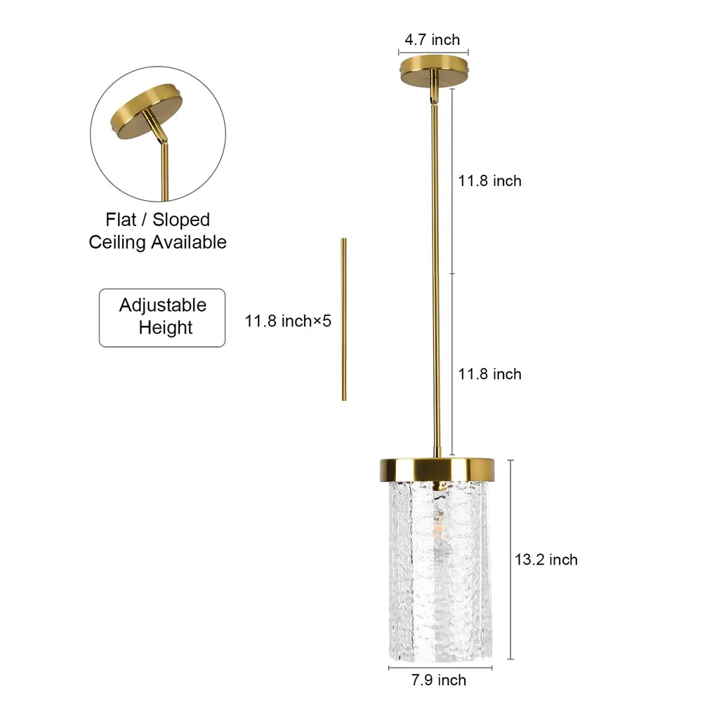 Detail:Illuminate your space with this elegant pendant light, designed to bring contemporary sophistication to kitchens, dining areas, or entryways. Featuring a single E26 bulb socket (bulb not included), it offers focused lighting ideal for both functional and decorative purposes. The textured hammered glass shade creates stunning light patterns while the sleek gold-finished metal frame adds a touch of modern luxury. With an adjustable height and compatibility with flat or sloped ceilings, this pendant light adapts seamlessly to various settings. Pair it with a dimmable bulb and dimmer switch to set the perfect mood in your space.Feature:
