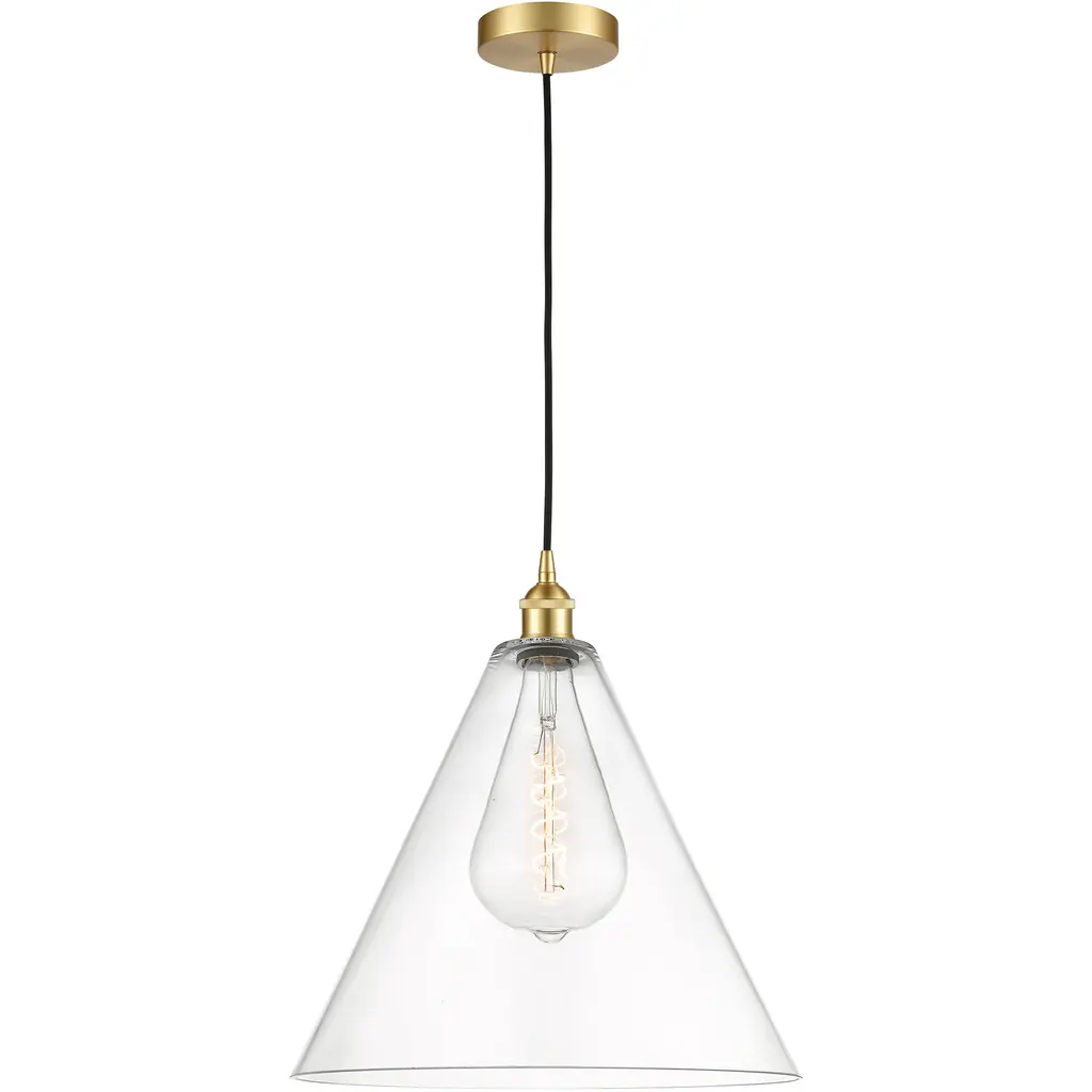 This playful 1 pendant light adds a touch of whimsy to any modern space. The funnel-shaped clear glass shade, paired with an aged brass finish, creates a striking visual contrast. Its clean lines and unique design make it a perfect choice for adding a touch of personality to your home or office. Product Features: Clear ceiling pendant Showcases funnel shaped clear glass design Accented with aged brass finish Uses (1) 100 watt max, Edison socket; bulbs not included 3-12" stems and 1-6" stem for adjustable installation Recommended for indoor use only Additional Features: Wattage: 100W Bulb Type: A19 Socket Type: E26 Bulb Quantity: 1 Dimension: Overall Height: 19" high Shade Dimension: 14" high x 14.5" diameter Canopy Dimension: 1" high x 5.75" diameter Wire Length: 15' long Material(s): metal/glass
