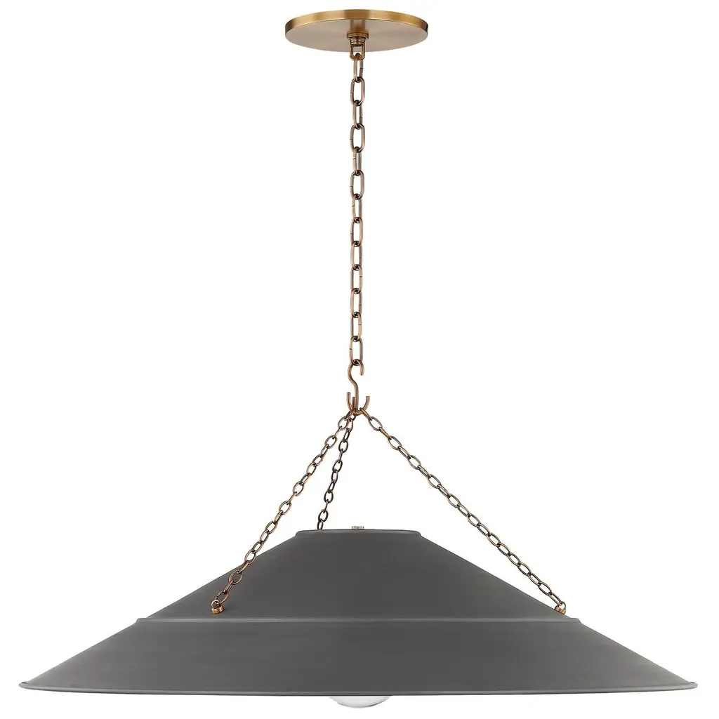 1-Light Metal Cone Pendant In Aged Brass With Painted Brass Interior And Rectangular Designer Chain - 28"w X 12.75"h