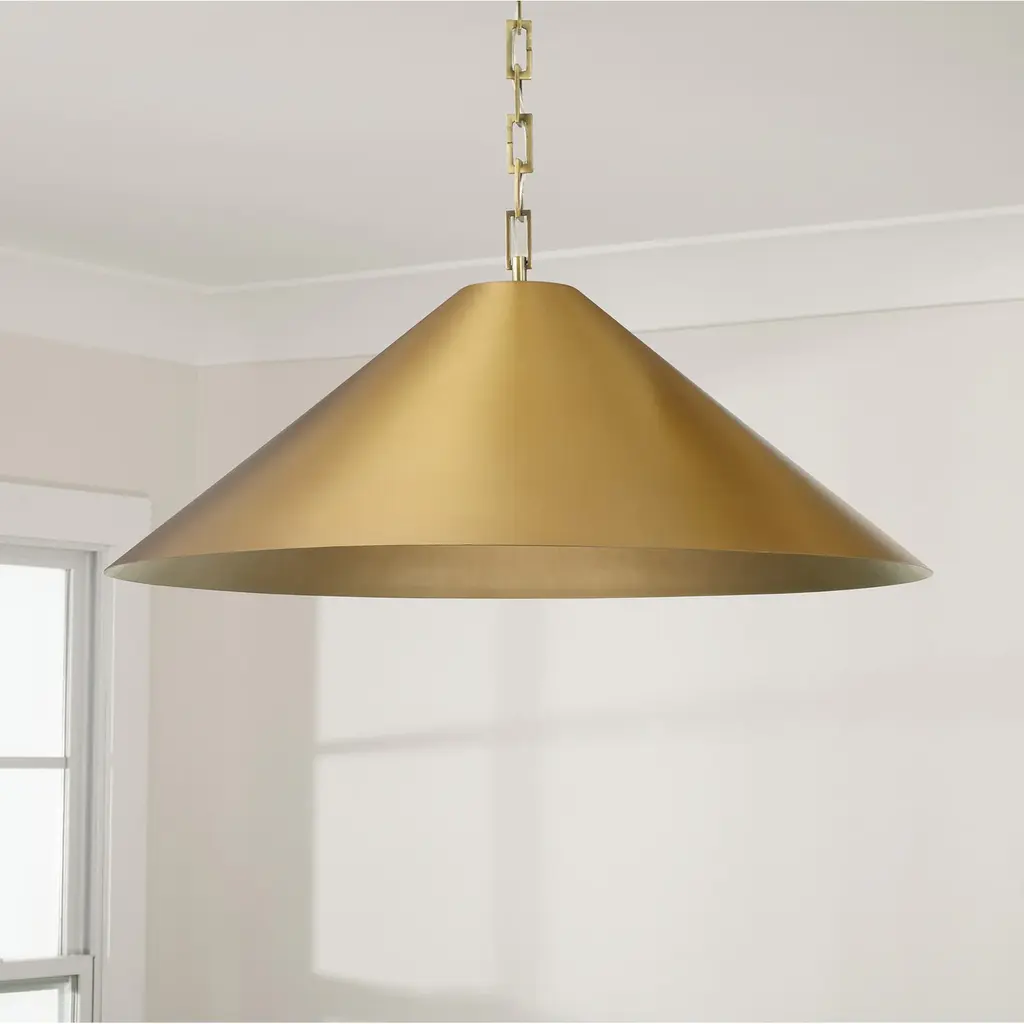 Both simple and stunning, the 20 Avery Medium Pendant brings captivating style to any space. The brushed Aged Brass finish adds dimension to the inch wide cone shape, while the unique rectangular decorative chain delivers high design detail.