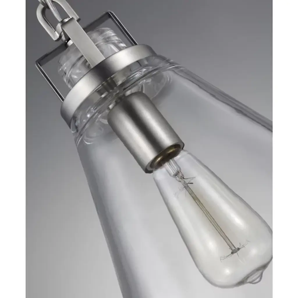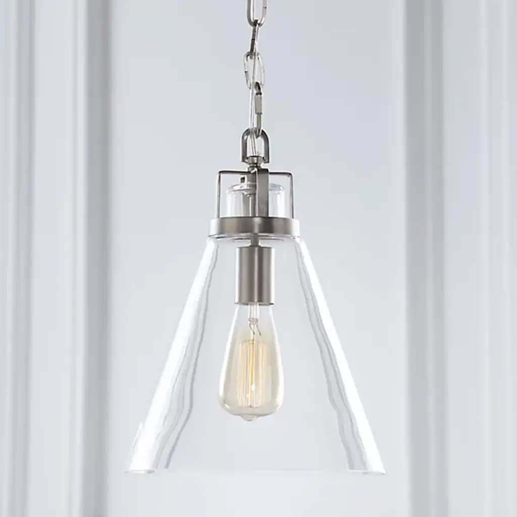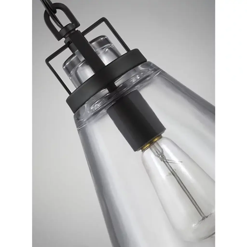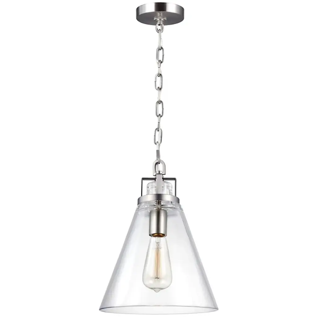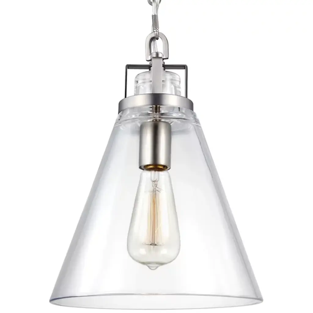 A vintage-inspired model revived with a modern upgrade. The Frontage Glass Pendant from Visual Comfort Studio, formerly known as Sean Lavin, is a new interpretation of the early century warehouse lights ubiquitous in their time. Made out of steel, the Frontage Glass Pendant captures the Edison-era lighting trend with its industrial frame detail. Beneath it is the traditional cone shaped body, now remade with a clear glass for dramatic contrast and diffused lighting. Edison-style bulbs are recommended to complement the industrial motif.