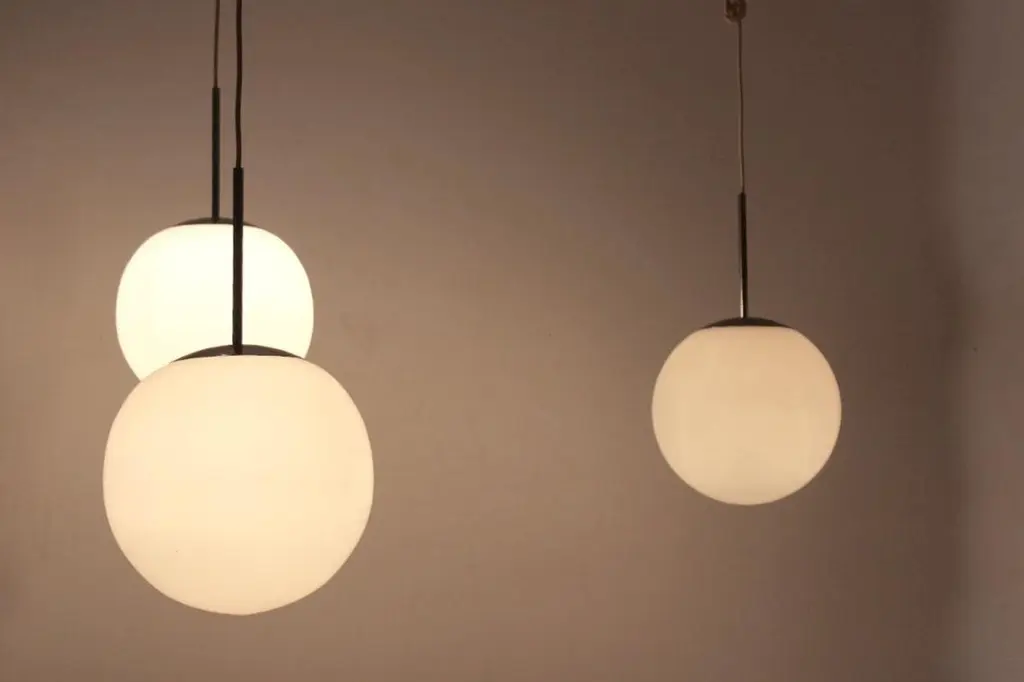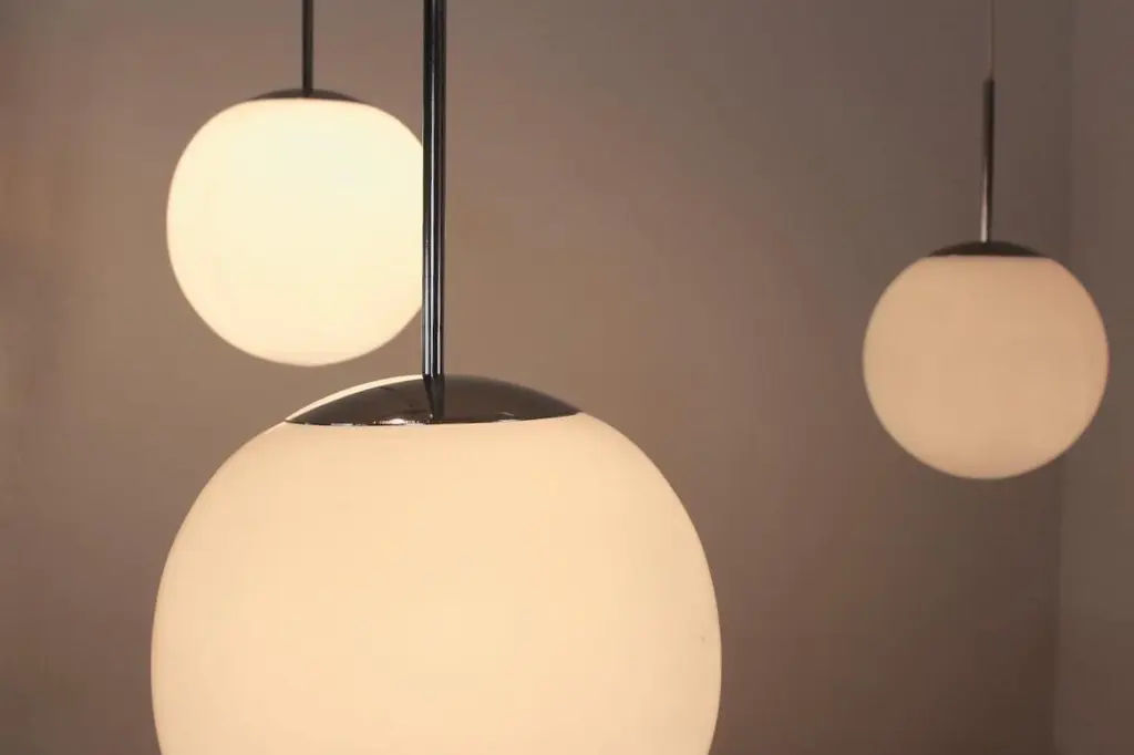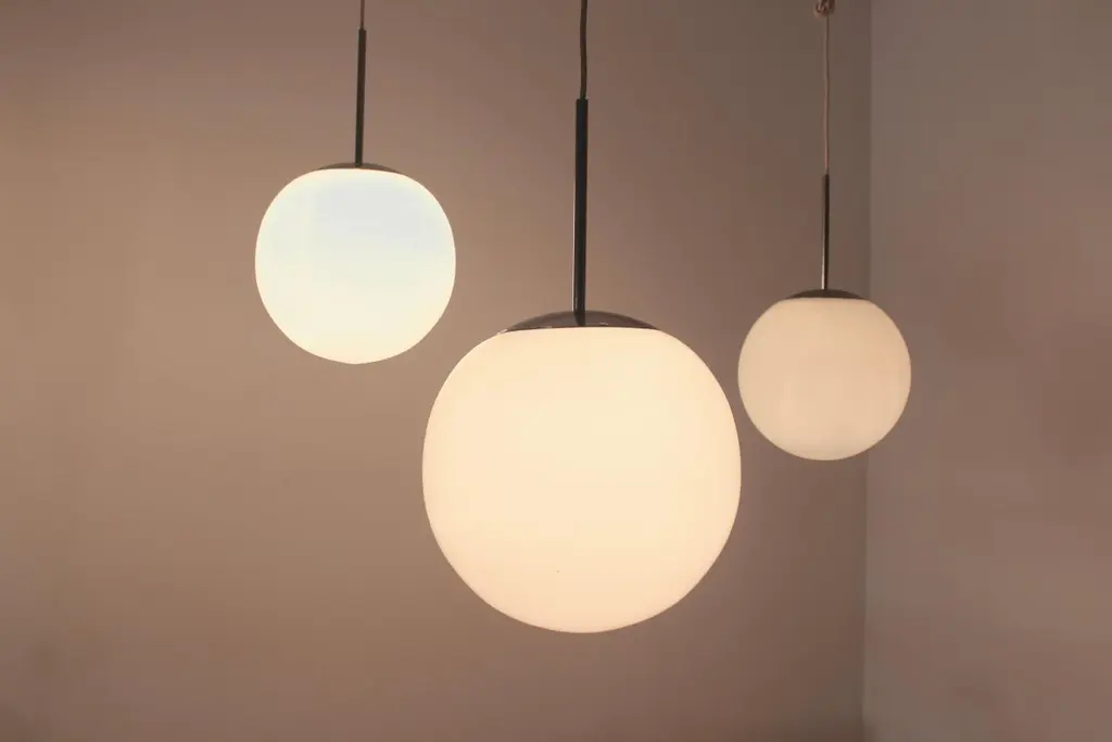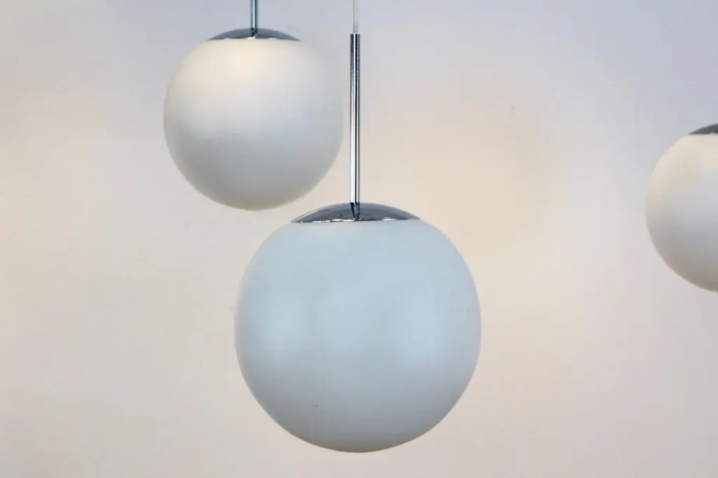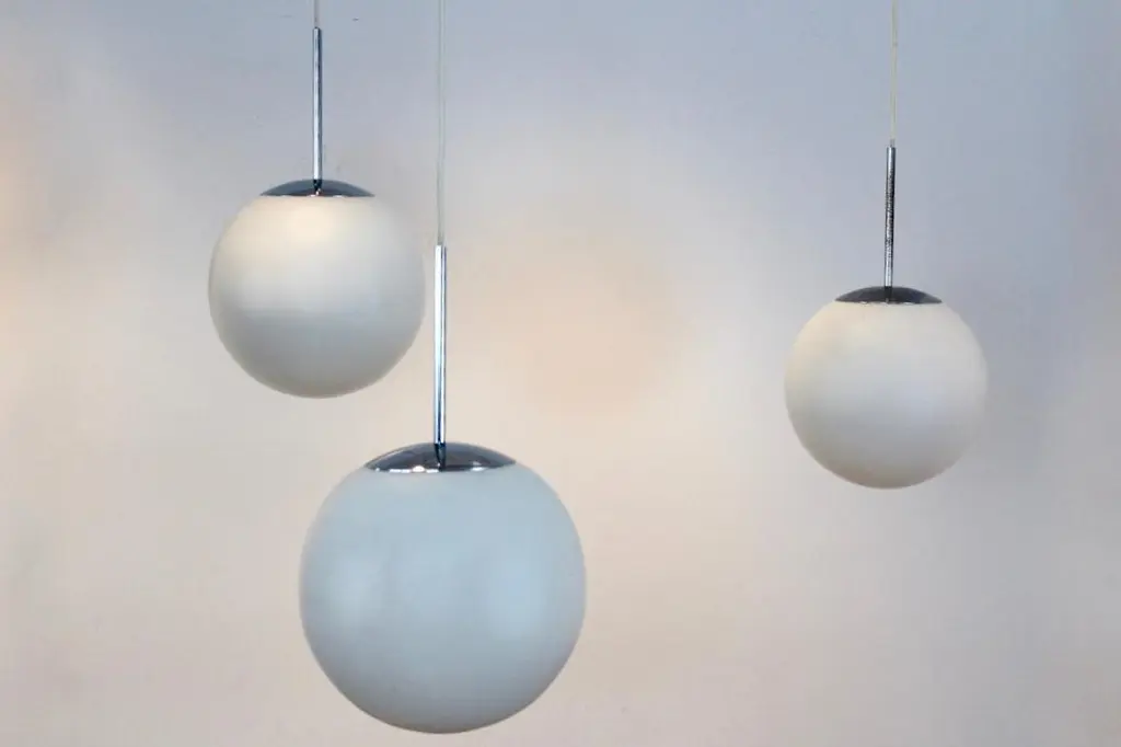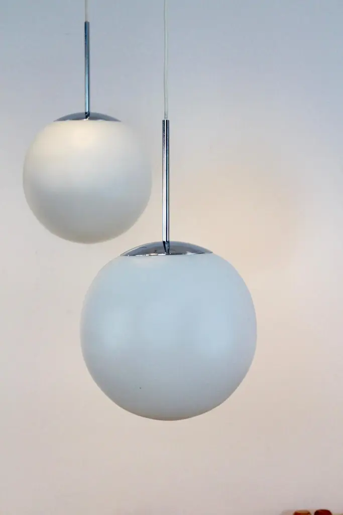 Iconic bubble pendant lamp manufactured by Peill & Putzler and the design is attributed to Wilhelm Wagenfeld in Germany in the 1960s. Comes in beautiful white frosted opal glass with chrome suspension. Made in Germany, lamp is labelled. The fixture requires 1 x E27 Standard bulb with 60W max. The current total Height can be easily adjusted for higher or lower ceiling (between 50-150 centimeters). The large but subtle pendant diffuses a soft ambient light, soothing you gently into higher realms. A single globe already creates an intimate atmosphere, multiple globes enhance this cosy effect, ideal for a hotel, lounge bar… or your personal zen area with soft glowing moons watching over your home planet. In very good condition.Twenty pieces available.