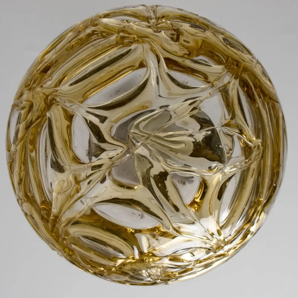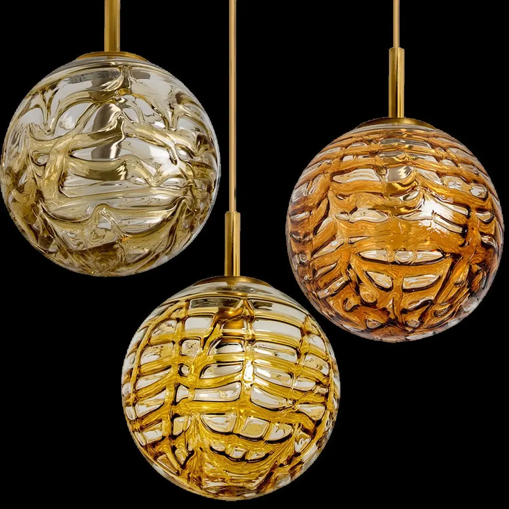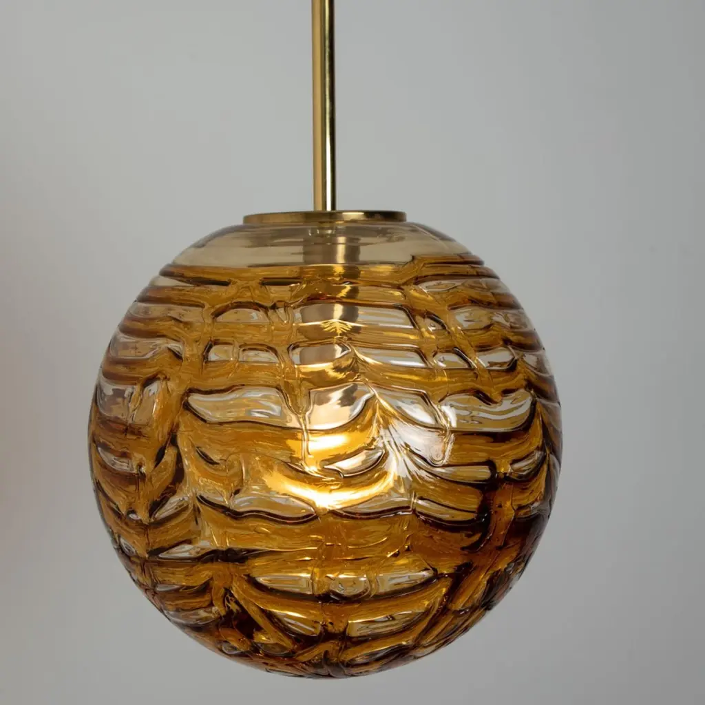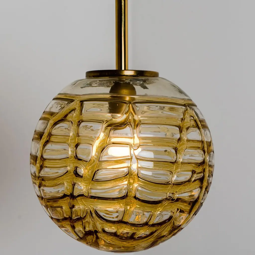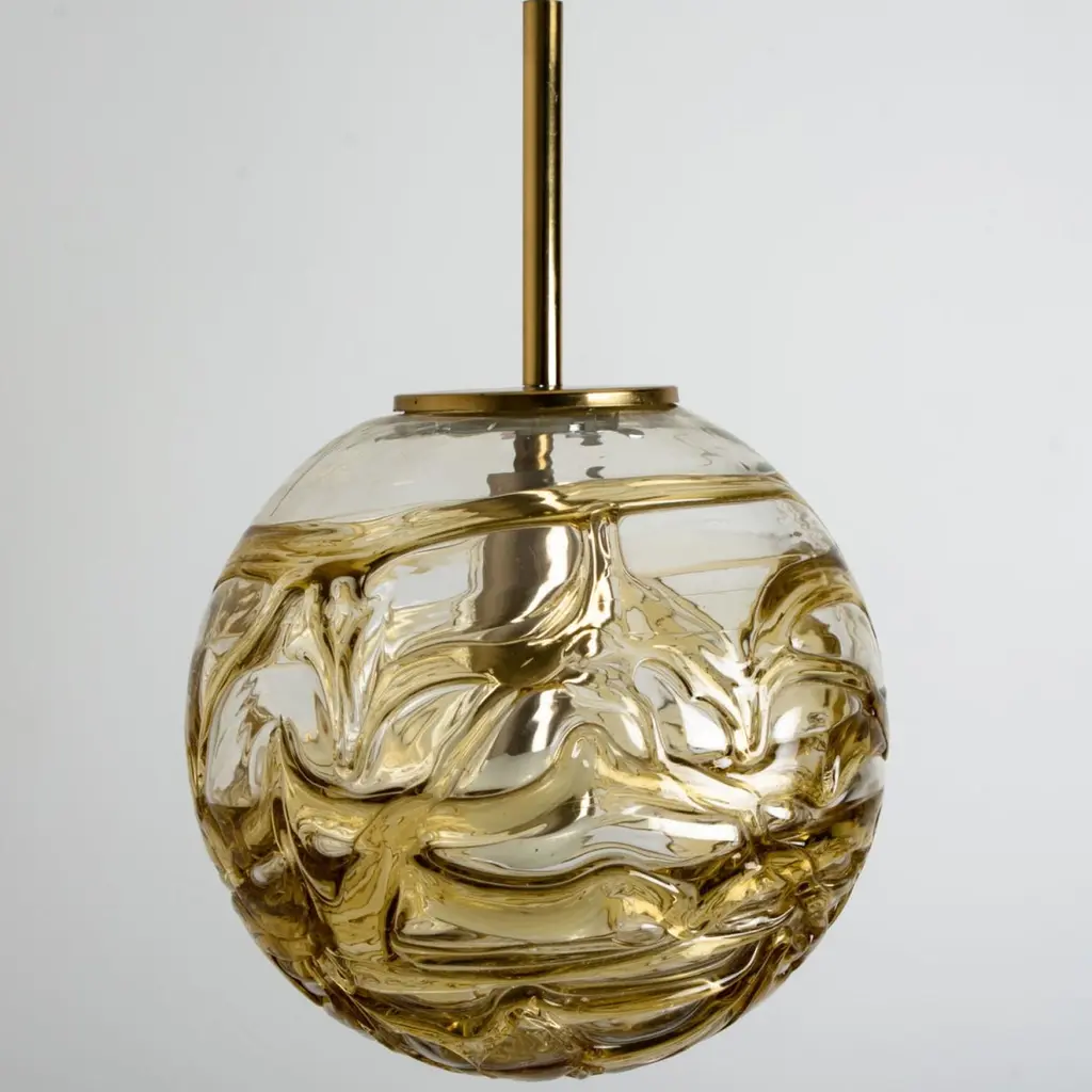 1 of the 3 Doria Leuchten globes (in collaboration with Murano) in the style of Venini, manufactured, circa 1960. Real statement piece.High-end thick Murano crystal glass shades made out of overlay glasses in the colors Taupe, Yellow and Orange, applied in irregular swirls. Mind blowing lighting effect when lit up!Doria received the German award for design excellence, IF (Industrieform) many times.In excellent vintage condition. The lights require a standard size bulb up to 100 watts each, LED compatible, we can deliver any length of cable or brass rod (see images).Pleas notice the price is for 1 piece. 3 pieces available.The stylish elegance and design suits mid century to Hollywood Regency interiors and combine very well with the work of Gio Ponti, Stilnovo Seguso and Vistosi.