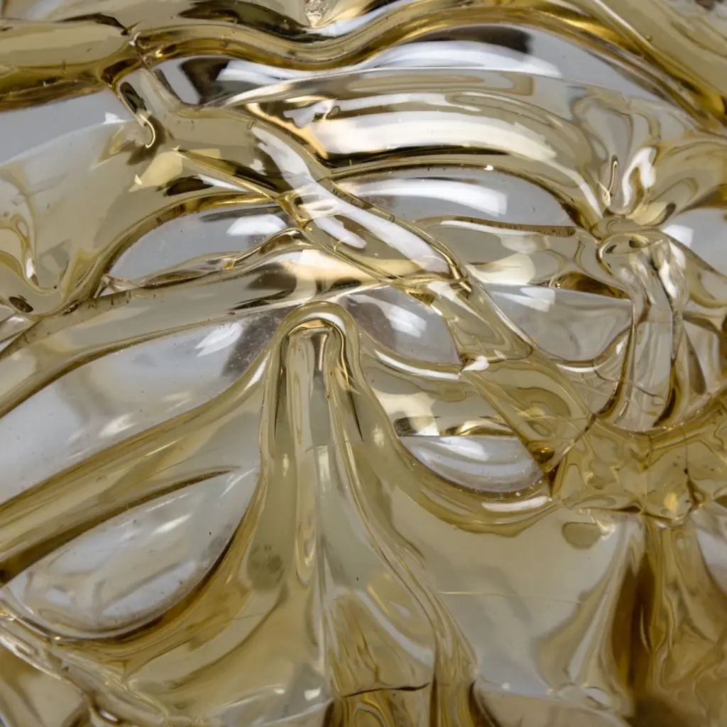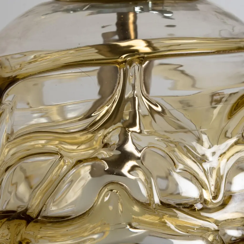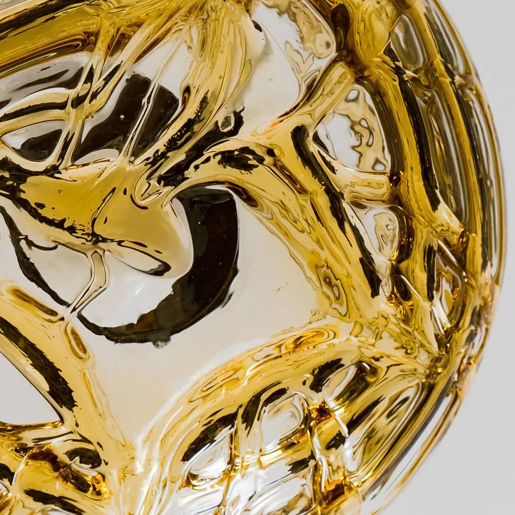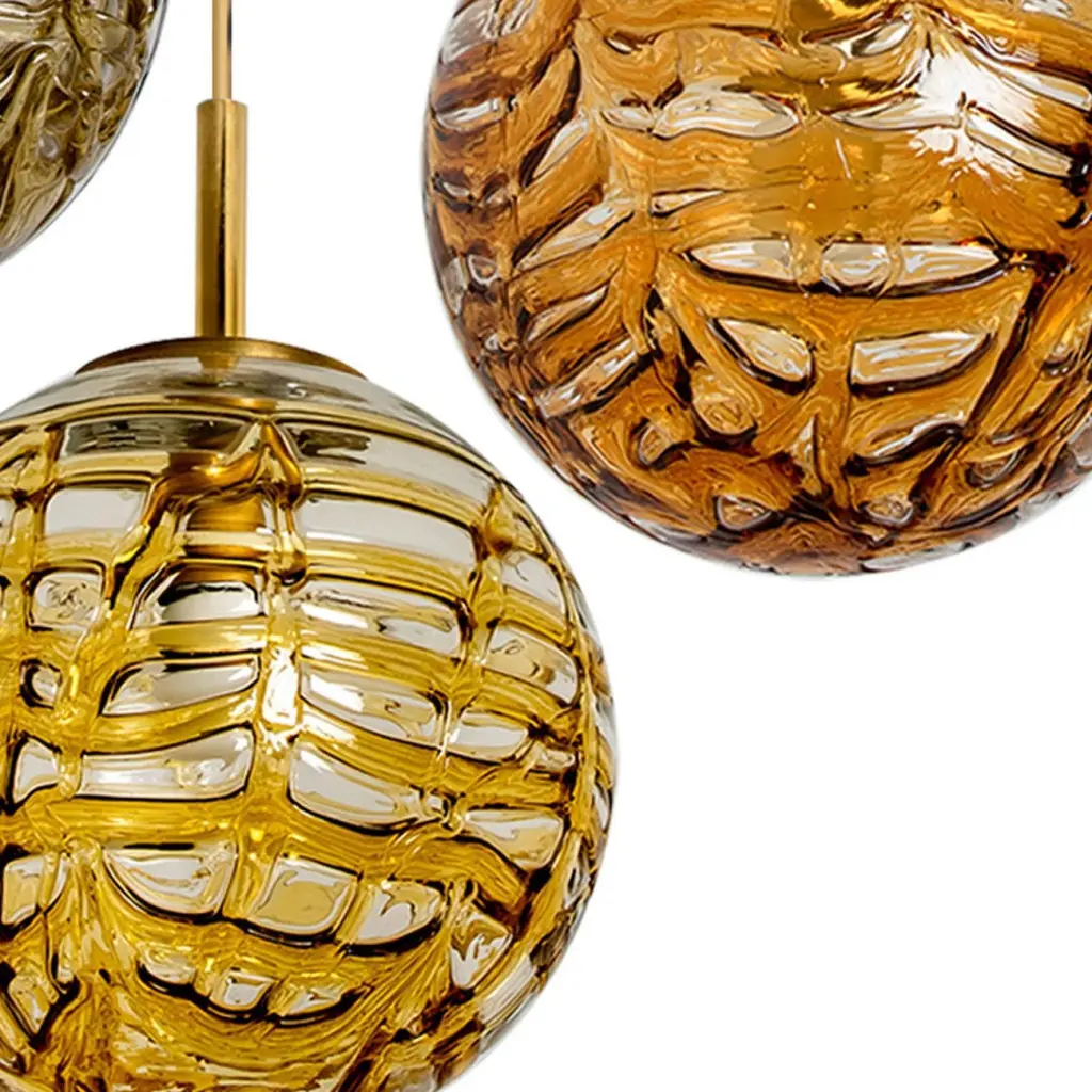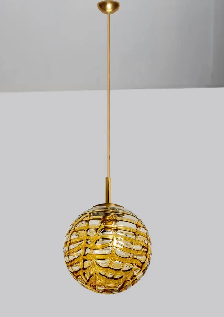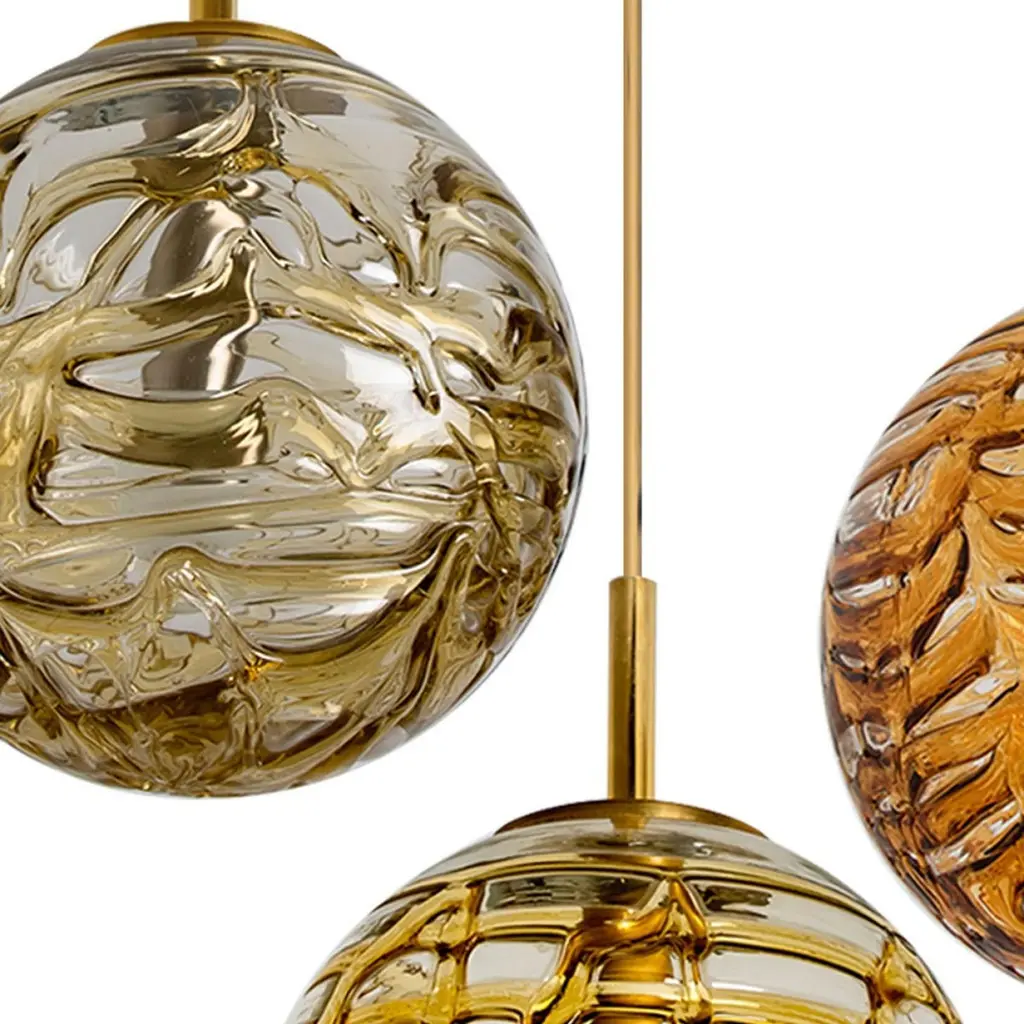 1 of the 3 Doria Leuchten globes (in collaboration with Murano) in the style of Venini, manufactured, circa 1960. Real statement piece.High-end thick Murano crystal glass shades made out of overlay glasses in the colors Taupe, Yellow and Orange, applied in irregular swirls. Mind blowing lighting effect when lit up!Doria received the German award for design excellence, IF (Industrieform) many times.In excellent vintage condition. The lights require a standard size bulb up to 100 watts each, LED compatible, we can deliver any length of cable or brass rod (see images).Pleas notice the price is for 1 piece. 3 pieces available.The stylish elegance and design suits mid century to Hollywood Regency interiors and combine very well with the work of Gio Ponti, Stilnovo Seguso and Vistosi.