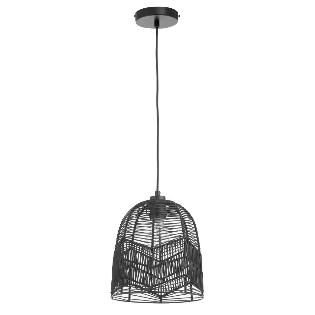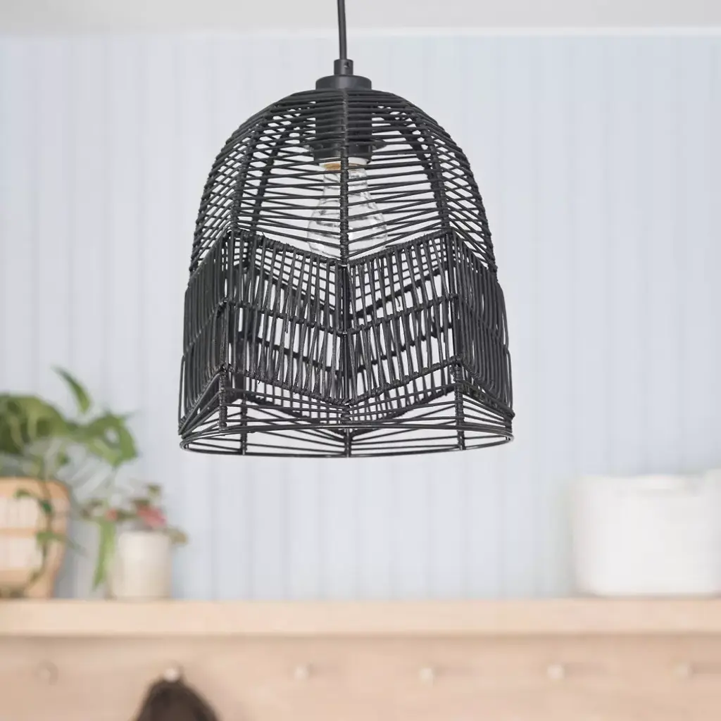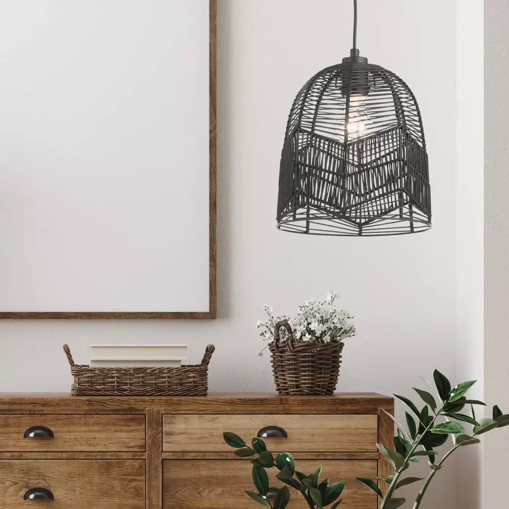 Bring relaxed modern style to a variety of spaces in your home with this 10" Zola Black Rattan Cloche Pendant Light. Featuring a black canopy, cord, fixture and shade, this chic pendant light combines the boho, beachy vibes of open-weave rattan with a modern sensibility thanks to the clean monochrome look. Compatible with LED, incandescent and CFL bulbs, it's a great choice for updating spaces from your mid-century modern living room to your contemporary open-concept kitchen. The adjustable-height design lets you find the perfect hanging height whether you're placing this cloche pendant light at a short distance from your ceiling or positioning for a dramatic drop above your dining table or kitchen island.