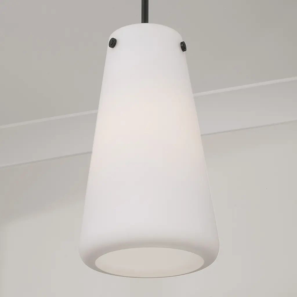 The Averitt Pendant delivers elegant transitional style with grand scale. The exposed rivet details and unique rounded, recessed bottom add high design to the elongated Soft White glass tapered shade, while the Matte Black finish creates sophisticated contrast.