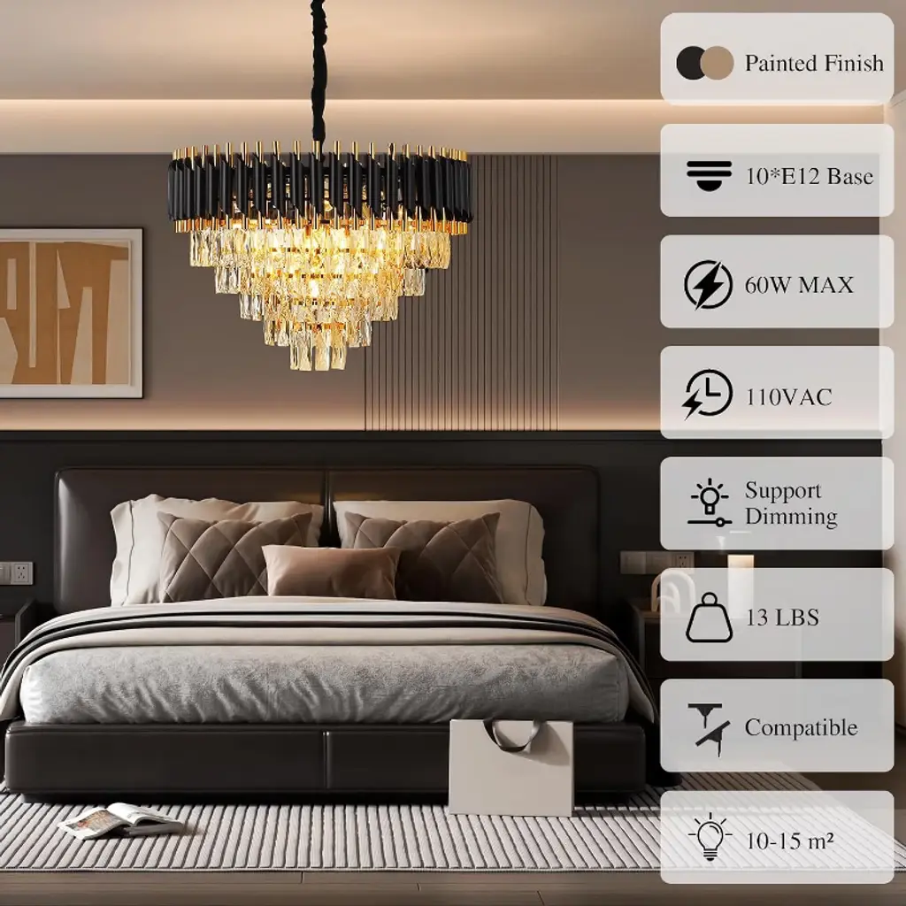 10 Light Crystal Hanging Pendant Lights 5 Tiers Black and Gold Pendant Light Fixtures with K9 Crystals & Steel Frame for Bedroom Dining Living Hallway