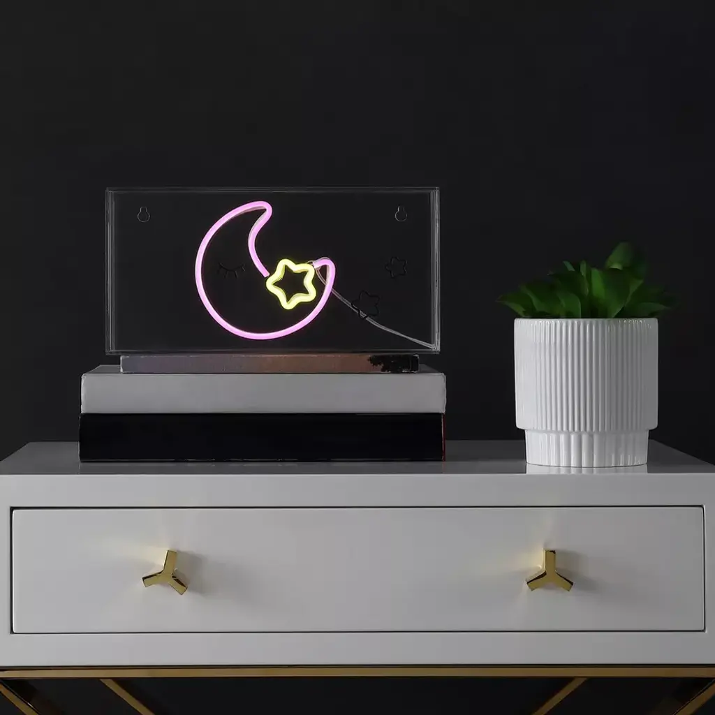 Bright neon makes a whimsical addition to your bookshelf or gallery wall. Use our Moon & Stars as a night light, or nursery wall decor. Convenient, low-voltage USB power is perfect for a bedroom or dorm room. Acrylic box frame has nail slots for hanging; plus it stands by itself on a shelf or table. Includes cable for safe, energy-efficient USB power - use a wall outlet or battery pack. Can be connected to a mobile power source or a computer. Built-in LED lights, so no bulbs are required . Before cleaning any lamp shade or fixture, disconnect the power source. Wipe with a soft, dry cloth. Avoid the use of chemicals and household cleaners as they may damage the finish.
