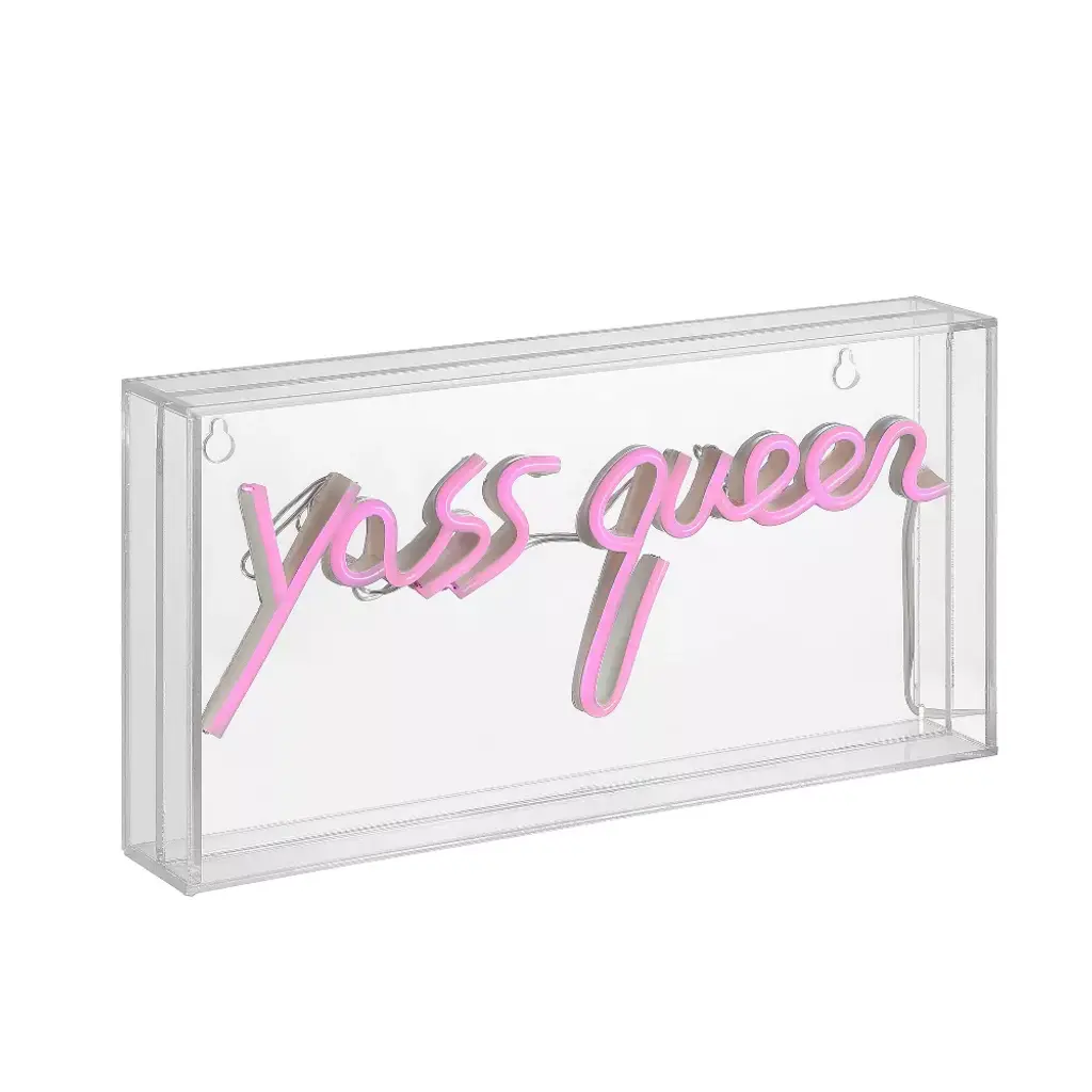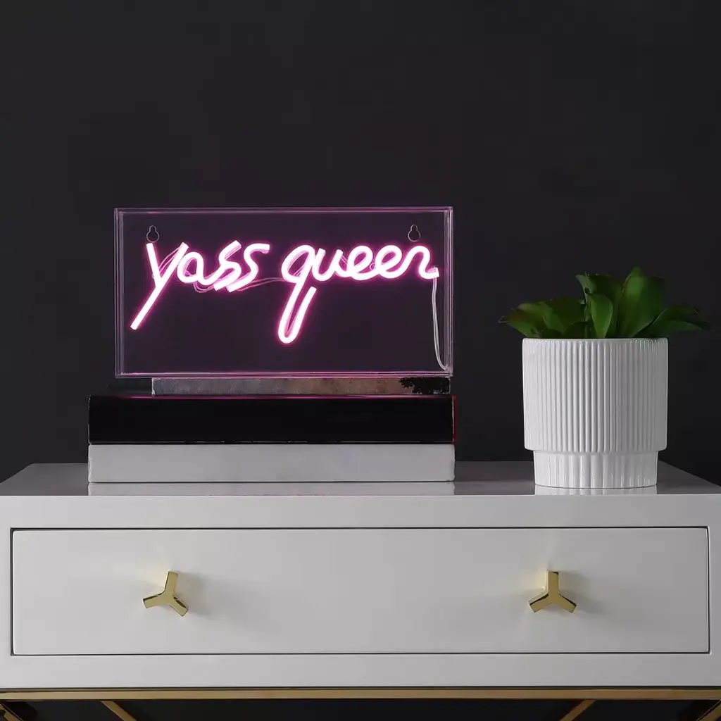 Bright neon makes a whimsical addition to your bookshelf or gallery wall. Whether your girl gang is eight or eighty, our Yass Queen sign makes a fun gift. Convenient, low-voltage USB power is perfect for a bedroom or dorm room. Acrylic box frame has nail slots for hanging; plus it stands by itself on a shelf or table. Includes cable for safe, energy-efficient USB power - use a wall outlet or battery pack. Can be connected to a mobile power source or a computer. Built-in LED lights, so no bulbs are required. Before cleaning any lamp shade or fixture, disconnect the power source. Wipe with a soft, dry cloth. Avoid the use of chemicals and household cleaners as they may damage the finish.