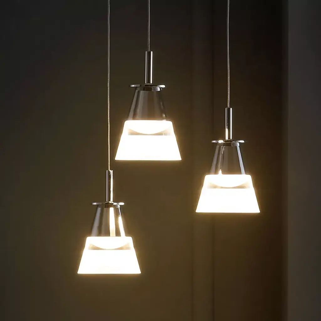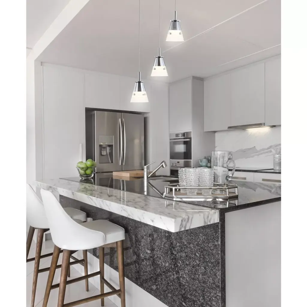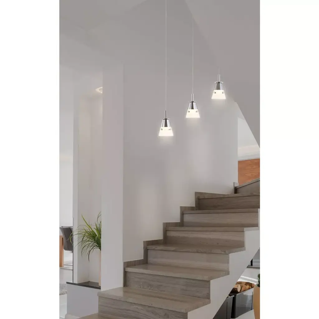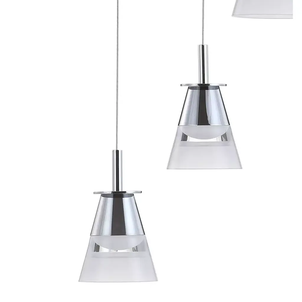A sparkling chrome finish is central to the design of this contemporary ceiling fixture. Its glass and chrome pendants hang at different heights for a cascading effect. Use it over a kitchen island, dining area, or bar. The unique design of the frosted glass pendant shades feature a chrome base and accent band, for a two-toned effect. With its adjustable height, this ceiling fixture allows for many creative applications - try hanging two or three in a row over a long table. As this fixture must be hardwired, we recommend a professional electrician manage installation. Dimmable built-in LED lights, so no bulbs are required. ETL Listed. Before cleaning any lamp shade or fixture, disconnect the power source. Wipe with a soft, dry cloth. Avoid the use of chemicals and household cleaners as they may damage the finish.