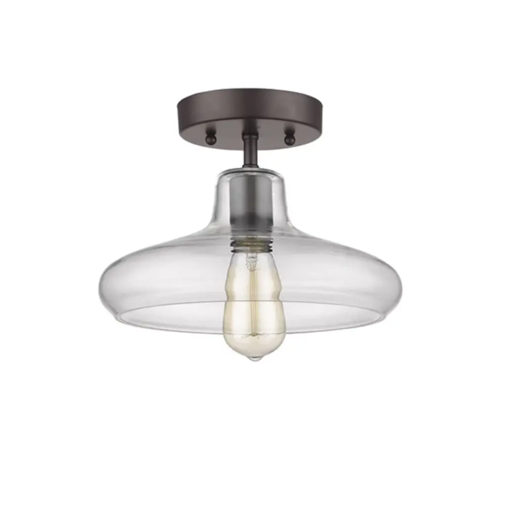 Add a stylish lighting fixture to your home with this semi-flush ceiling lamp. Made of metal and glass, this lamp has a matte black finish. This lamp holds one 60-watt bulb to provide soft but ample lighting, and the glass bowl shade is banded in black to provide a bold contrast and a clean, contemporary look.