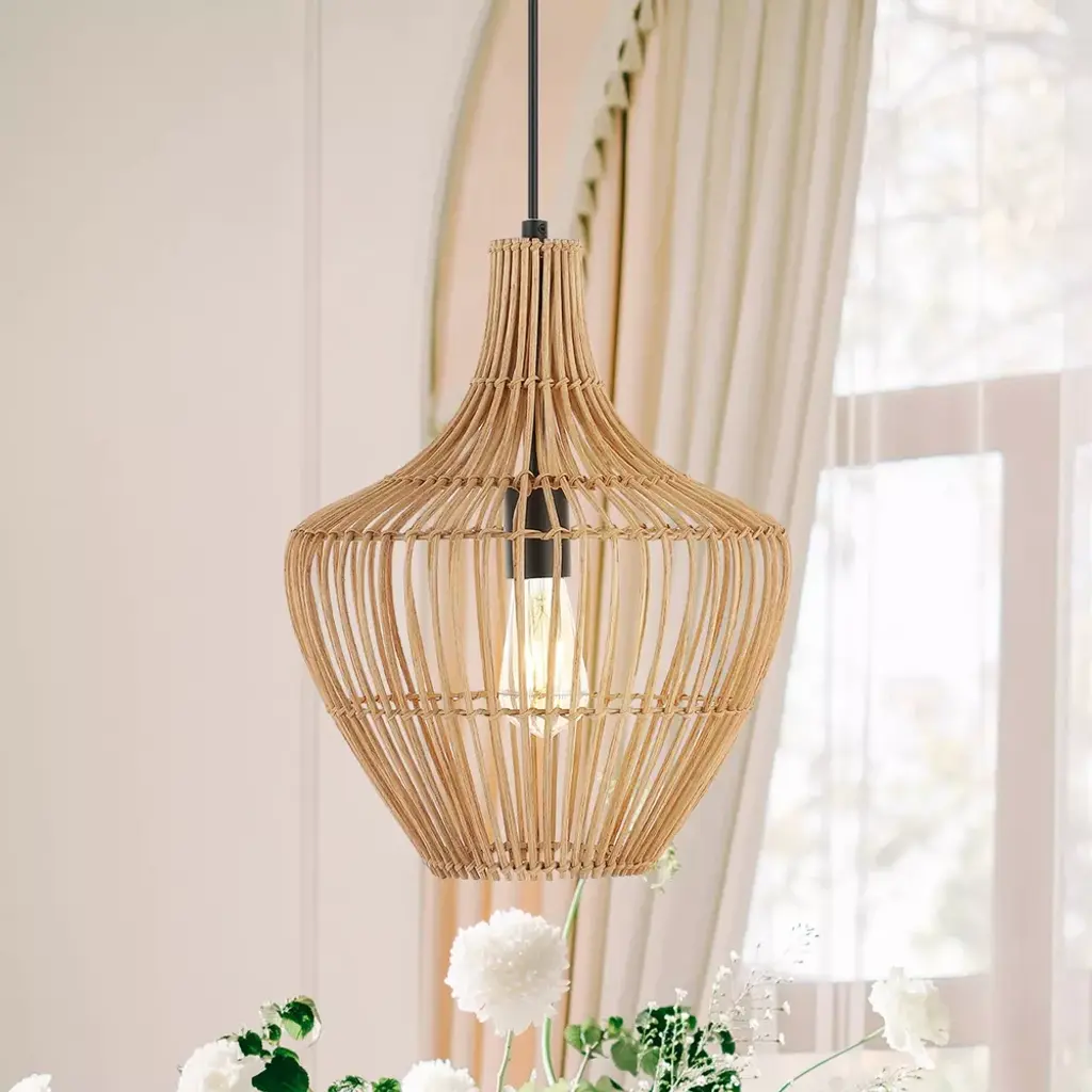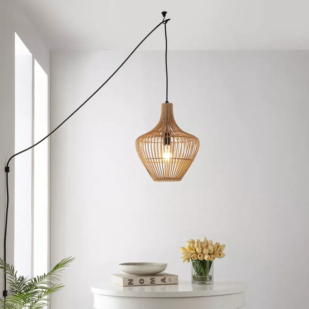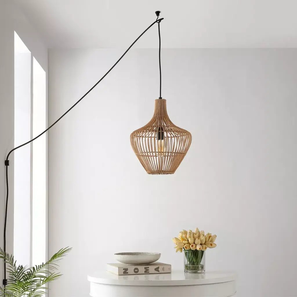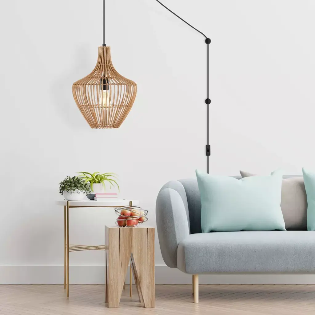 This 13" teardrop swag light is a mid-century classic made from natural woven rattan for an earth-themed atmosphere. Adjustable-height pendant works best for ceilings up to fourteen-feet high. Replace outdated pendant lighting for an earthy yet modern update; can be plugged in or hardwired. Eco-friendly 4W LED bulb included. Takes 1 bulb and compatible with TYPE "A" 60W or CFL 13W or LED 9WBefore cleaning any lamp shade or fixture, disconnect the power source. Wipe with a soft, dry cloth. Avoid the use of chemicals and household cleaners as they may damage the finish.