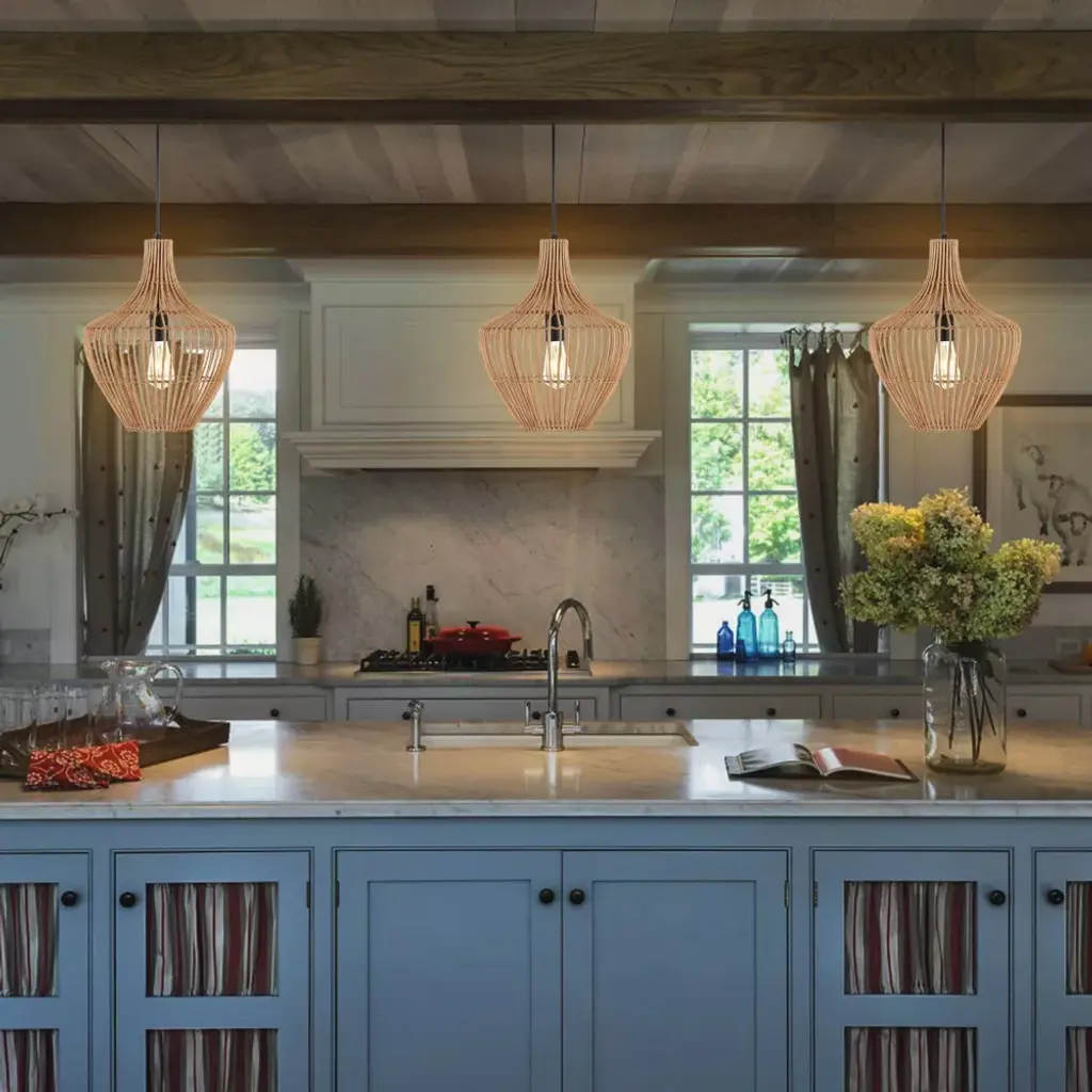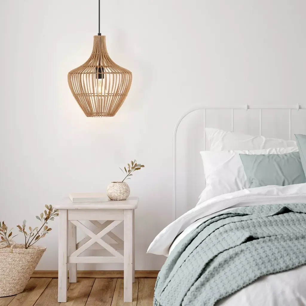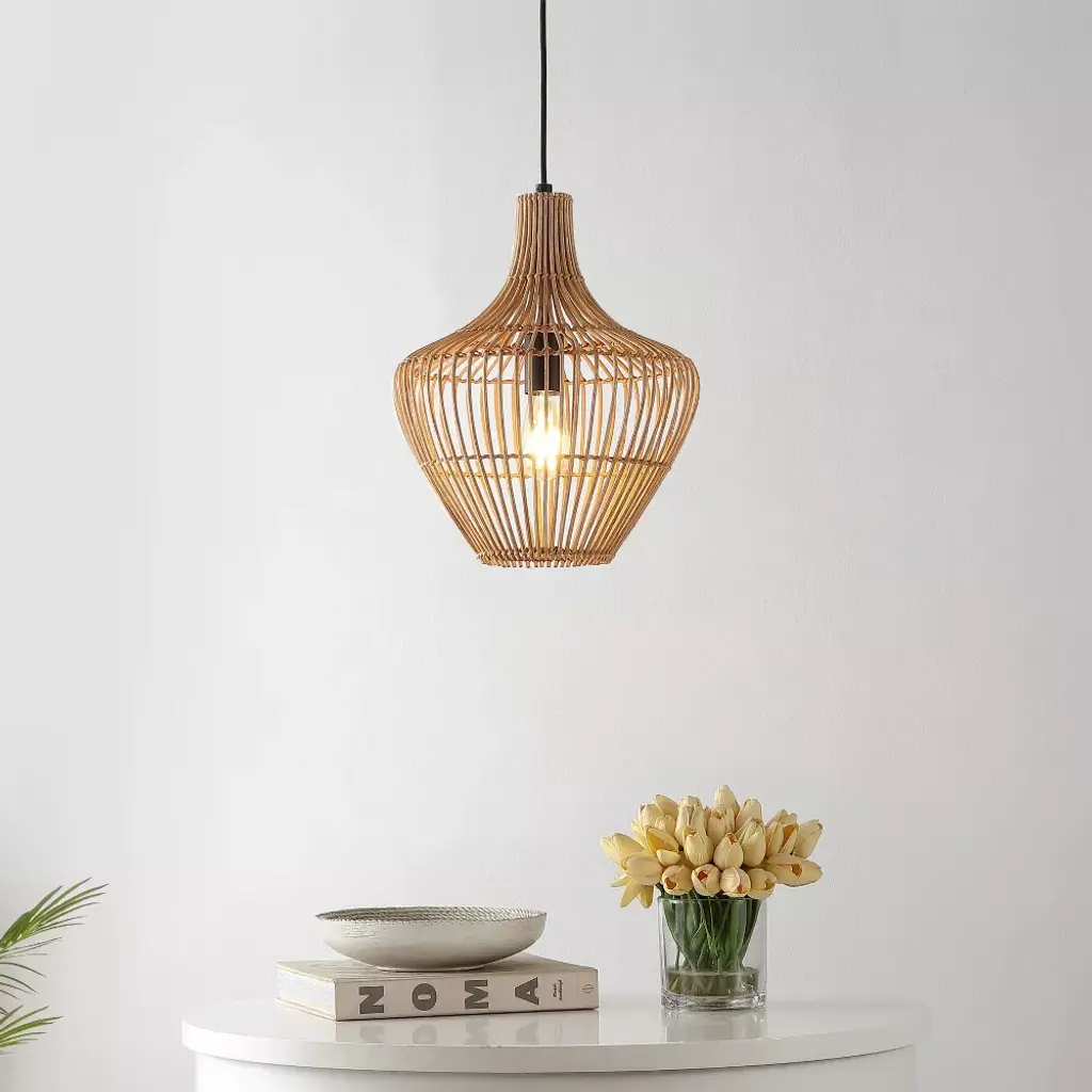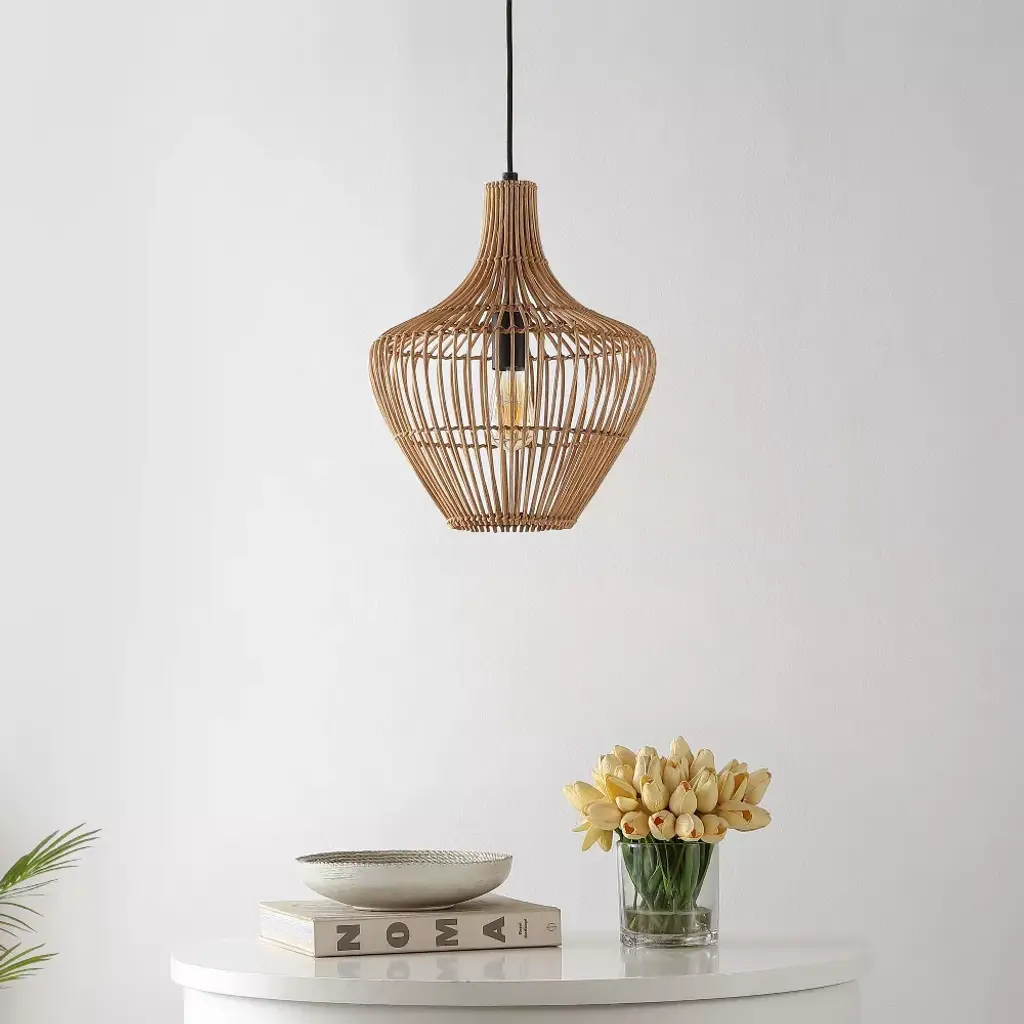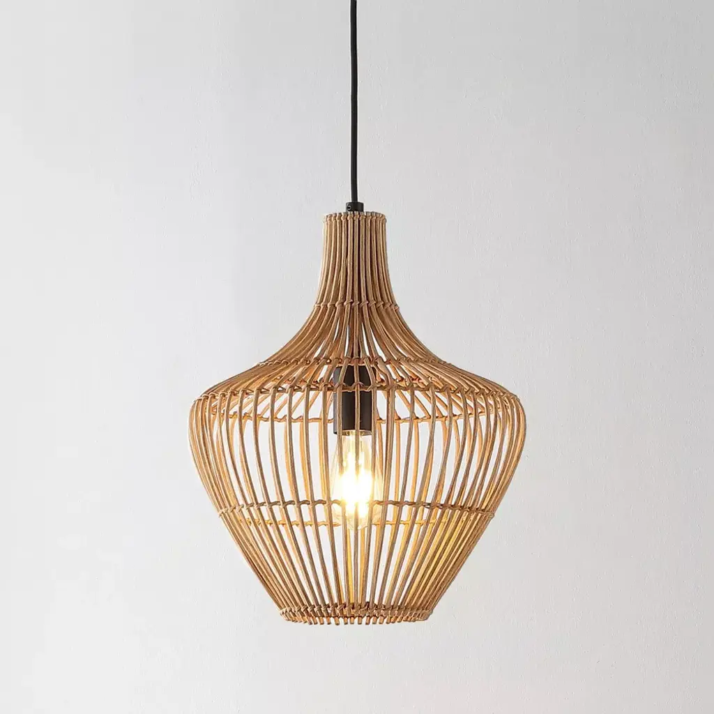 This 13" teardrop swag light is a mid-century classic made from natural woven rattan for an earth-themed atmosphere. Adjustable-height pendant works best for ceilings up to fourteen-feet high. Replace outdated pendant lighting for an earthy yet modern update; can be plugged in or hardwired. Eco-friendly 4W LED bulb included. Takes 1 bulb and compatible with TYPE "A" 60W or CFL 13W or LED 9WBefore cleaning any lamp shade or fixture, disconnect the power source. Wipe with a soft, dry cloth. Avoid the use of chemicals and household cleaners as they may damage the finish.