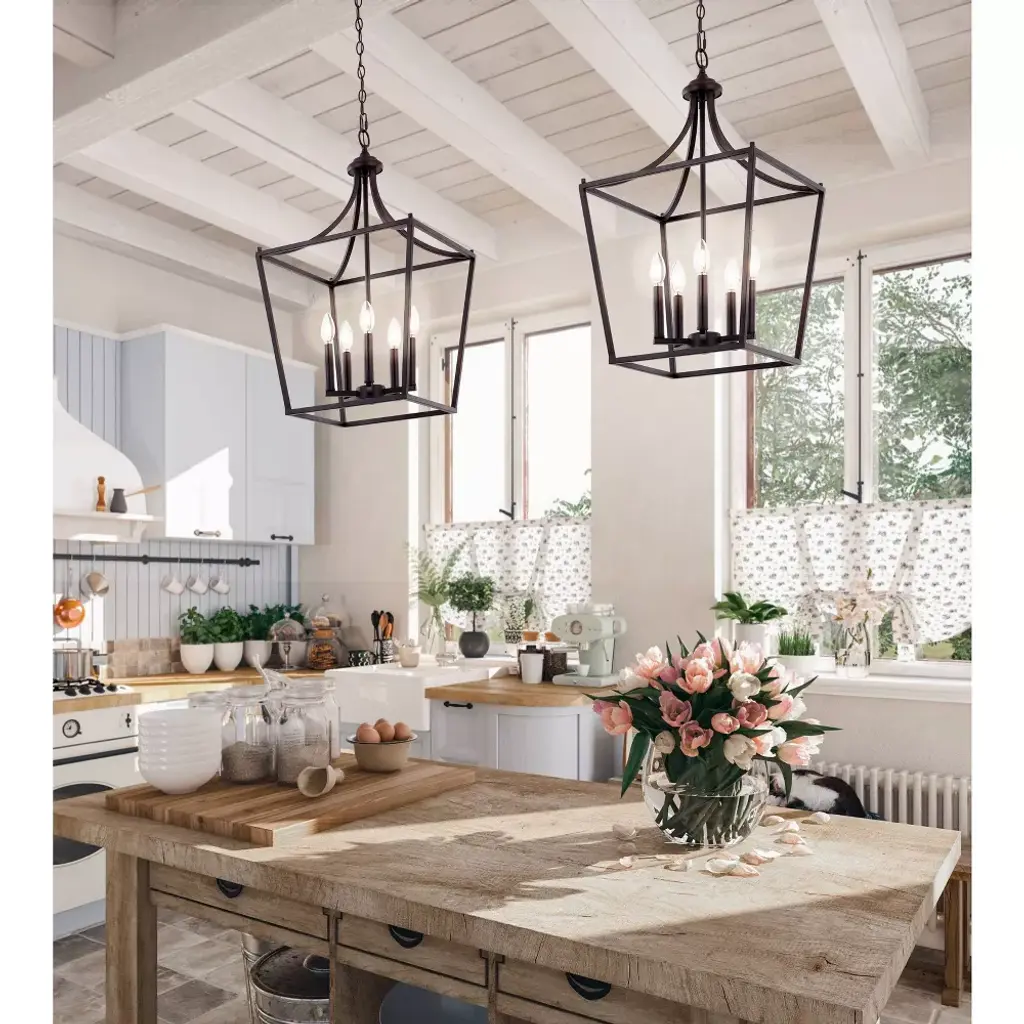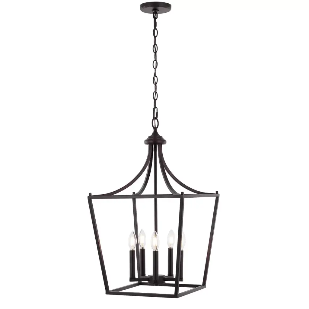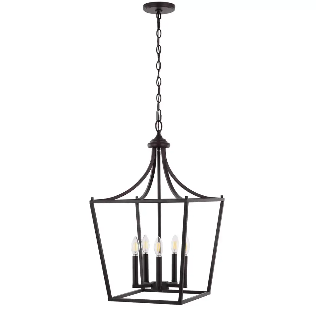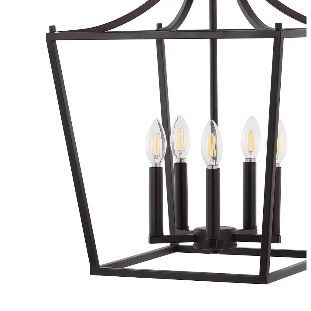Replace outdated kitchen pendants with this classic lantern for an instant makeover, or hang two above a long dining table. An adjustable hanging chain makes this pendant lantern perfect for eight to twelve foot ceilings. Our ceiling fixtures work with LED-compatible dimmers; professional installation is recommended. Eco-friendly 4W LED bulb included. Takes 5 bulbs and compatible with TYPE "B" 40W or CFL 9W or LED 5W. Color Temperature: 2700K. CRI: 80. Before cleaning any lamp shade or fixture, disconnect the power source. Wipe with a soft, dry cloth. Avoid the use of chemicals and household cleaners as they may damage the finish.