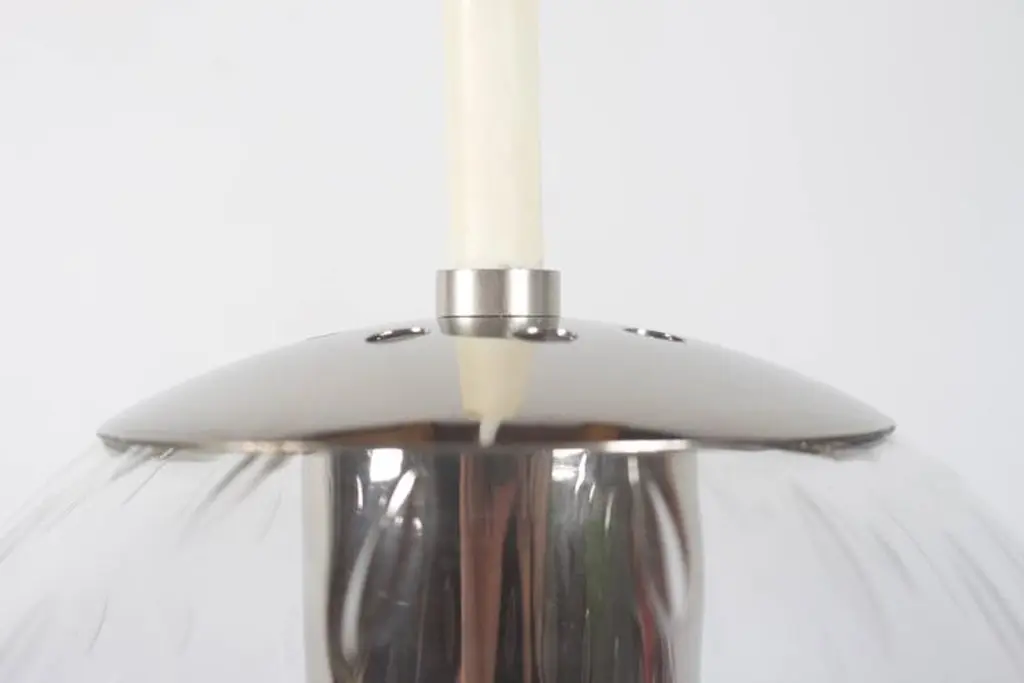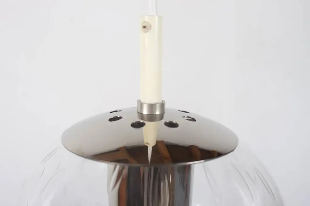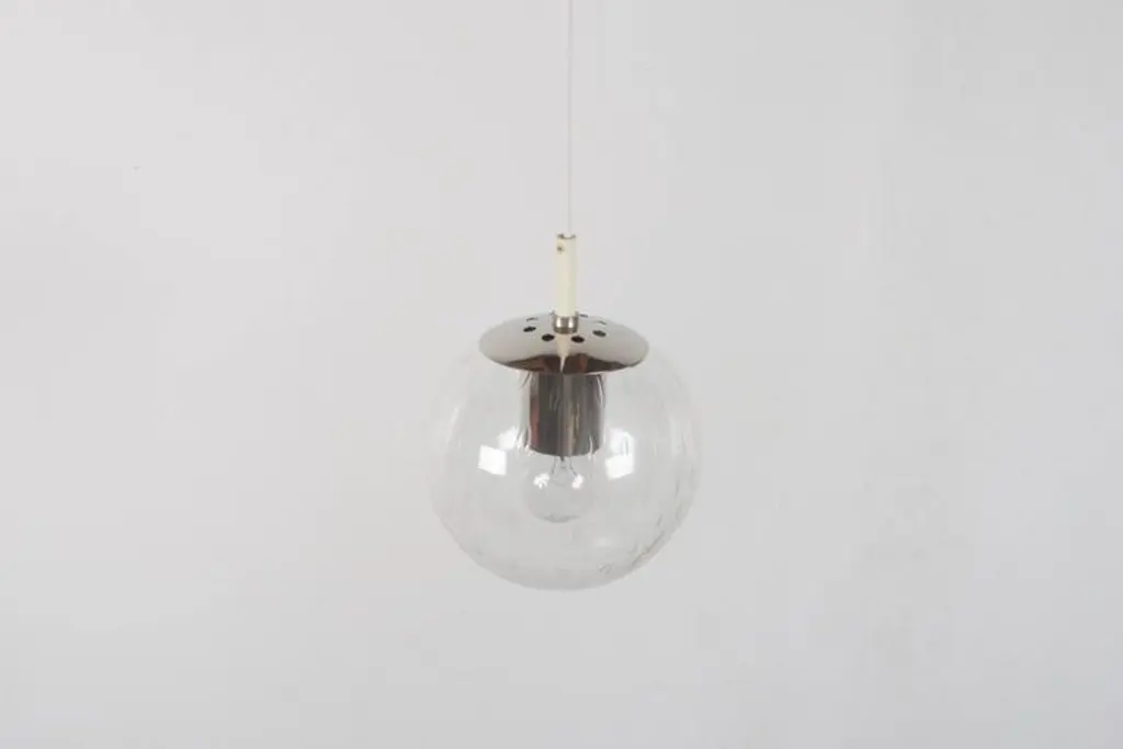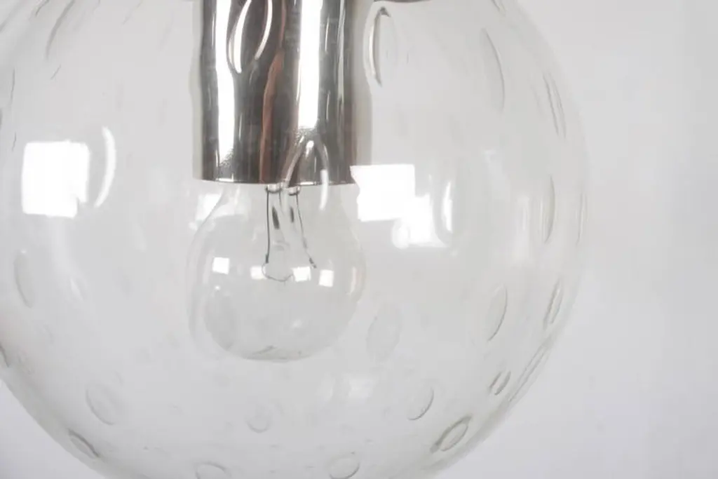 Small ‘Light-drops’ Pendant by RAAK Amsterdam in very good condition.Six available.Handblown glass 18 cm. (7 Inch) globe with a teardrop pattern trapped inside the glass. The pattern in the globes creates a spectaculair effect when lit.Chromed hardware. White cable, suitable for US use.The Amsterdam RAAK lamp factory was founded in the mid 50s by Carel Lock Horn. He was a former Philips employee. The RAAK Amsterdam company was one of the most famous lamp manufacturers in the Netherlands.From now on all large and fragile overseas transports from Cadmium will be handled by the Tramo Group.Tramo is the industry leader in the international distribution of high-end furniture, art and furnishing components.They have the perfect combination of means of transport, passion for beauty and a highly skilled and professional staff that guarantee a work of great quality, fully respecting customers and the high value of the goods handled.We offer a variety of insured shipping services, ask us for the possibilities and competitive pricing.If you have any questions about our shipping options or this item please feel free to contact us.In the style of: Sarfatti, Stilnovo.