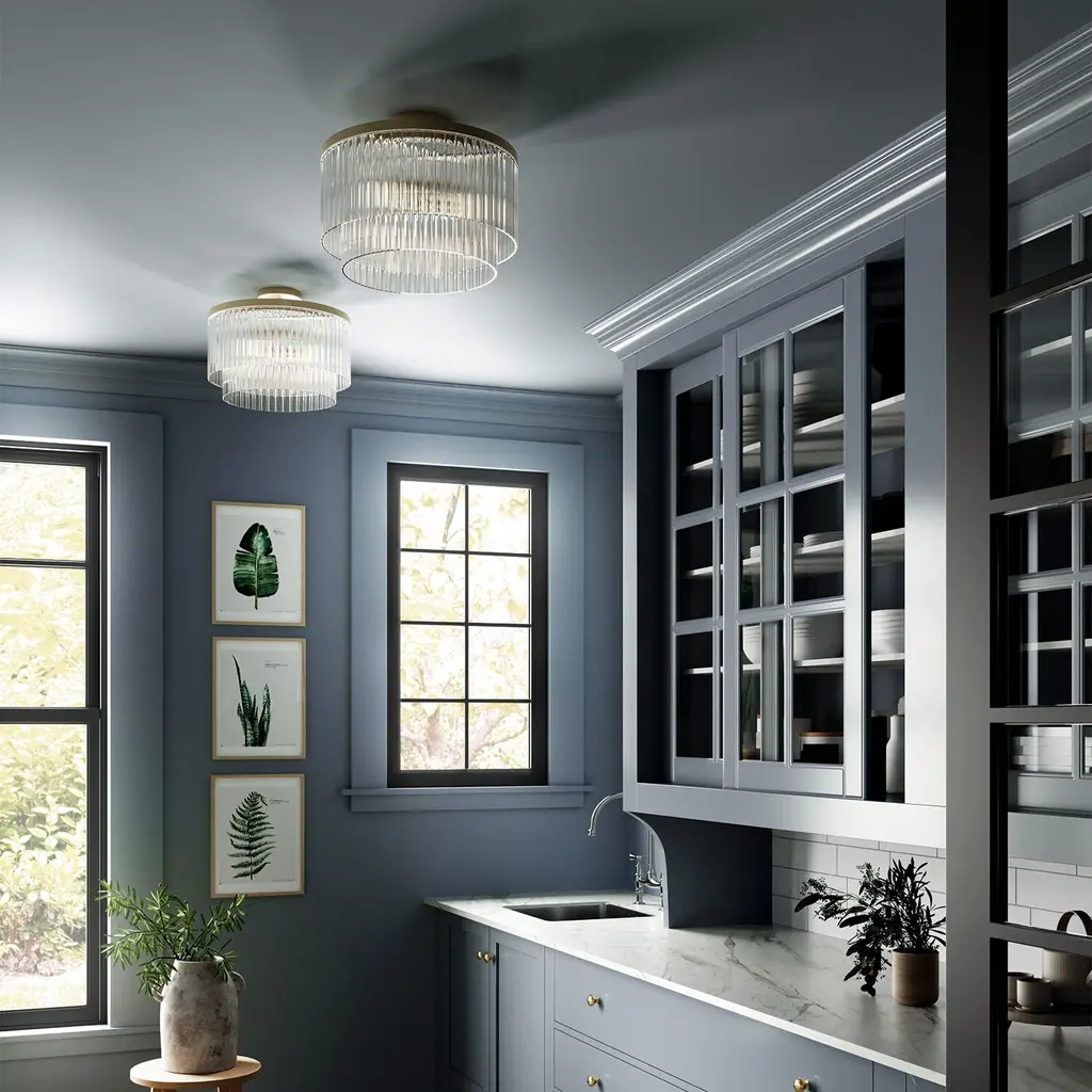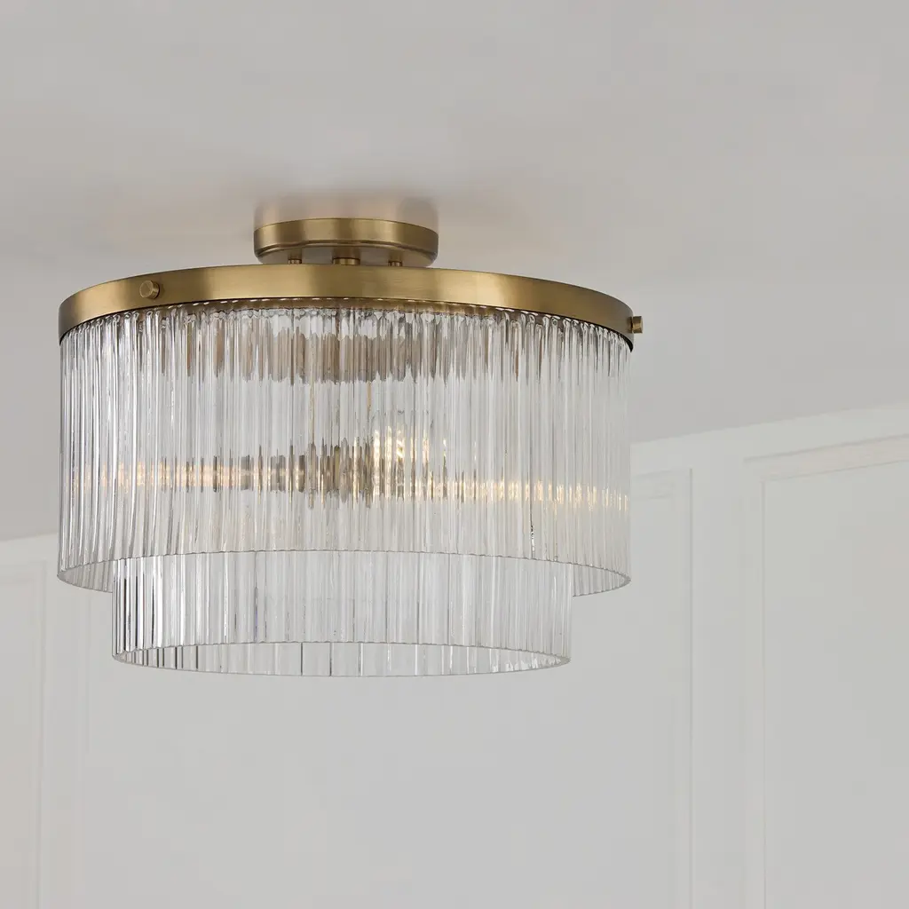 Invite stunning illumination to any space with the Vaughn Dual Mount Pendant or Semi-Flush. Whether hung as a pendant or semi flush, the Beveled Fluted glass creates captivating texture against the tiered cylindrical silhouette, while the Aged Brass finish offers a versatile, timeless aesthetic.