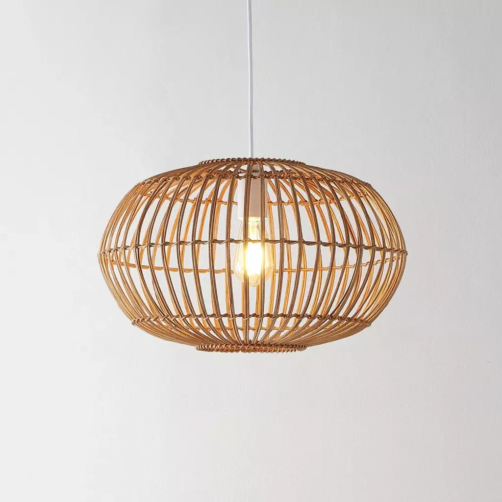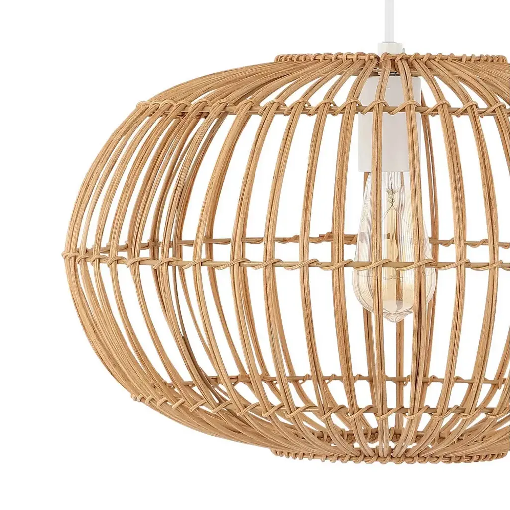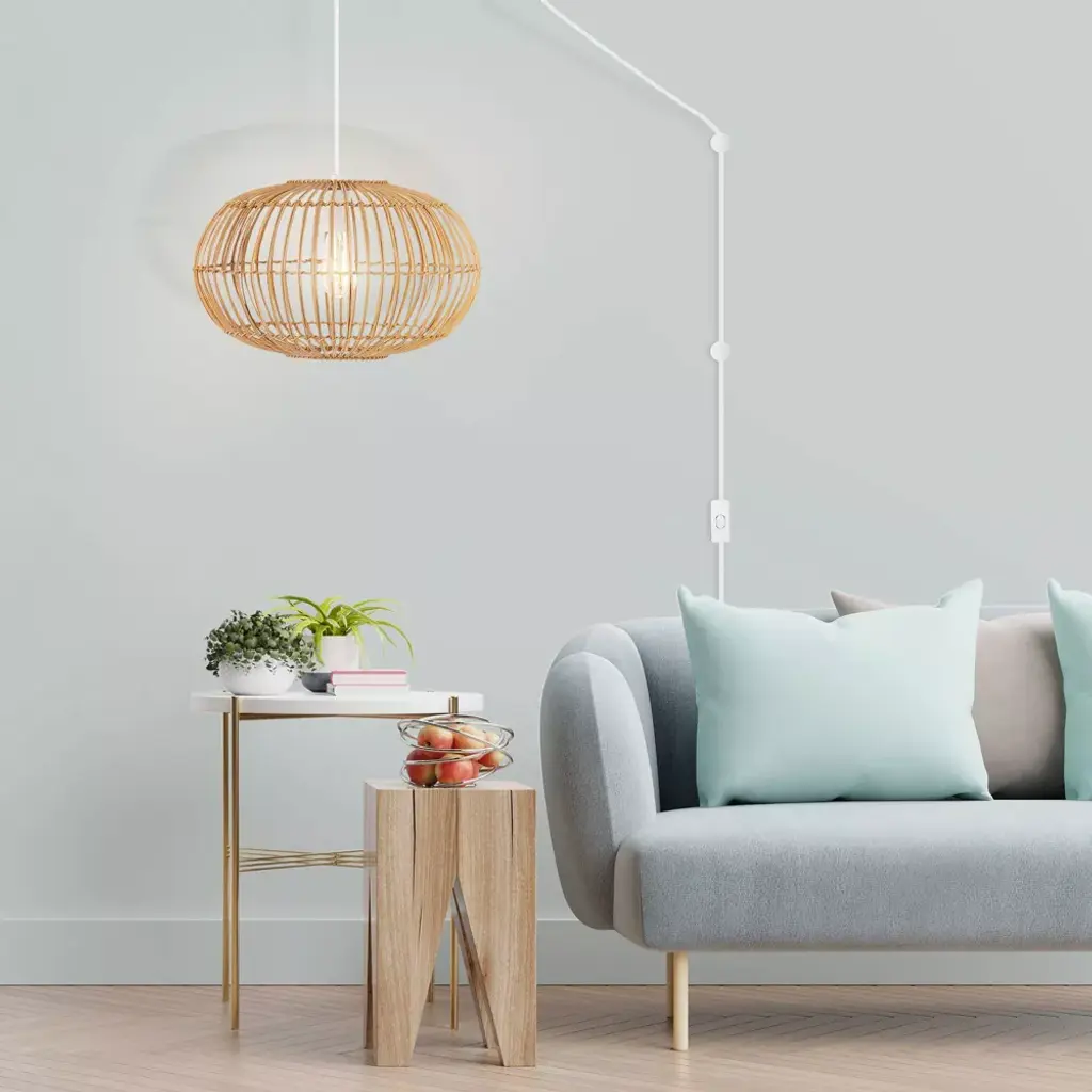 This earthy-toned mid-century style 17" woven rattan swag lamp features a retro spheroid shape. Adjustable-height pendant works best for ceilings up to fourteen-feet high. This rattan swag pendant adds instant Boho-style; has the option of either being plugged in or hardwired. Eco-friendly 4W LED bulb included. Takes 1 bulb and compatible with TYPE "A" 60W or CFL 13W or LED 9WBefore cleaning any lamp shade or fixture, disconnect the power source. Wipe with a soft, dry cloth. Avoid the use of chemicals and household cleaners as they may damage the finish.
