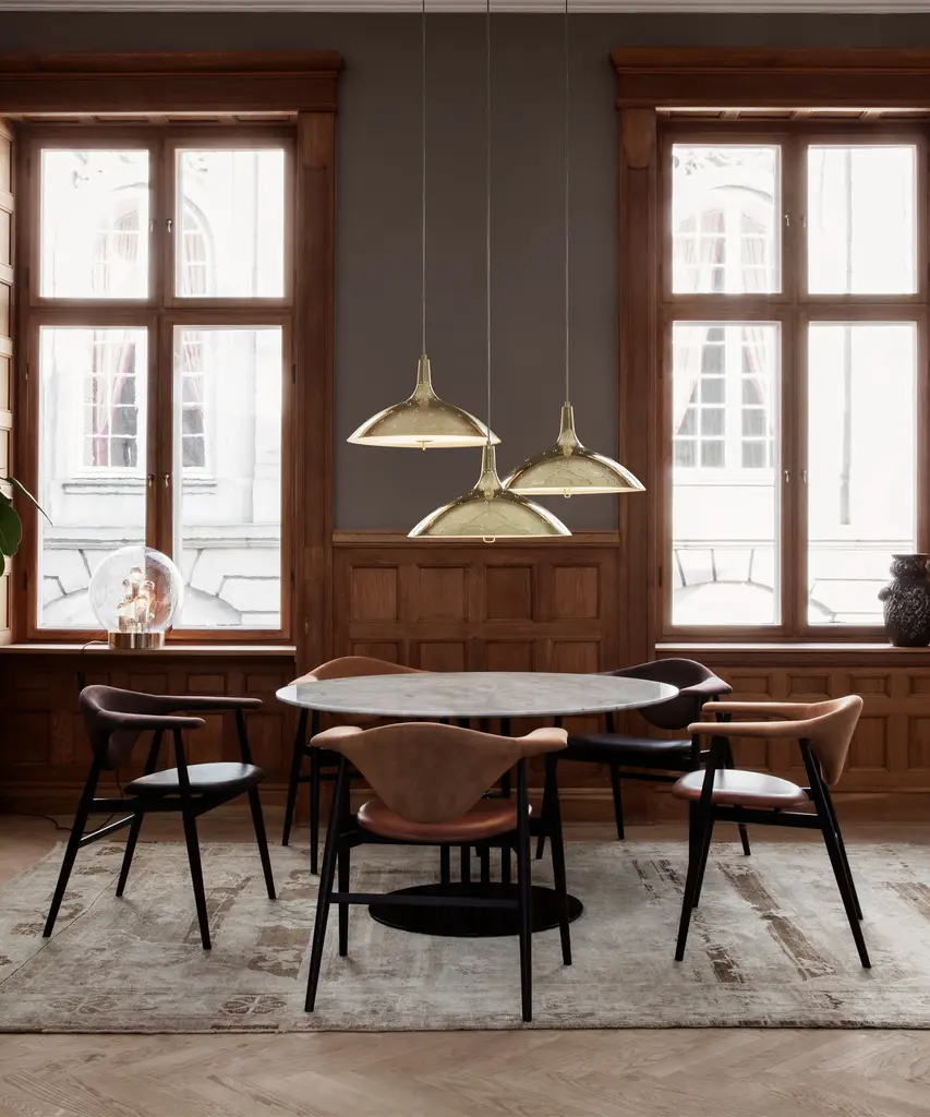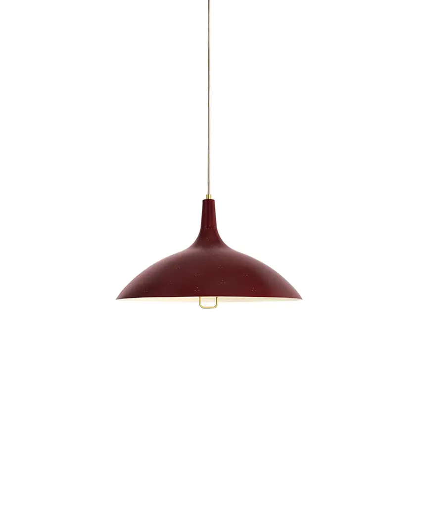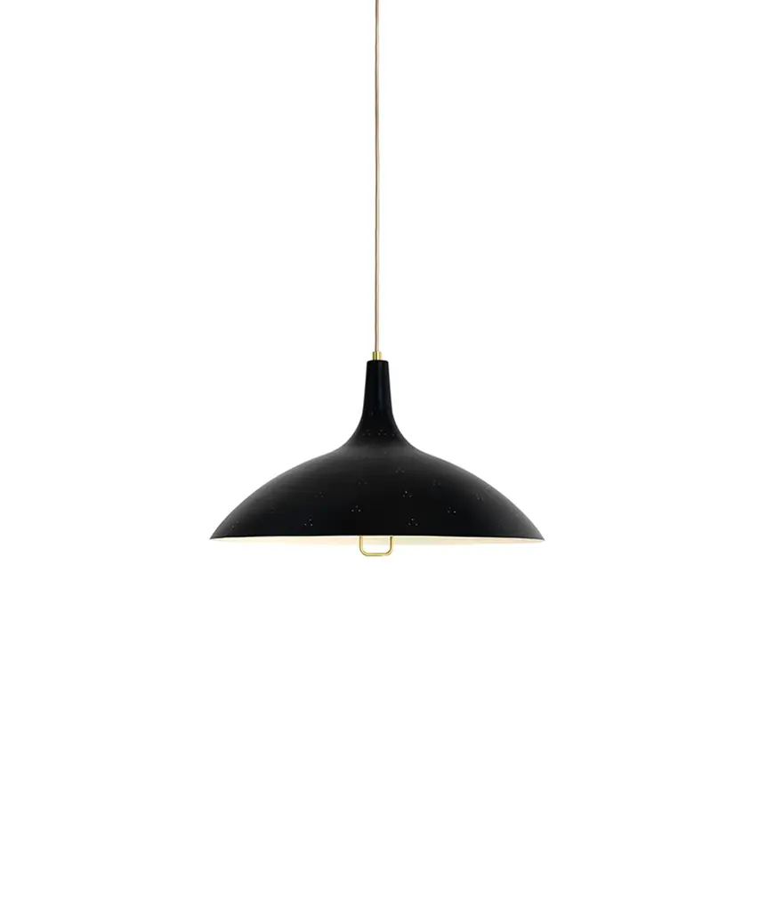 Like many of his best-known designs, the pendant was designed for the Finland House in New York - one of the most ambitious and successful projects of all time to showcase Finnish design. Known for perfecting the techniques of metal finishes, the 1965 Pendant captures Tynell's masterful understanding of brass. Characterized by its triangular perforation pattern - an artistic detail utilized by Tynell in several of his lighting objects - the pendant includes a frosted glass diffuser that softens the light. Produced by Danish design purveyor and publisher, Gubi.