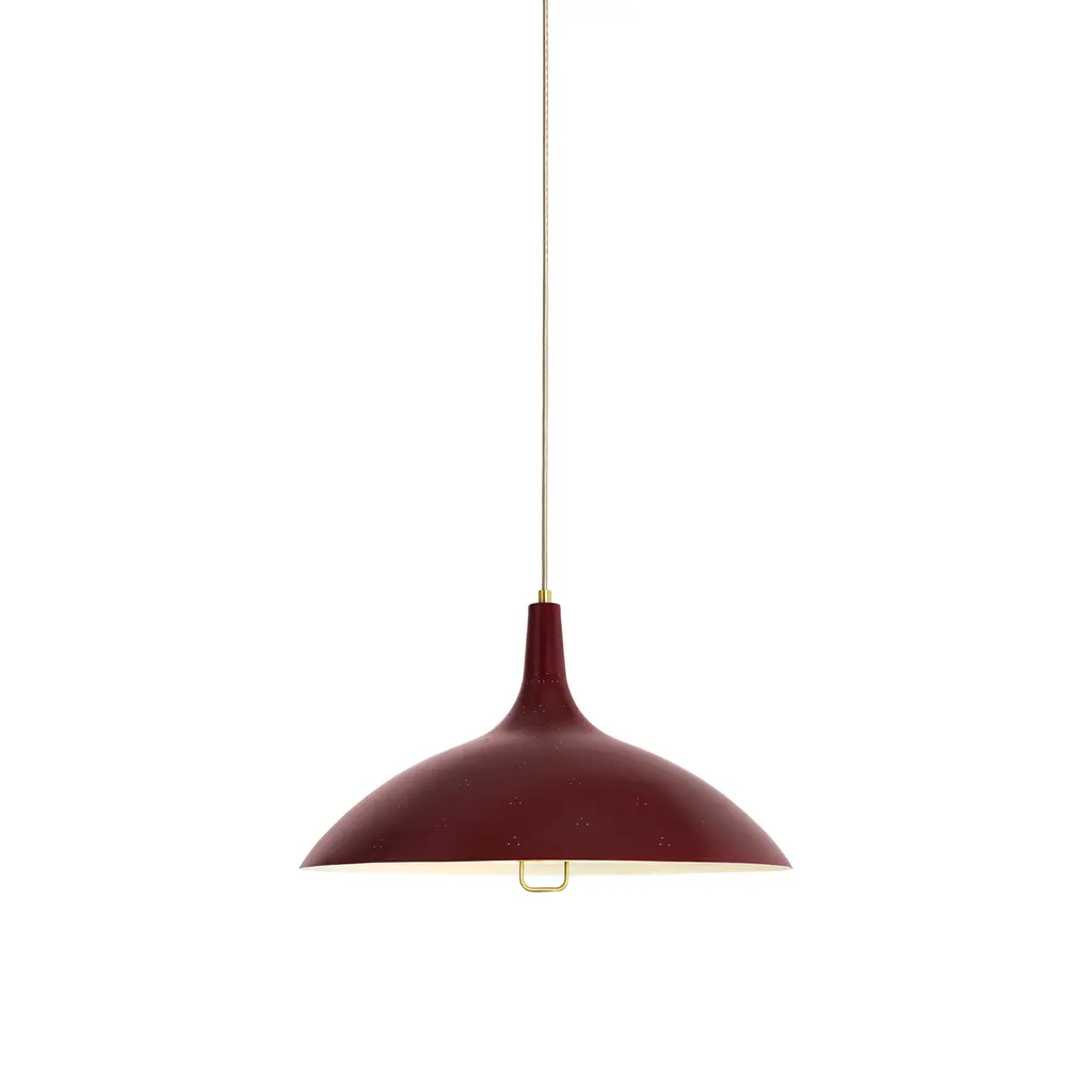 Paavo Tynell’s sleek pendant was designed for the 1947 exhibit Finland House in New York, a pathbreaking view into Finnish design. Known for his distinctive metal treatments, 1965 exemplifies Tynell’s graceful way with brass, especially in the signature triangular perforated pattern. The fixture’s frosted-glass diffuser softens the light, spreading a warm and glare-free illumination.
