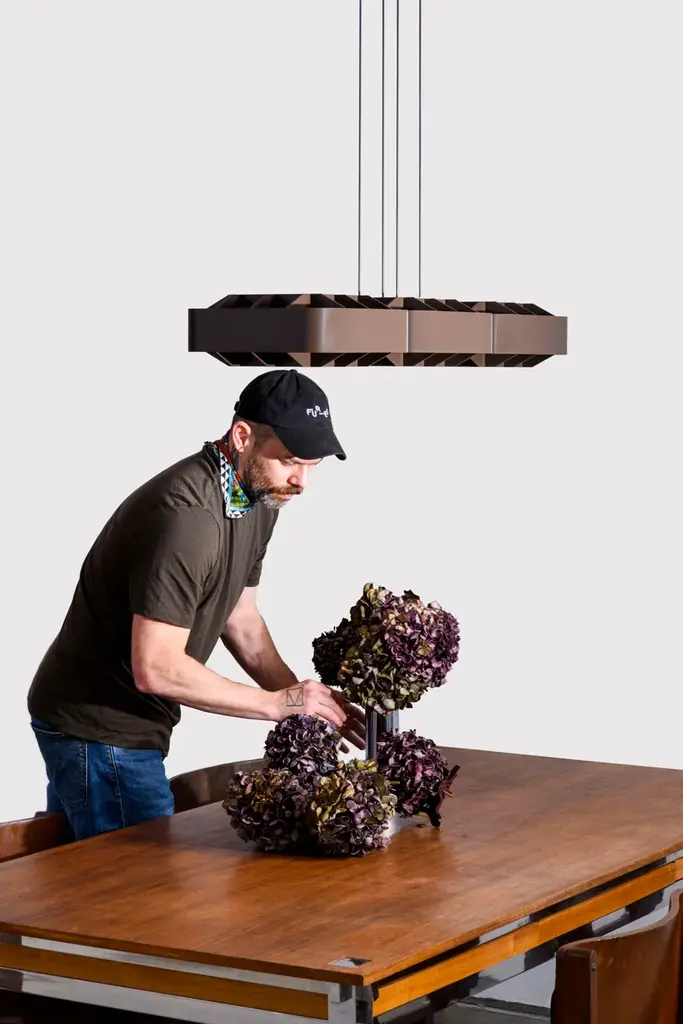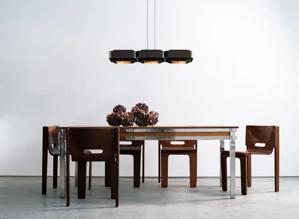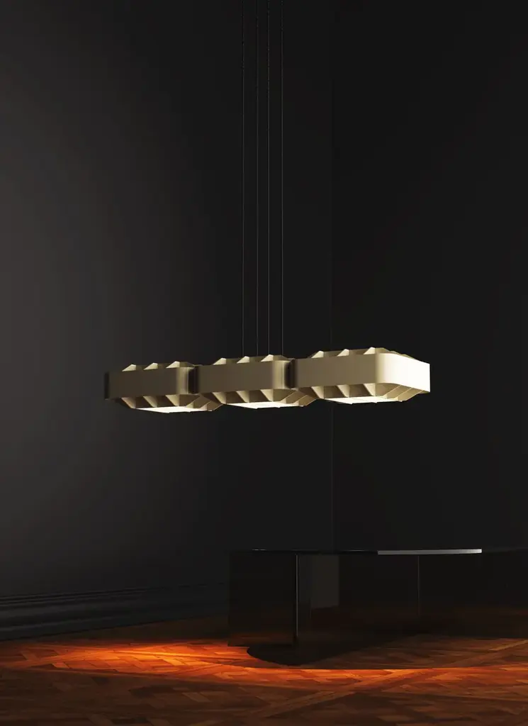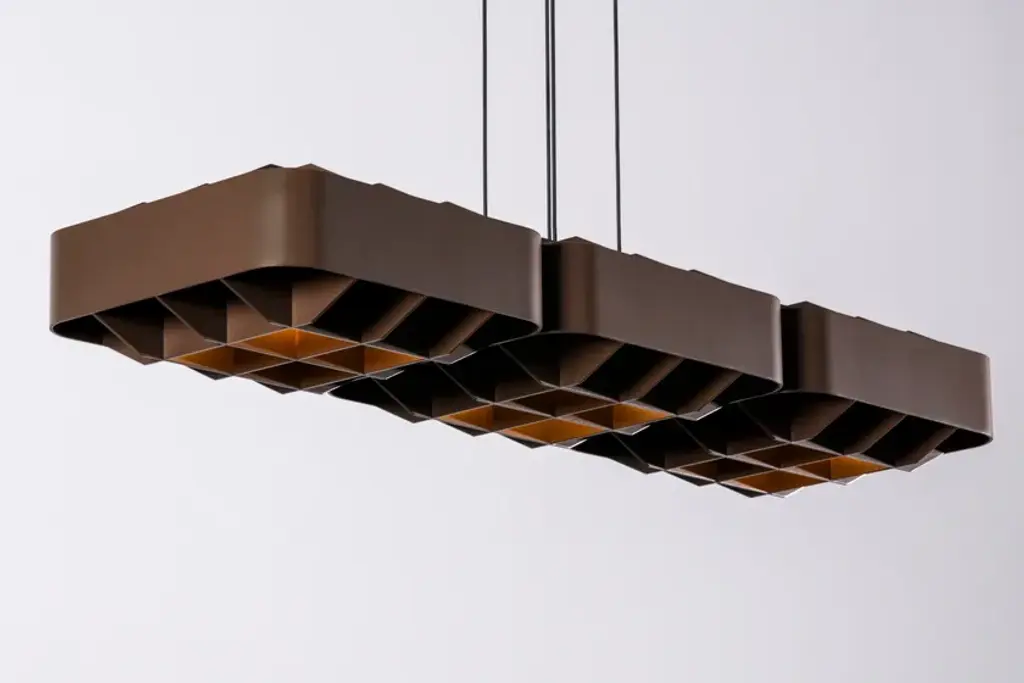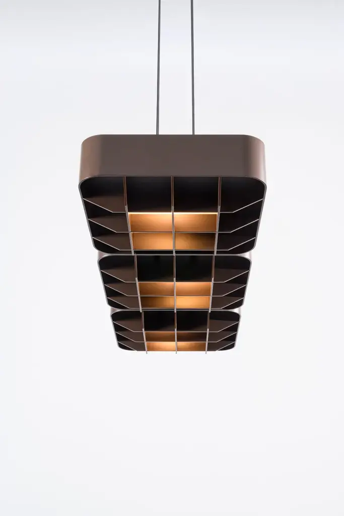 1979 TRIPLE is a pendant lamp made of aluminum.It is the result of a collaboration with Will Choui, a Montreal designer known for his approach influenced by brutalist aesthetics and the simplicity of form.Choui's vision of a balance between functionality and sculptural form contributed to the creation of a timeless and robust piece, inspired by architecture and urbanism. The result is a lighting fixture whose subtle simplicity echoes values of solidity and minimalism.A square aluminum module, both structured and refined, diffuses indirect light through a grid, blending shadow and brilliance.1979 is a pendant lamp collection that captures the pure essence of an era through light and material.Inspired by Montréal’s late 1970s brutalist and modernist architecture, these lamps balance function and form.1979 reduces light to its purest form, where nostalgia and innovation meet to revive the beauty of a bygone era.The 1979 collection by Darmes and Will Choui captures the raw essence of an era through light and material. Inspired by Montréal's brutalist and modernist architecture of the late 1970s, these lamps combine functionality and form.A square aluminium module, both structured and refined, diffuses indirect light through a grid, combining shadow and brilliance. Choui reinterprets brutalist solidity with a sense of balance, transforming the lamp into an artifact of memory.Stripped of all excess, 1979 reduces light to its purest form, where nostalgia and innovation meet to rediscover the beauty of a past era.Several materials and finishes are available: matt bronze, matt ivory, and matt black.