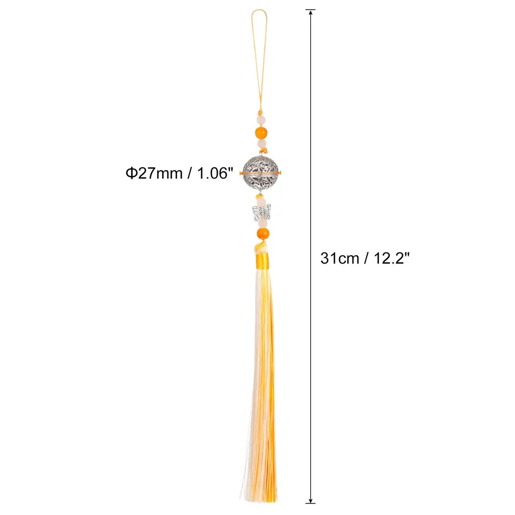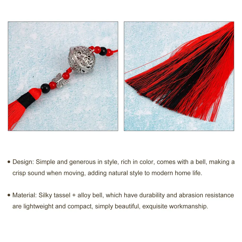 Description:Material: Polyester tassel + alloy bell + glass, which have durability and abrasion resistance, are lightweight and compact, simply beautiful, exquisite workmanship.Design: Simple and generous in style, rich in color, comes with a bell, making a crisp sound when moving, adding natural style to modern home life.Use: It can be used as curtain decor for a study, a bedroom, a living room, a dining room or a locker room, etc. Pendants for bags, Chinese folding fans, clothing hang decorationNice Gift: Perfect for home decor, bright and stylish, can be given as a housewarming gift to friends, adding a warm atmosphere to the new house.Specification:Material: Polyester Tassel + Alloy Bell + GlassTotal Length:31cm/12.2"Bell Dia: 27mm/1.06"Color: Red BlackPackage Contents: 1Pcs x Bell Pendants