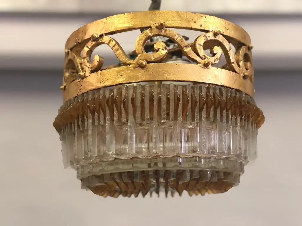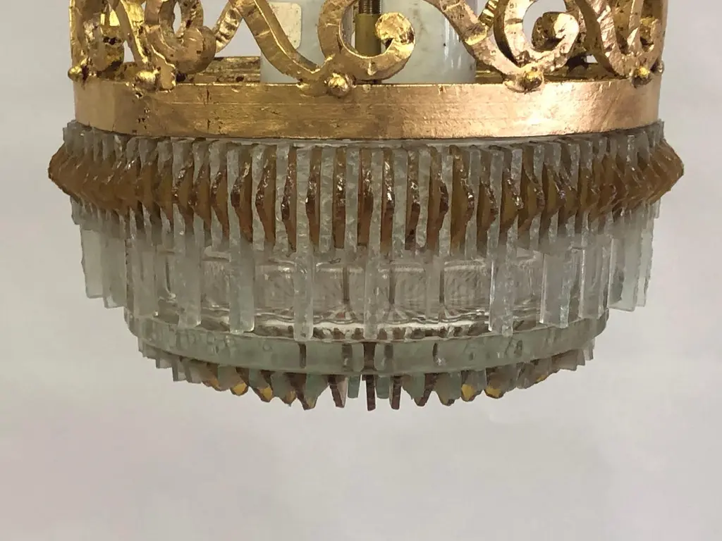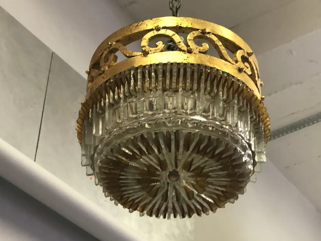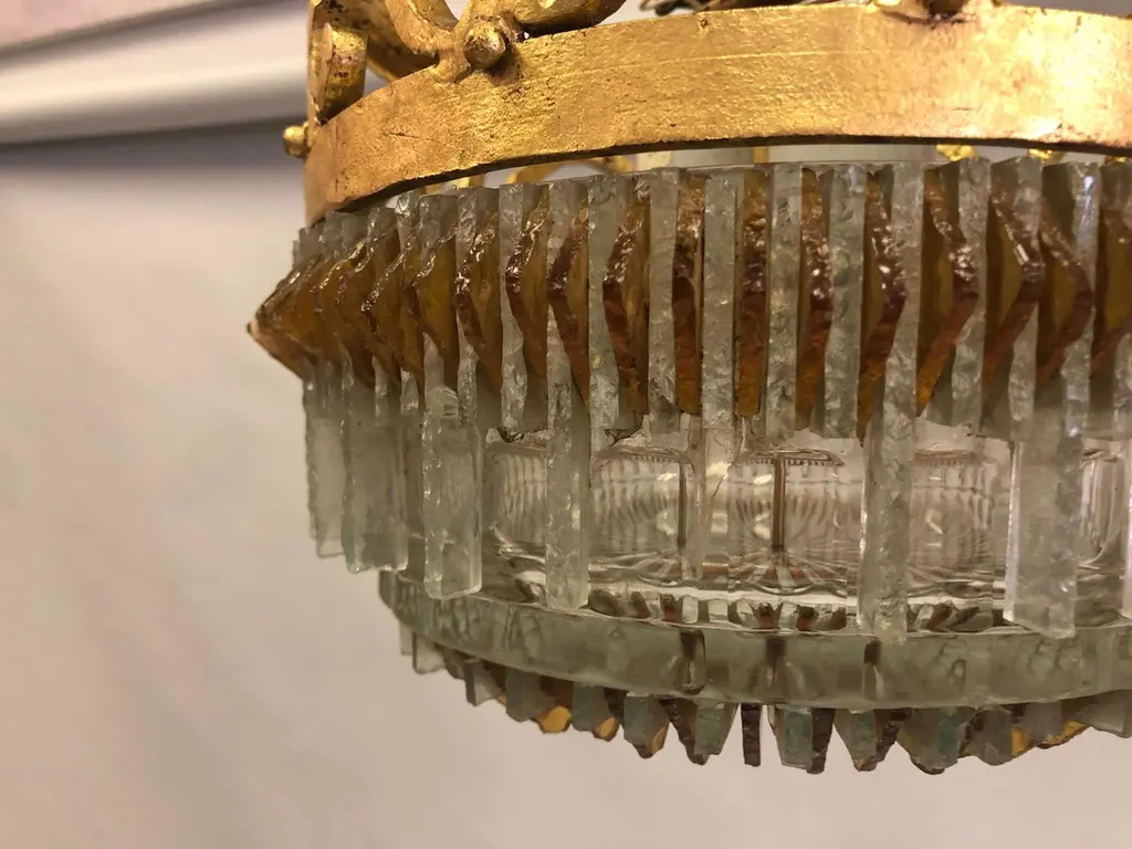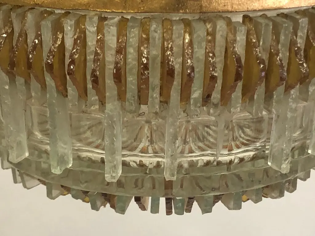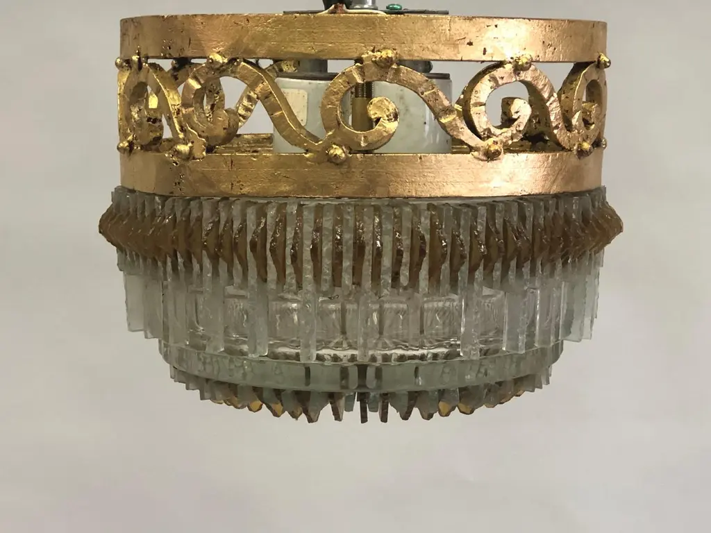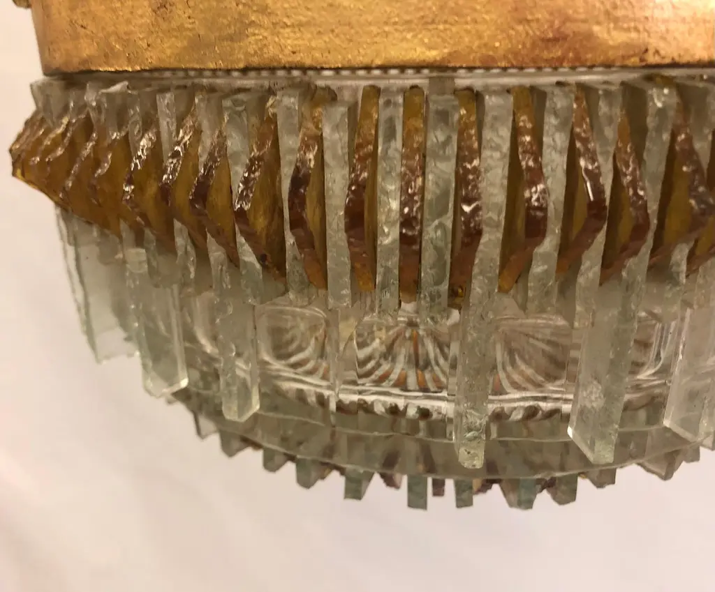 2 Italian Midcentury Gilt Iron & Chiseled Murano Glass Pendants Or Flush Mounts
