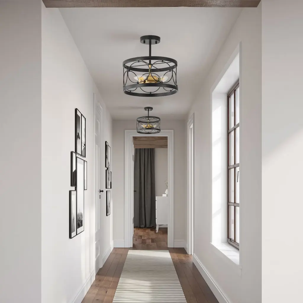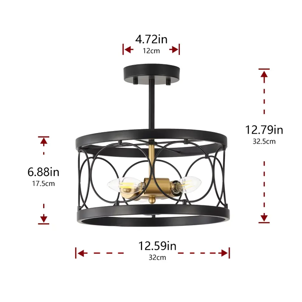 2-light Black Pendant Light , Industrial Metal Fixture With Gold Accent For Kitchen Or Hallway