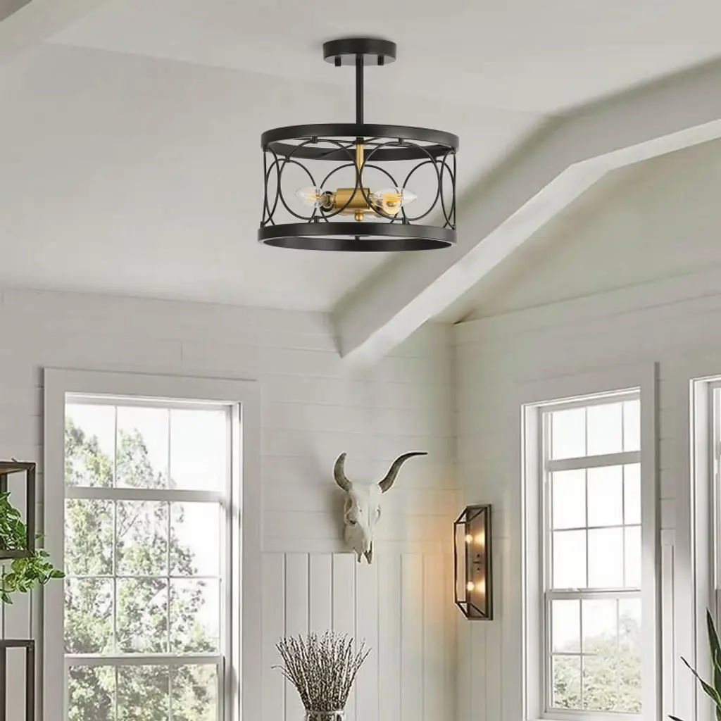 Black and gold 3-light pendant light with matte black iron frame and gold center. ETL certified, supports E12 base bulbs (max 40W). Features durable 18AWG 1332 Teflon wires and copper ground line. Ideal for hallways, bedrooms, kitchens, or farmhouse and industrial-style interiors.