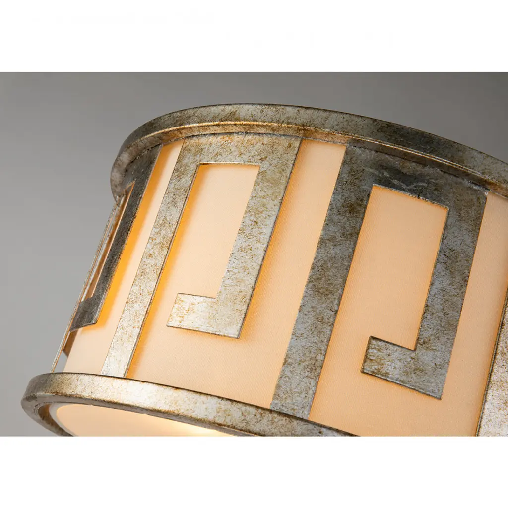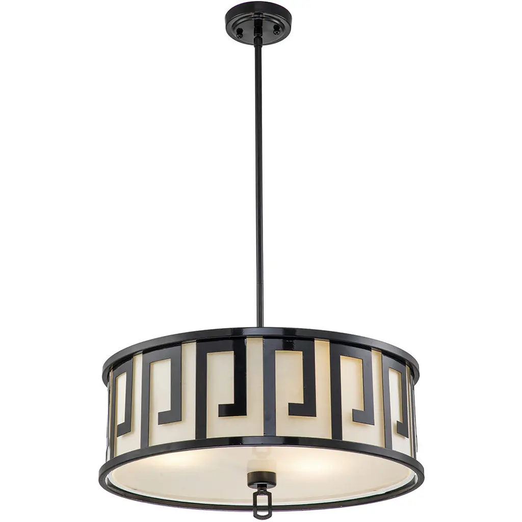 Our Flambeau inspired island pendant is designed with a classic Greek key like metal outer drum with an ivory linen inner shade made into a hanging shaded adjustable pendant creating a striking focal point. In the latest neutral tones of silver and cream, it is the perfect addition to your bedroom, kitchen, or over your bar. We finished this pendant off with a white acrylic diffuser for soft light without the glare. Our Medium 15 inch diameter Lemuria Pendant is shipped with extra stems for adjustable length, and can be installed as a semi-flush mount fixture with a minimum height of 12.5 Inches for use in hallways and closets.